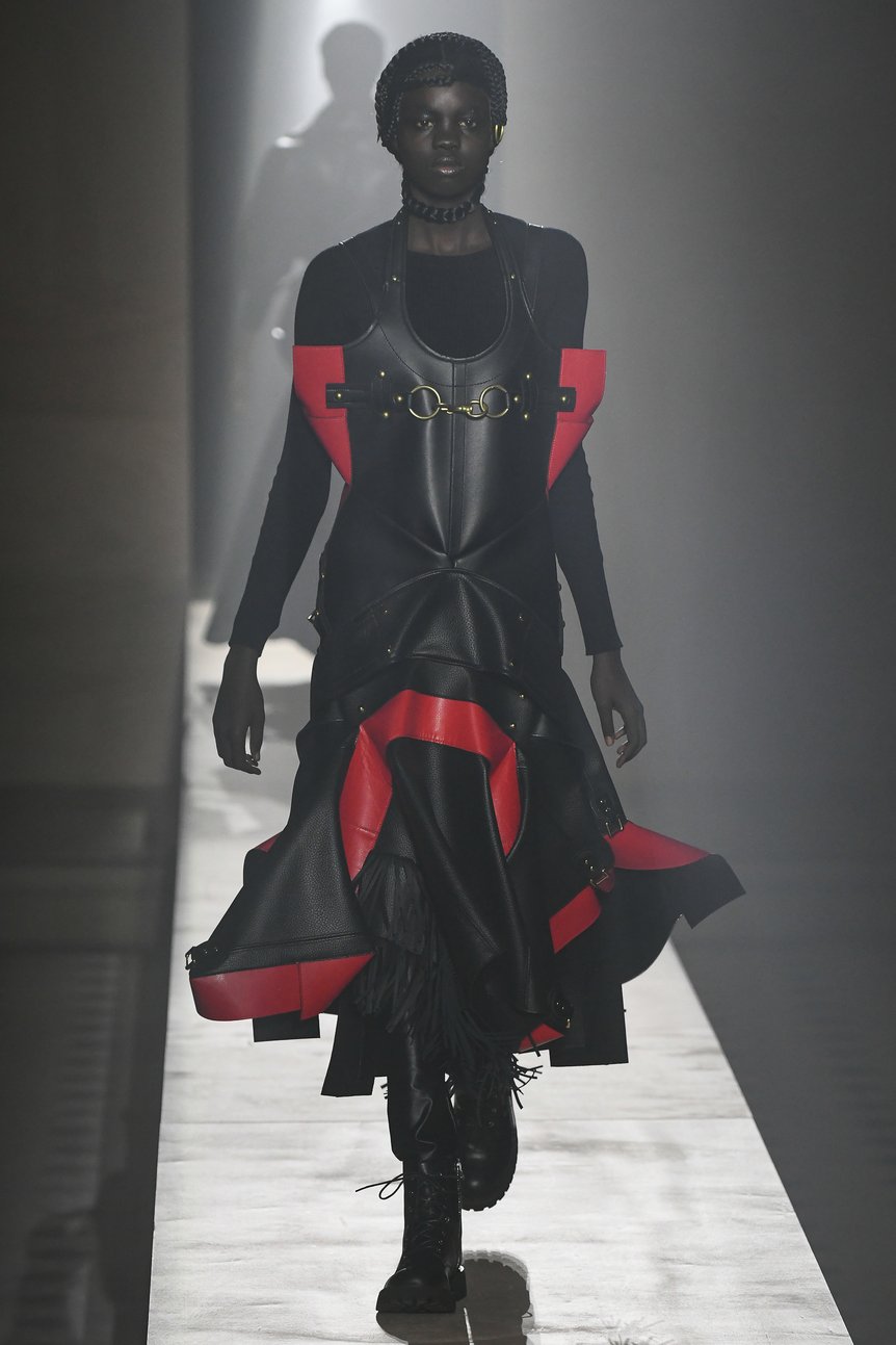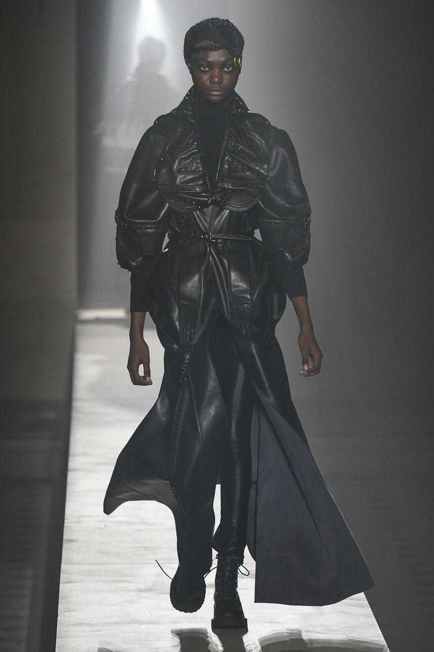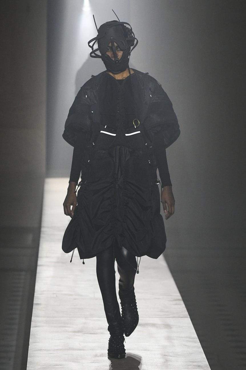オープニングは、オールブラックの6人のモデルが登場。全身をプロテクトするロングコートをまとい、まるで鎧を身につけた戦士のような佇まい。頭部をベールやゴールドチェーンで覆った姿は、どこかエキゾチックなムードを漂わせる。