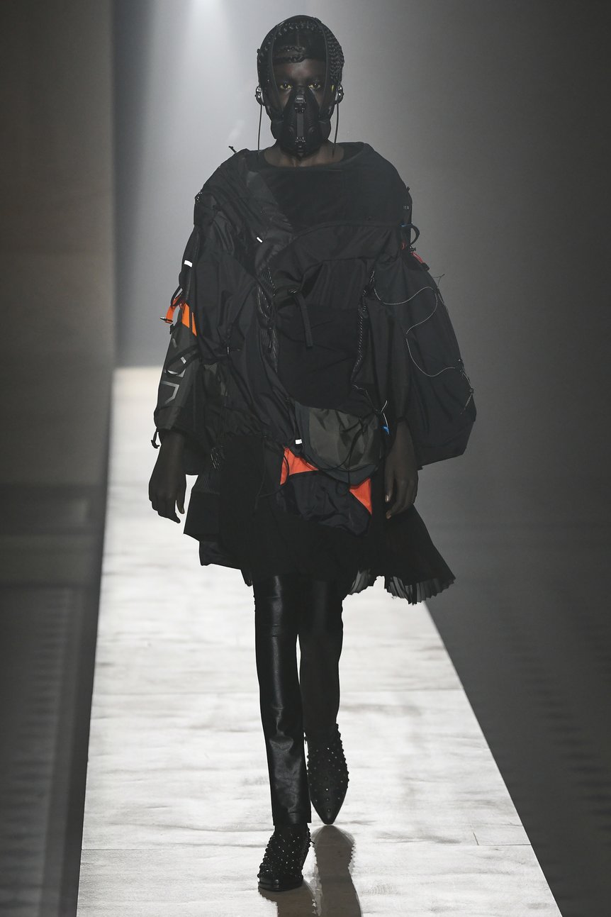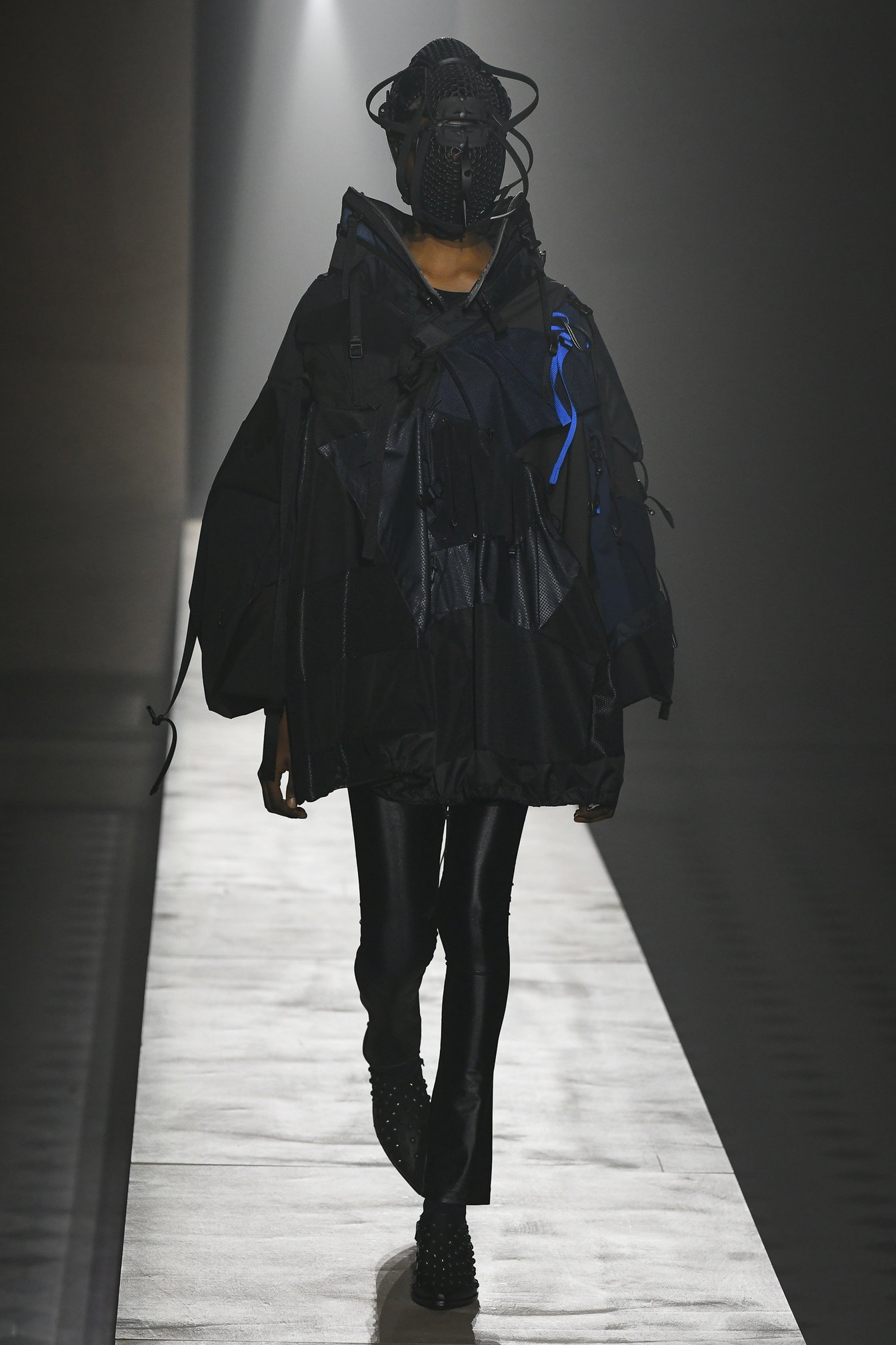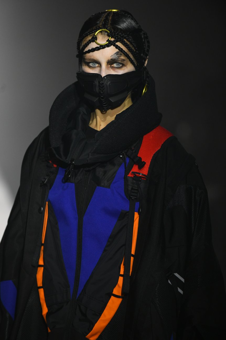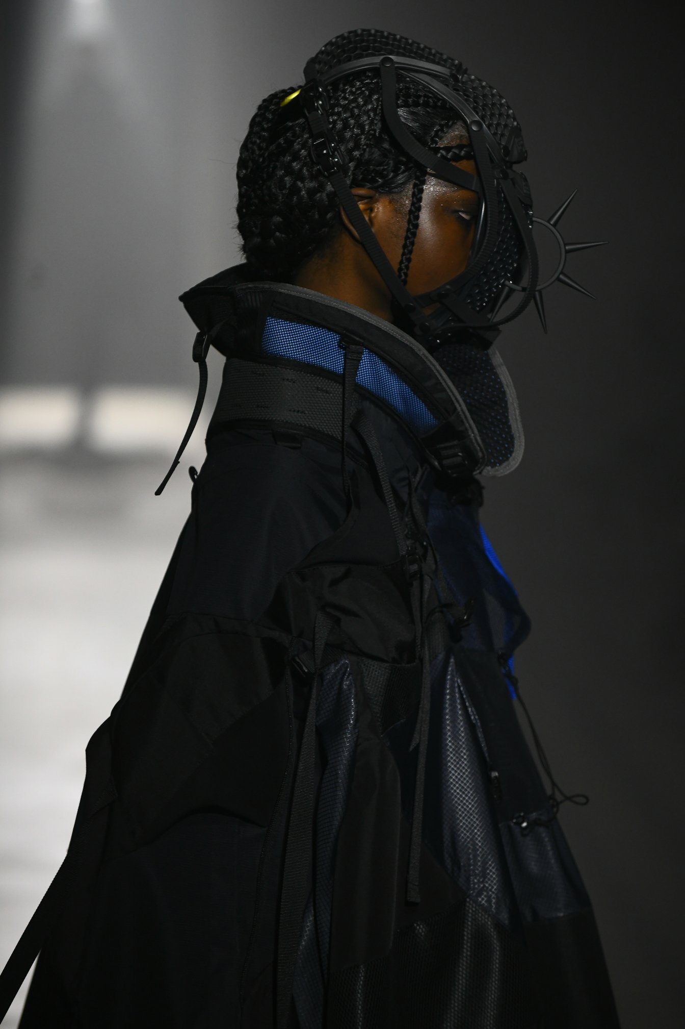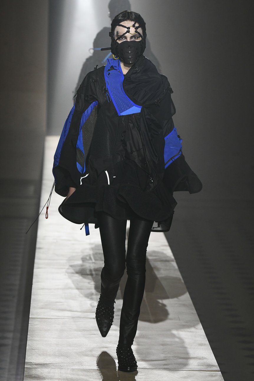前半はテクニカルな素材をアシンメトリーのパターンで構築し、ドローコードやテープでディテールを飾るなど、スポーツやアウトドアの要素を注入。ブラックをベースに鮮やかなブルーやオレンジを差し込んだ。
