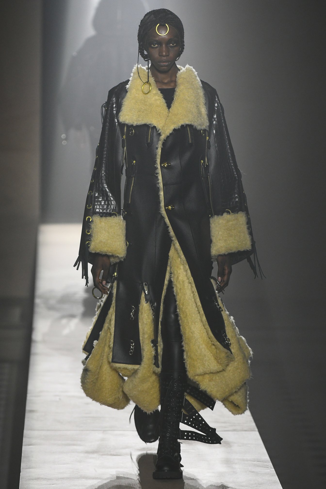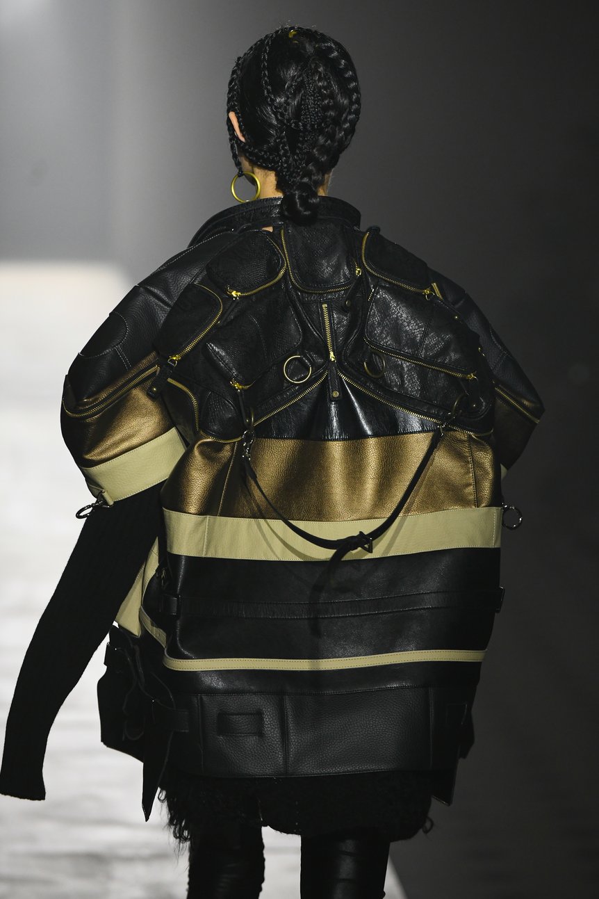 中盤は、ライダースジャケットをリメイクしたような作り。フェイクレザーを複雑に繋ぎ合わせ立体的なシルエットに仕立てた。ファスナーを多用しバッグやウォレットが融合したディテール、スタッズやフリンジといった装飾がパンク・ロックのテイストでまとめられた。