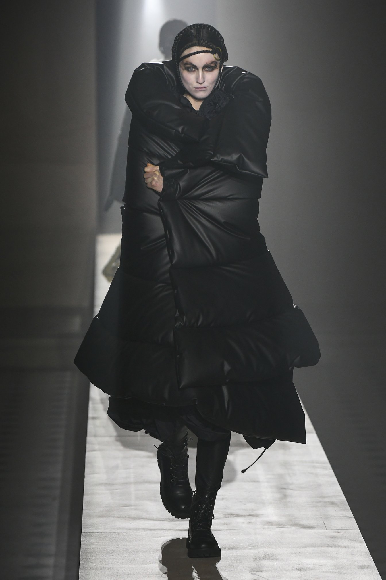 終盤に登場したボリュームのあるムートンやダウンのドレスコートは迫力のシルエット。足元はタフなブーツで仕上げ、辺境の地を行く旅人の力強い装いがインパクトを与えた。