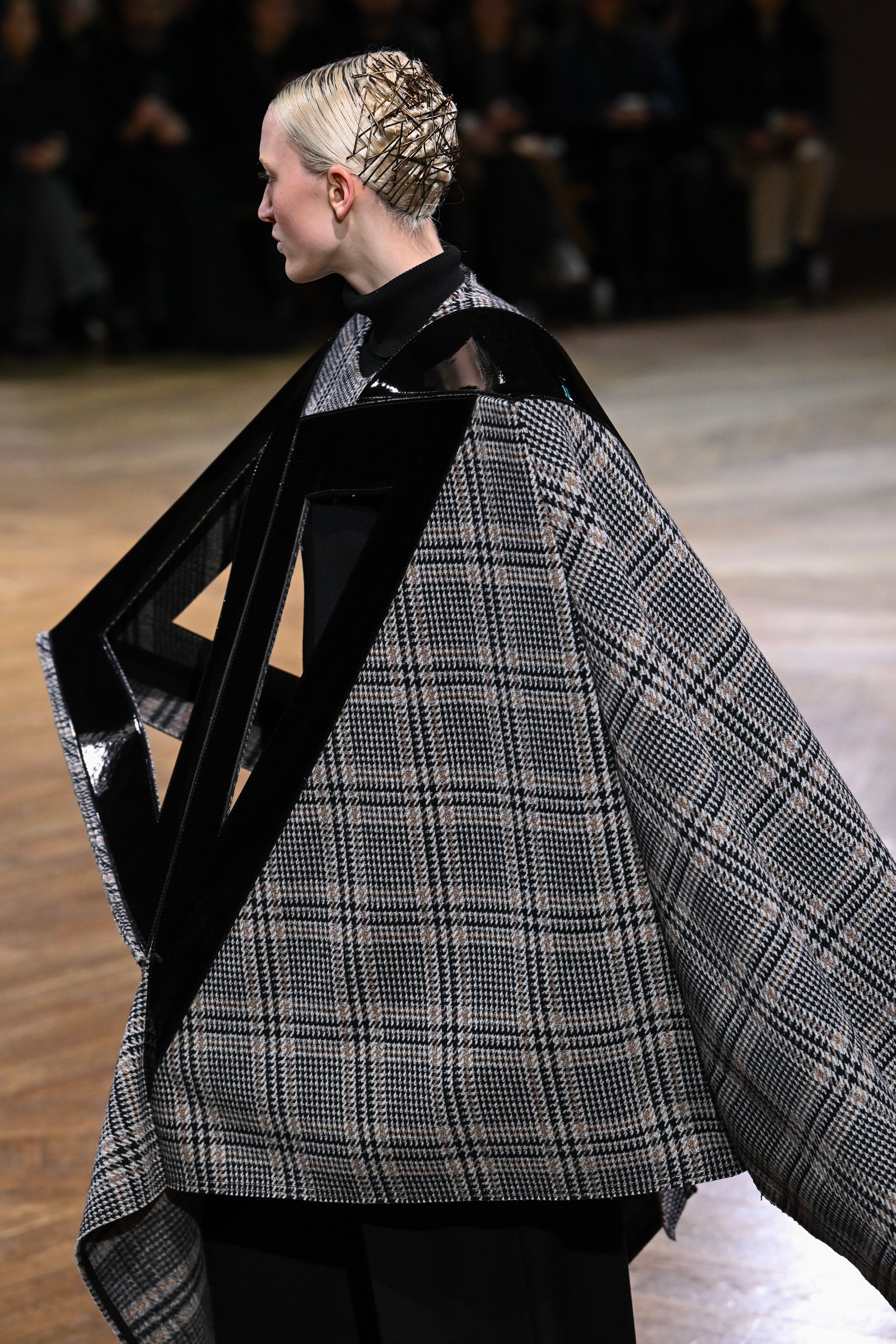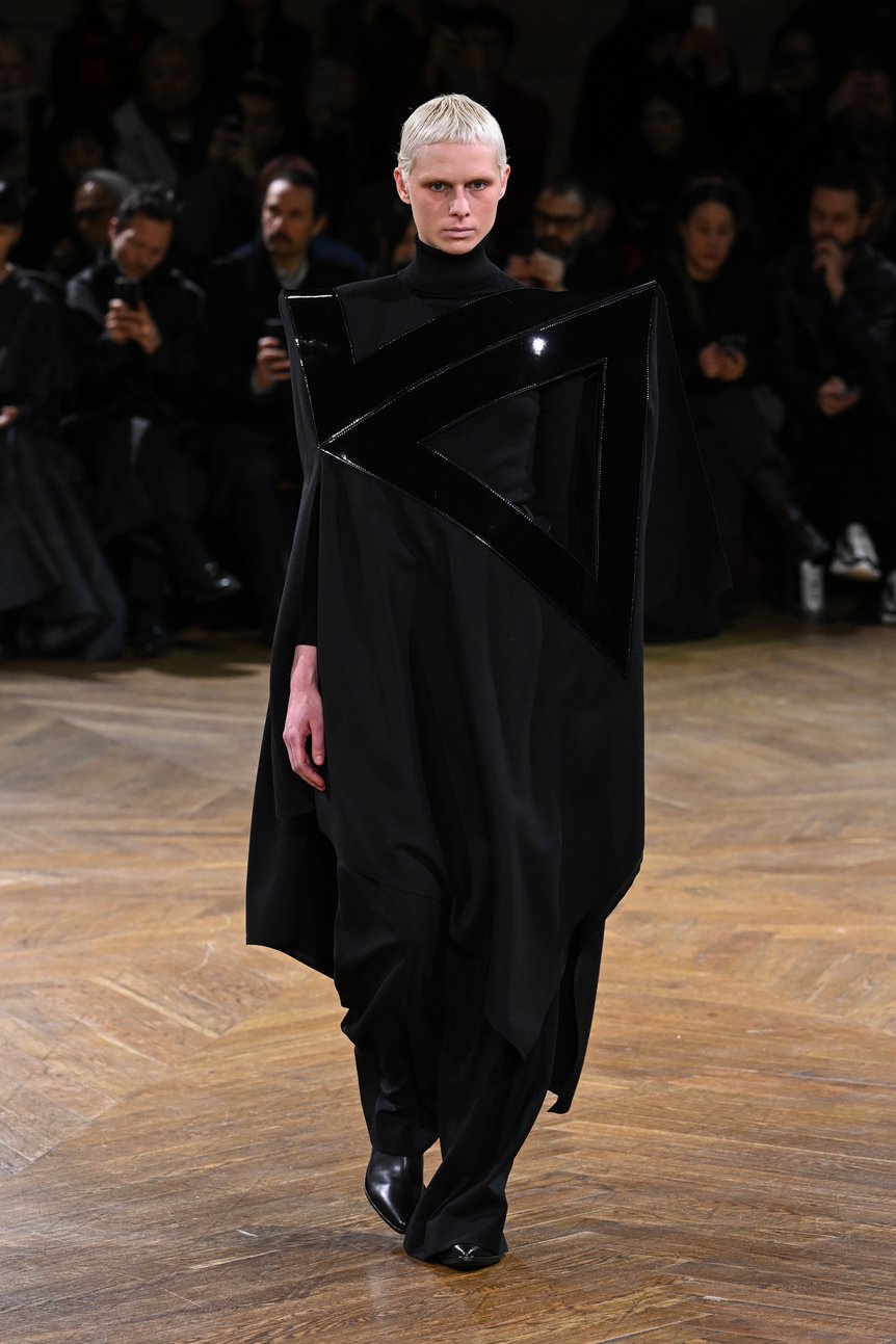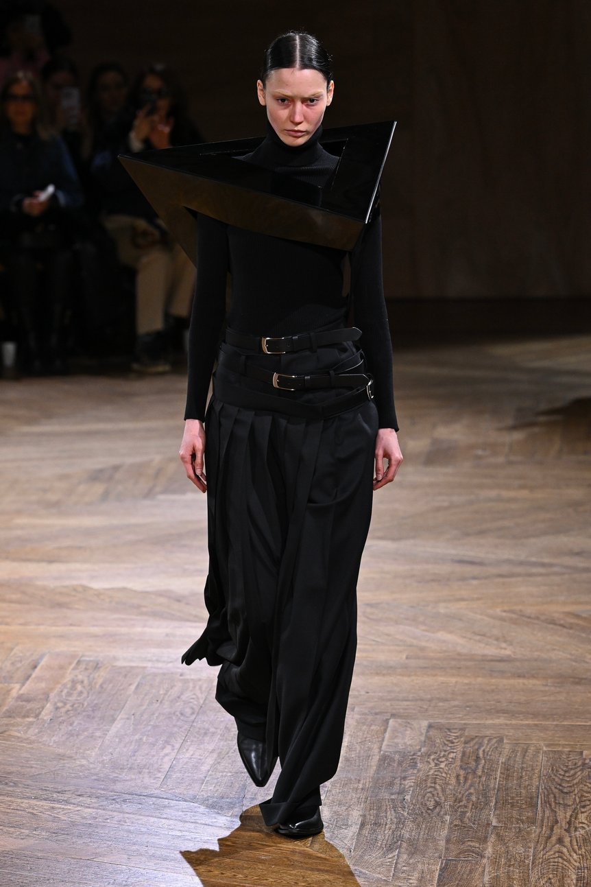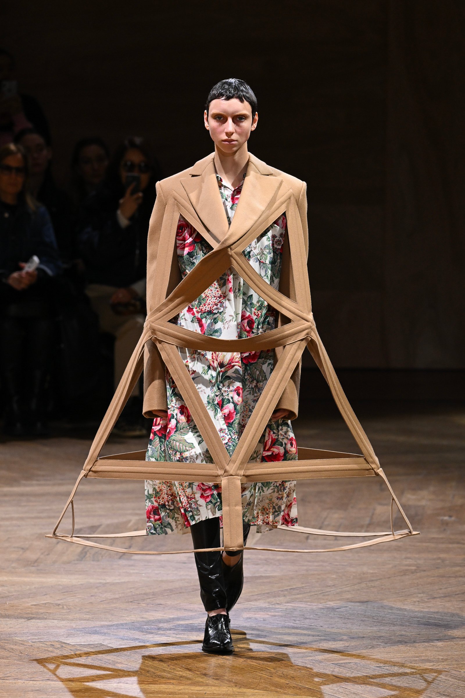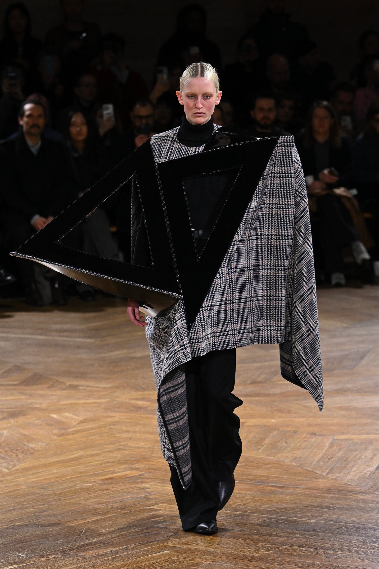 不気味なピアノの音色とともに登場したファーストルックは、ピラミッドのような四面体と三角形がボディに取り付けられていた。おそらく、それは“パブリックアート”の象徴で、その内側にモデルが入り込んでいるという構造だ(パブリックアートは多くの場合、触ったり中に入ったりできる彫刻である)。あるいは、人体はアートを支える幹とも言えるかもしれない。アウターの内側は、黒いタートルネックのニットウェアにワイドなスラックスというプレーンでアノニマスな装いになっているのは、何を意味しているのだろうか。
