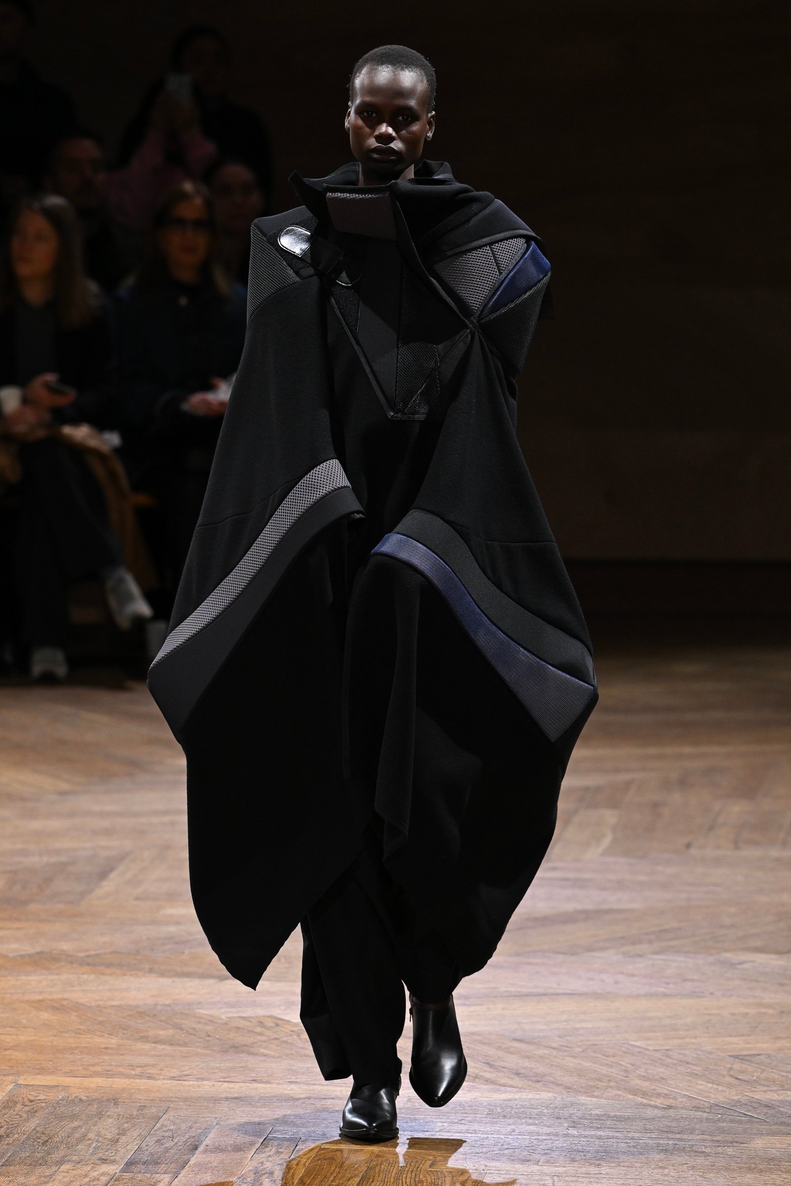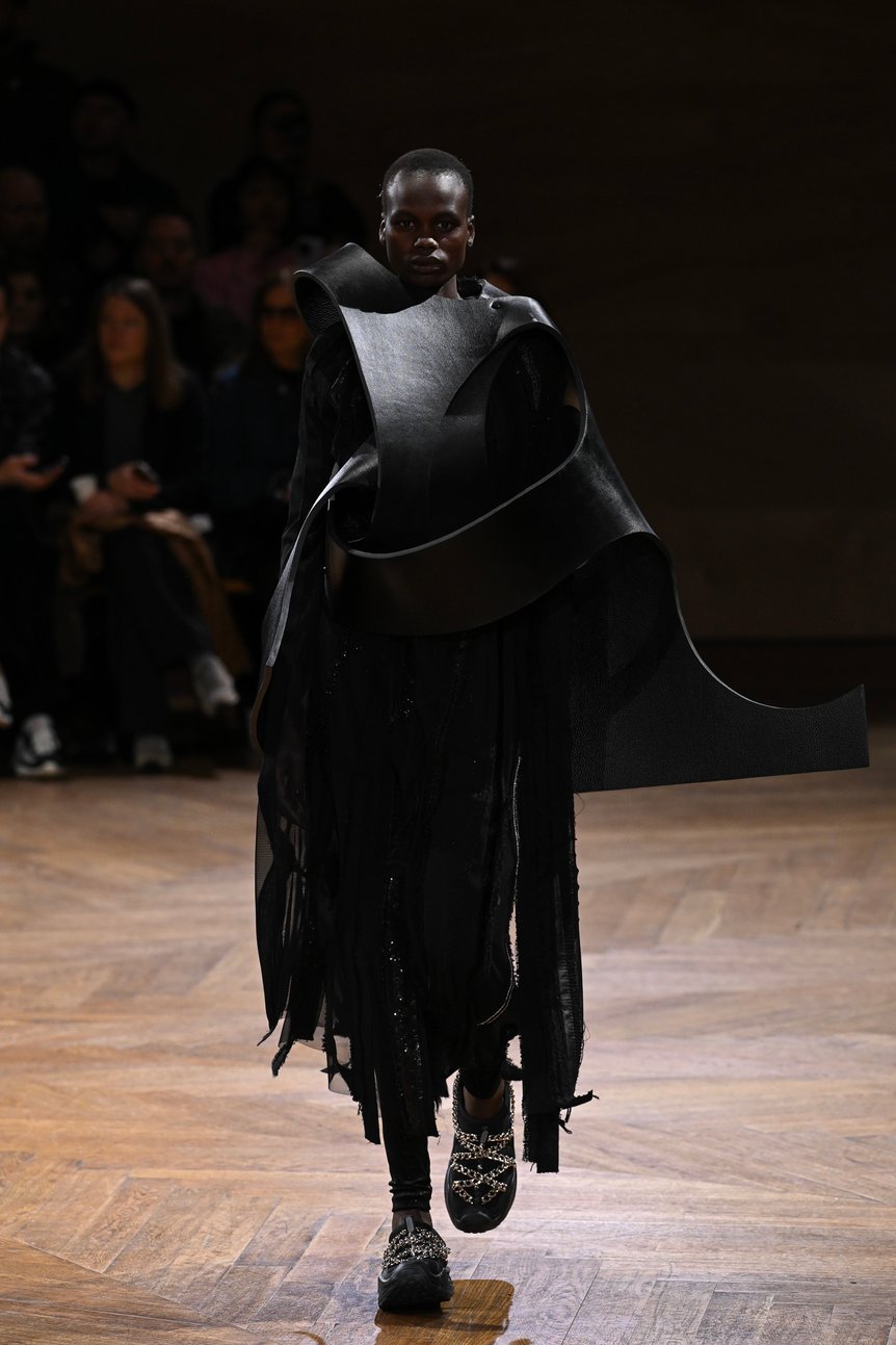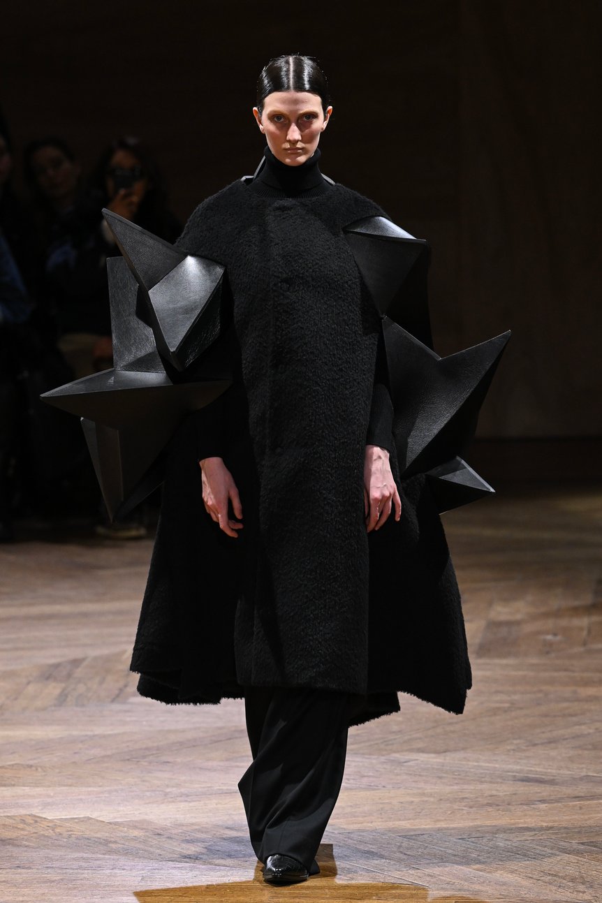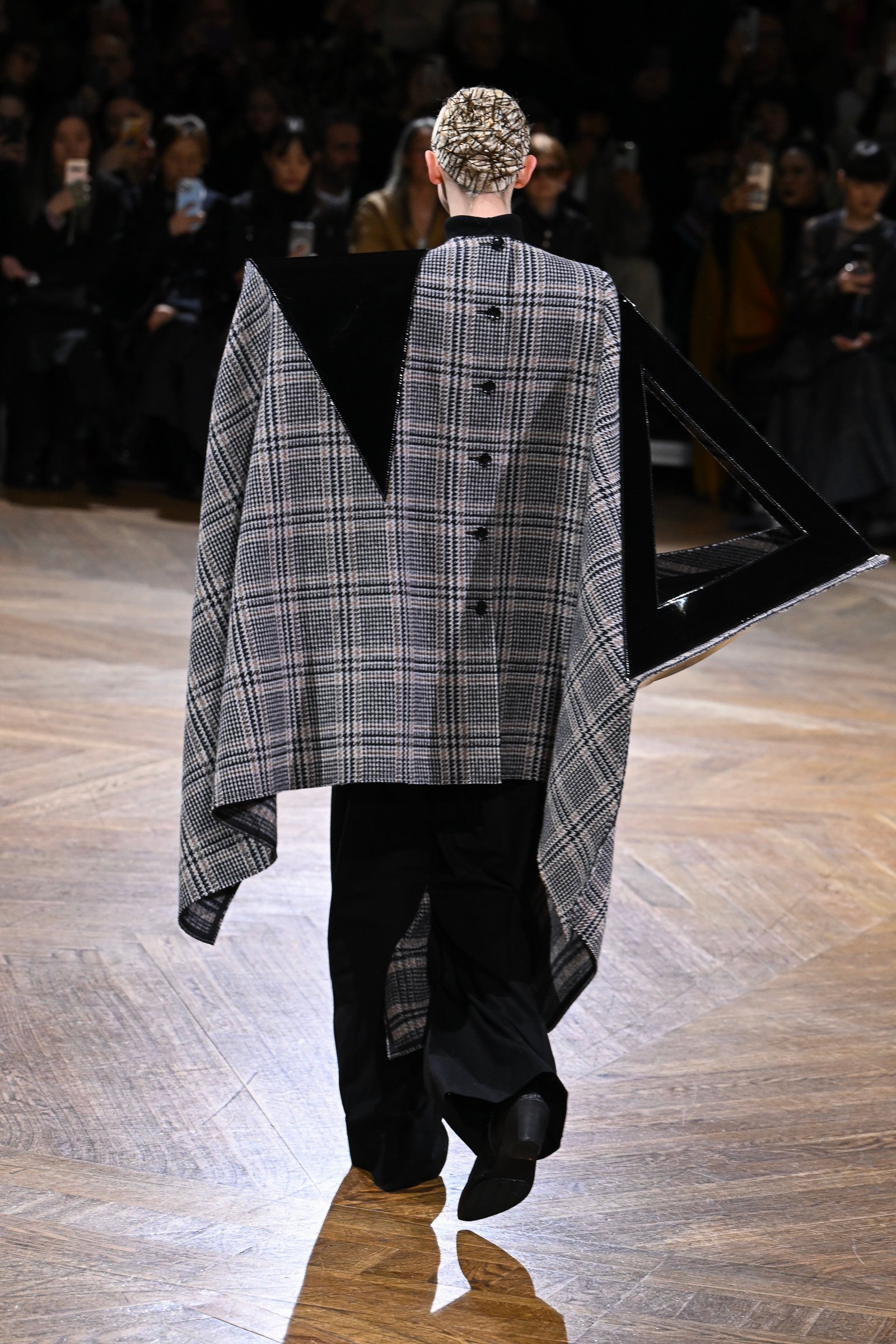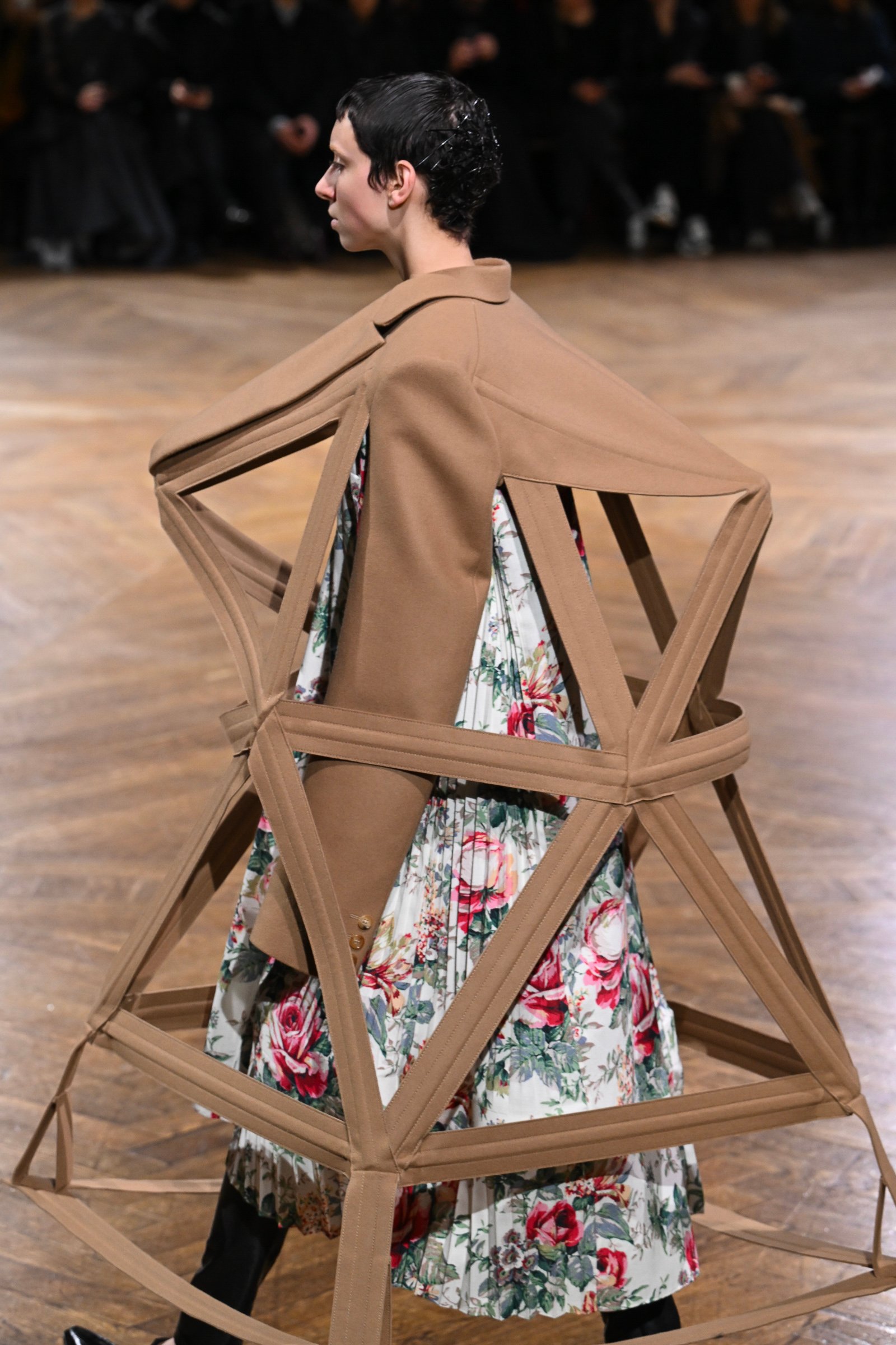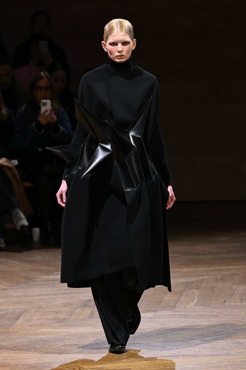 不気味なピアノの音色とともに登場したファーストルックは、ピラミッドのような四面体と三角形がボディに取り付けられていた。おそらく、それは“パブリックアート”の象徴で、その内側にモデルが入り込んでいるという構造だ(パブリックアートは多くの場合、触ったり中に入ったりできる彫刻である)。あるいは、人体はアートを支える幹とも言えるかもしれない。アウターの内側は、黒いタートルネックのニットウェアにワイドなスラックスというプレーンでアノニマスな装いになっているのは、何を意味しているのだろうか。