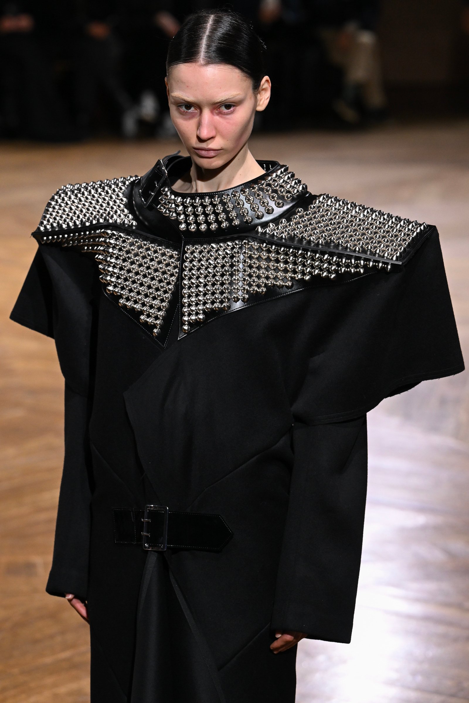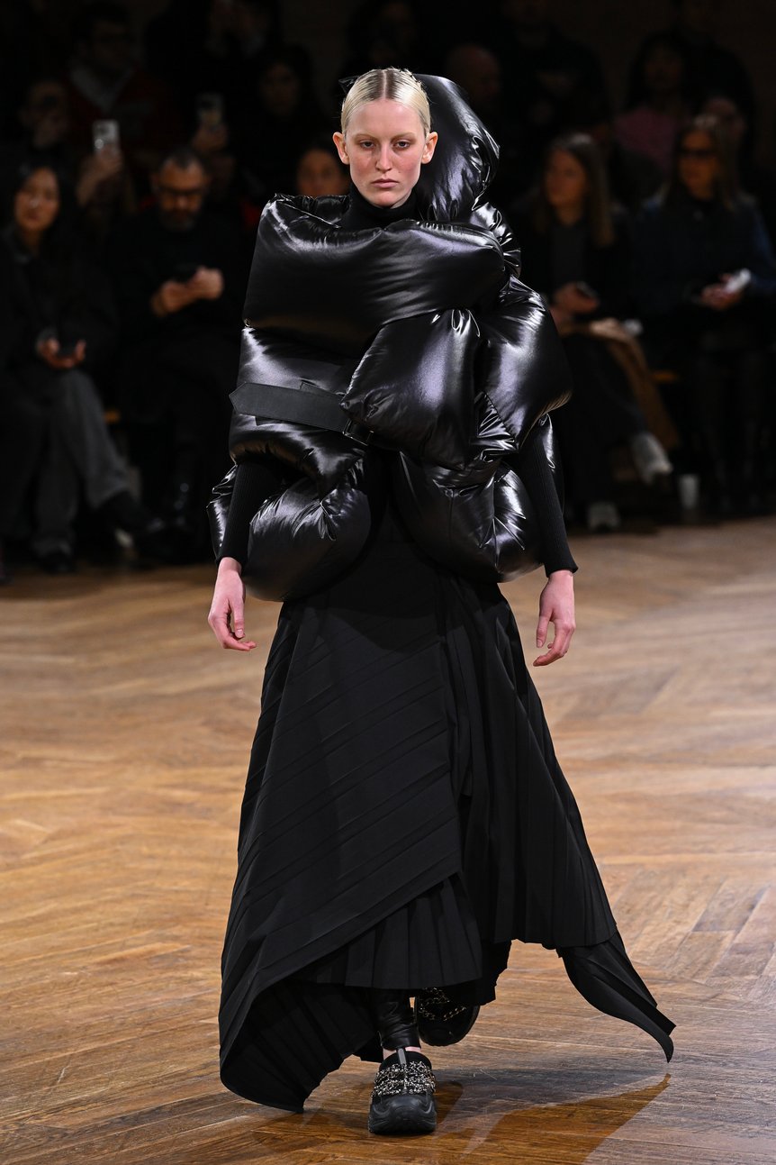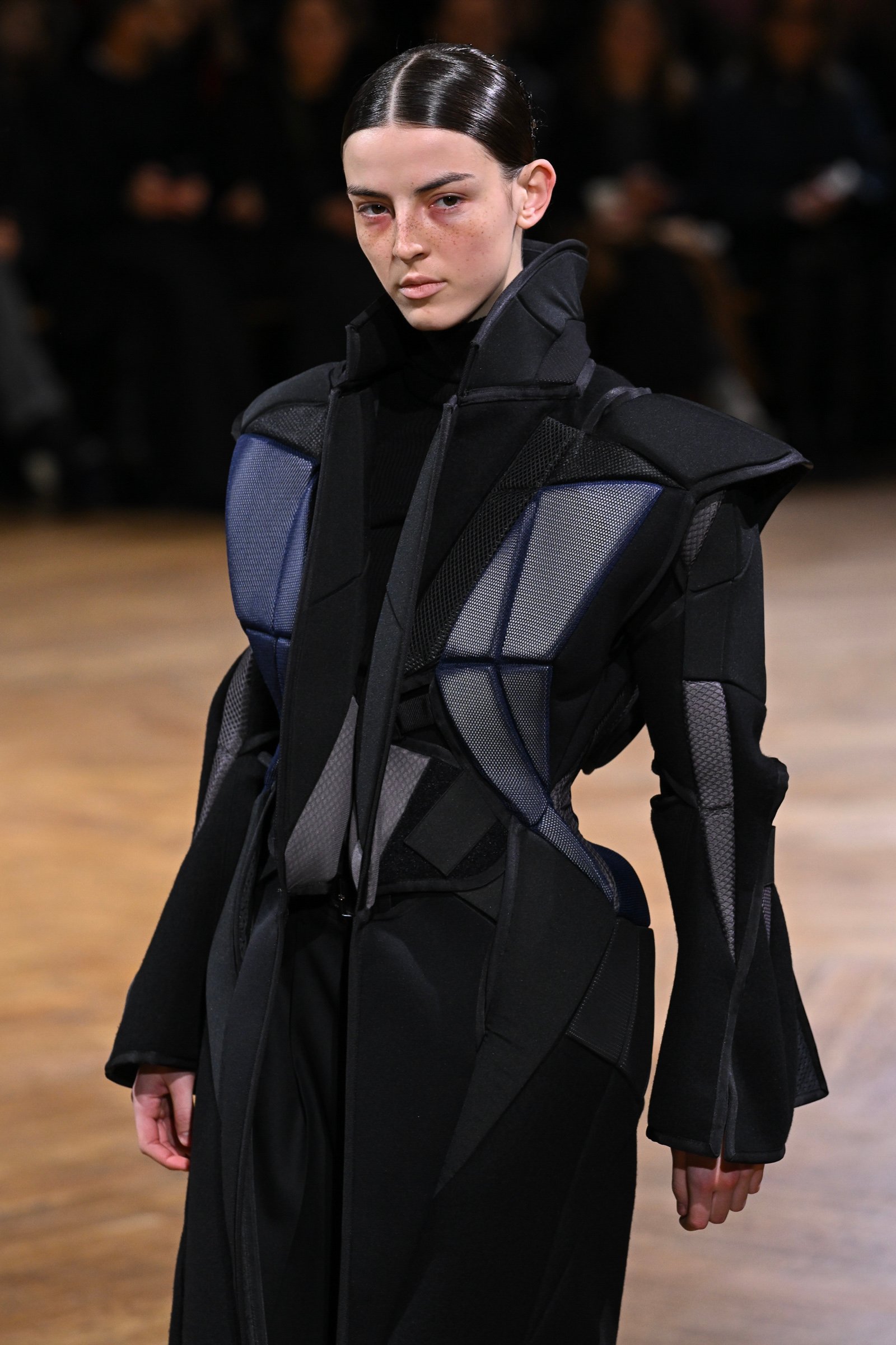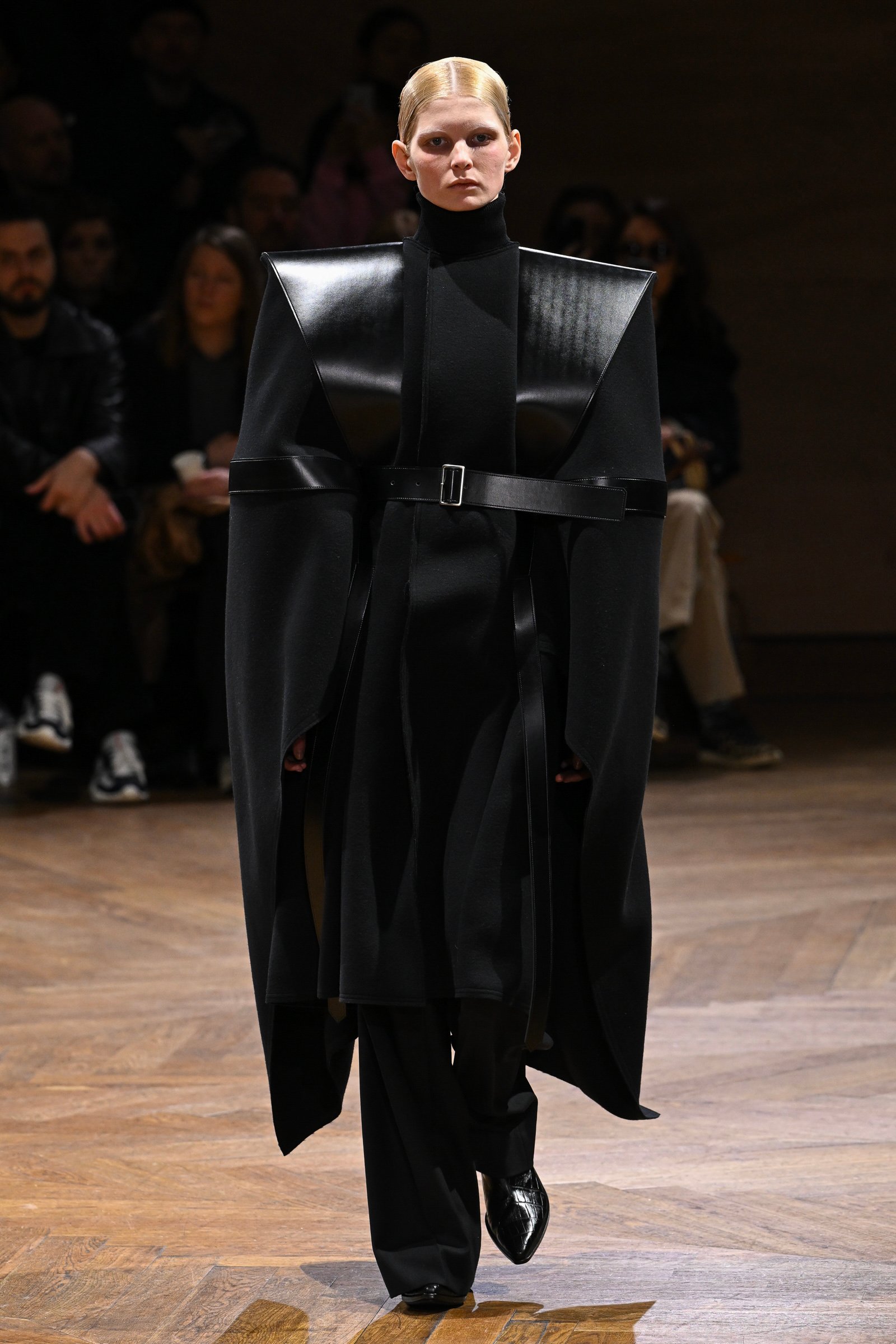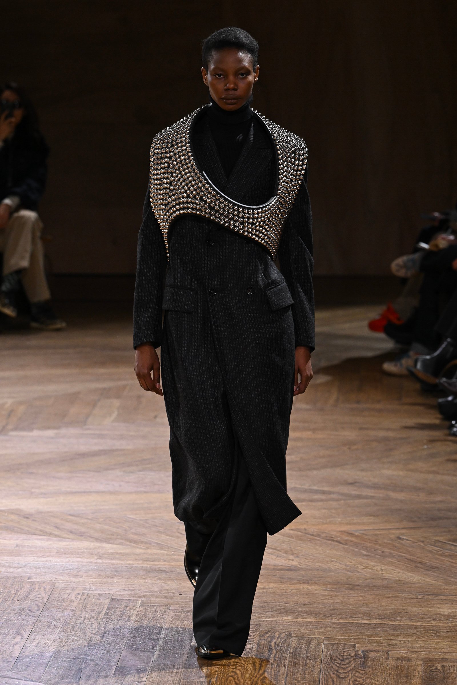 不気味なピアノの音色とともに登場したファーストルックは、ピラミッドのような四面体と三角形がボディに取り付けられていた。おそらく、それは“パブリックアート”の象徴で、その内側にモデルが入り込んでいるという構造だ(パブリックアートは多くの場合、触ったり中に入ったりできる彫刻である)。あるいは、人体はアートを支える幹とも言えるかもしれない。アウターの内側は、黒いタートルネックのニットウェアにワイドなスラックスというプレーンでアノニマスな装いになっているのは、何を意味しているのだろうか。