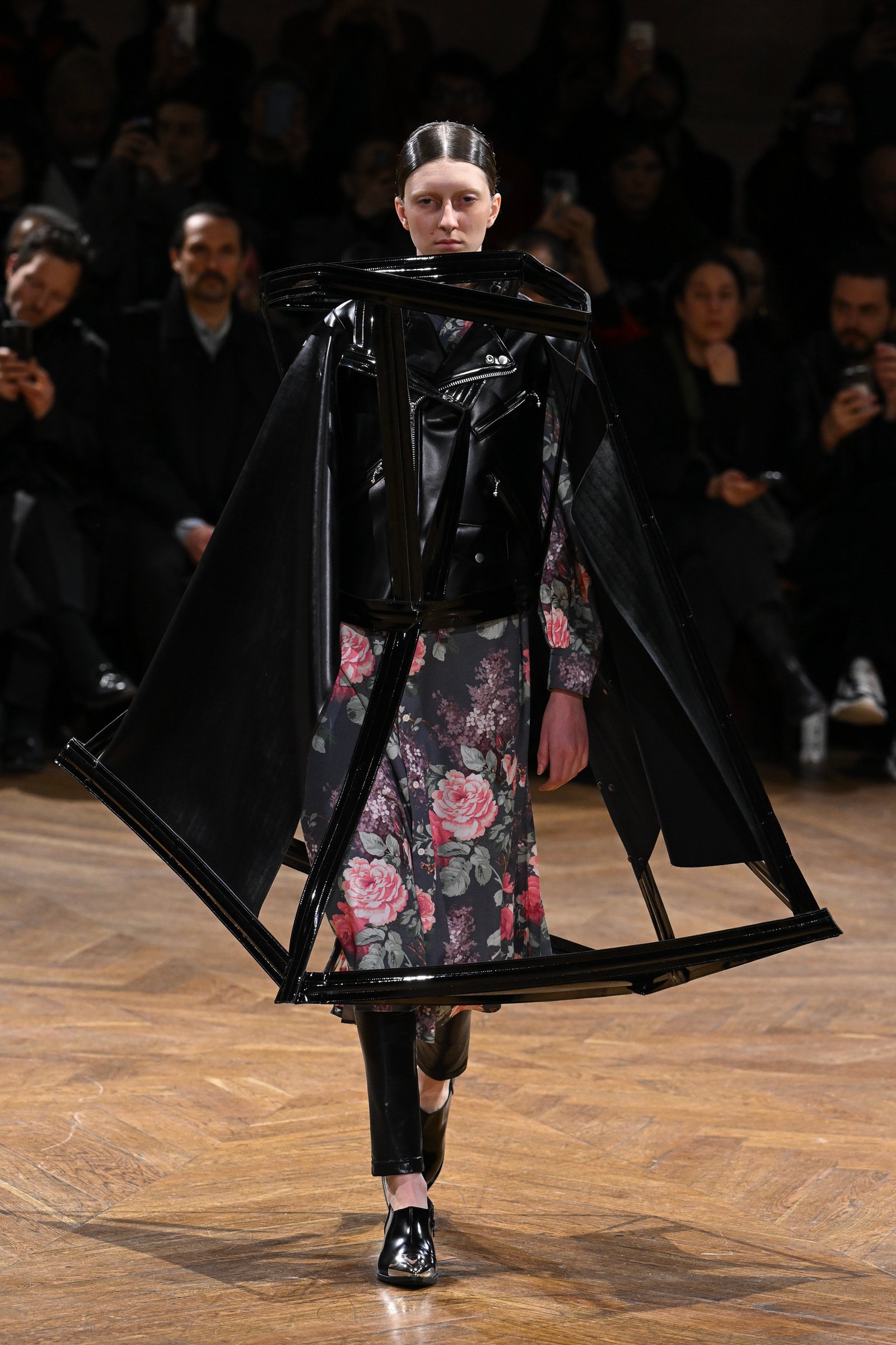 前半の19ルックはすべて黒で統一されていたが、ピアノの音色がエリック・サティの「Gymnopedies_No.1」に変わると一変した。チェスターコートやライダースジャケットといったベーシックな衣服はクリノリンの骨組みと融合し、その中にはレトロな花柄のドレスがコントラストを生み出すように挿入された。