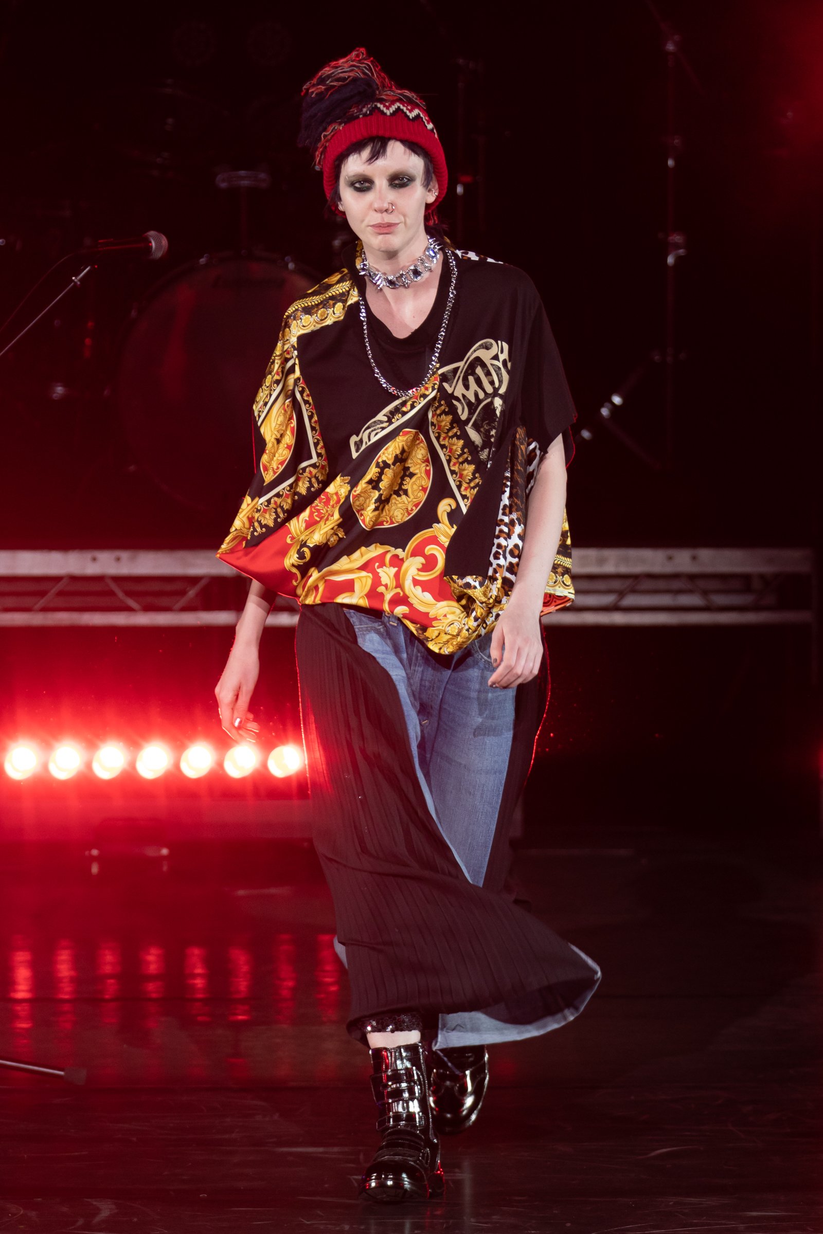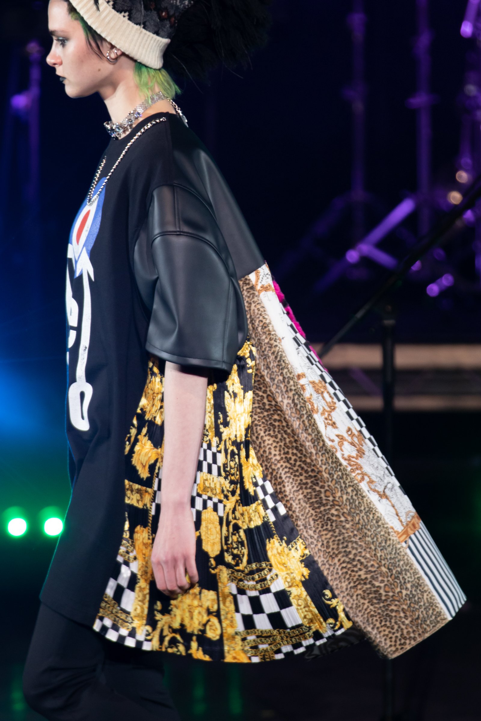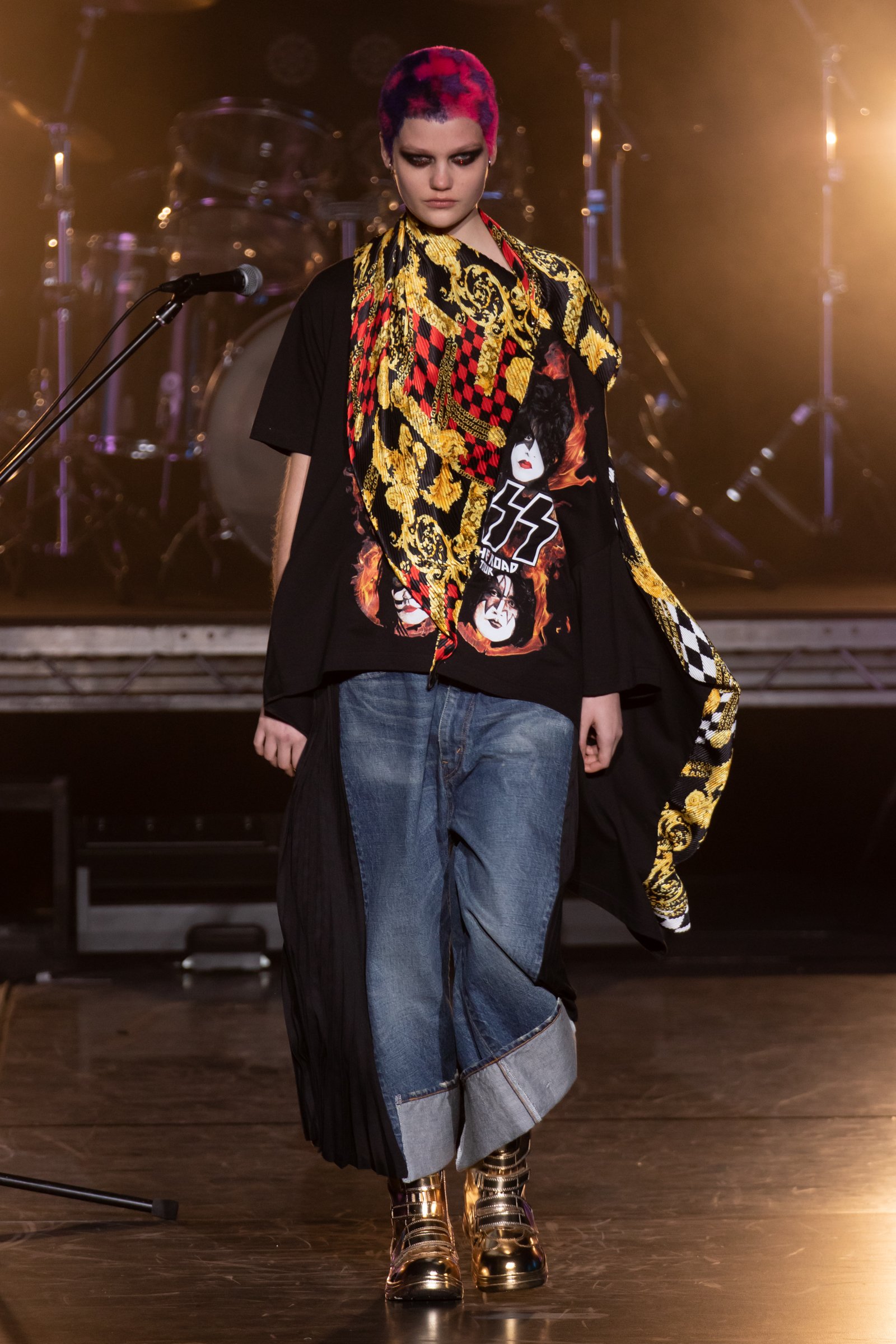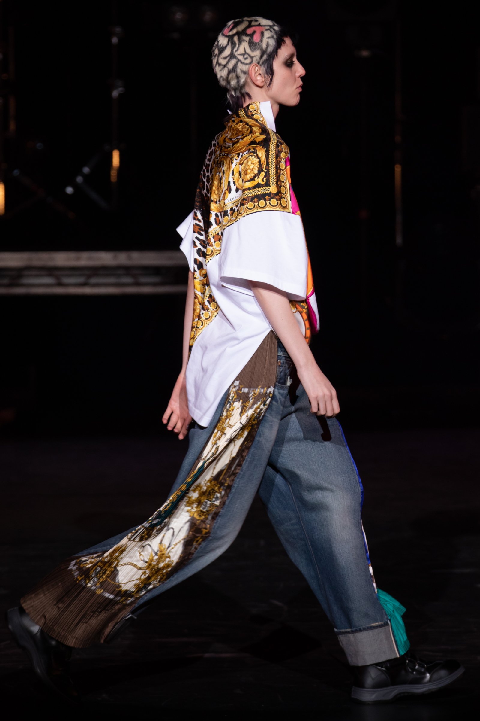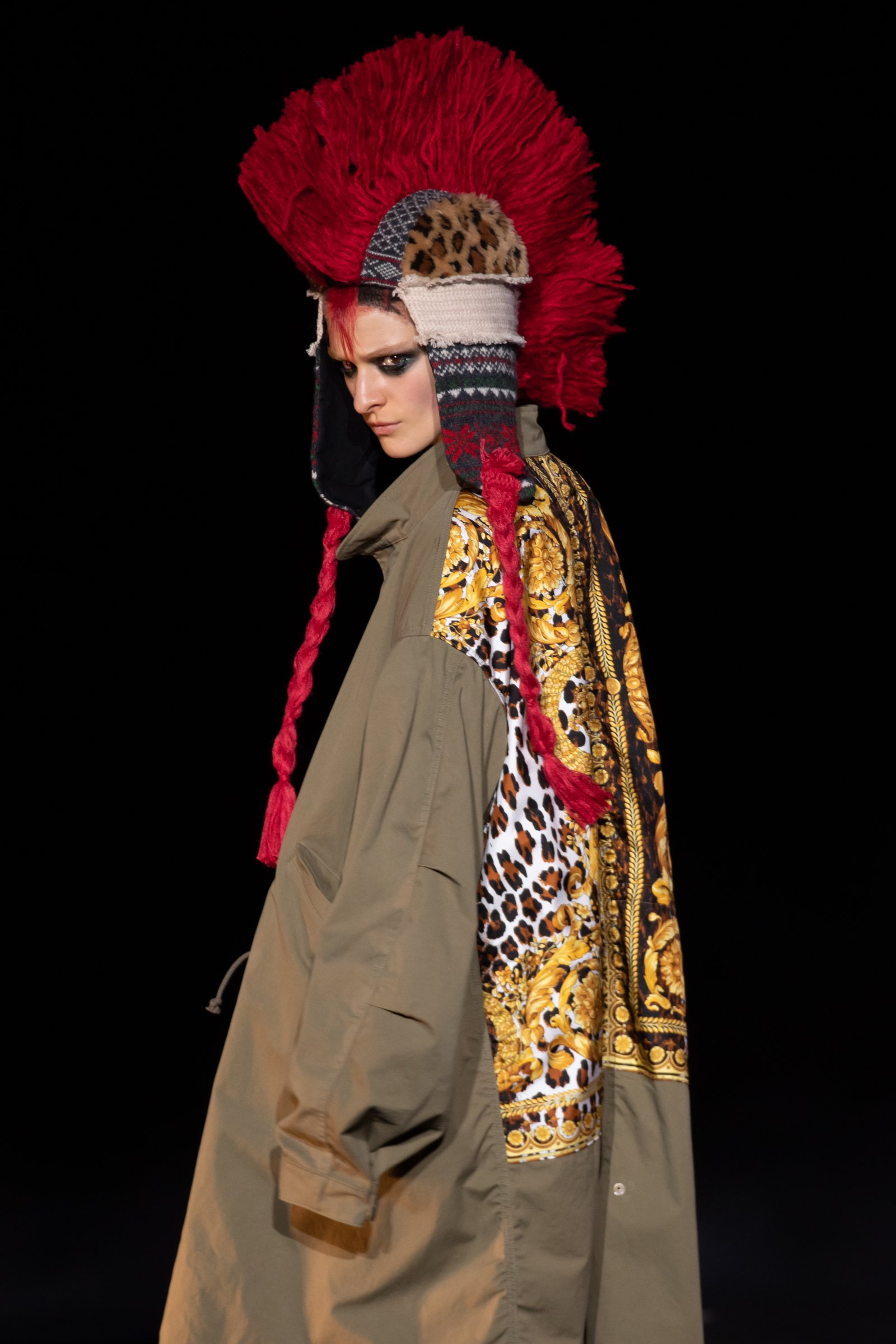 ちなみに、「ベルサーチ」のスカーフを用いたコラボシリーズは「Junya Watanabe Comme des Garçons x Versace Iconic Print Project」と命名されている。着流しのコンビポンチョ、前面スカーフで背面デニムのスカート、パッチワークで刻んだスカートなど計6種あり、他はオリジナルだ。黄黒のバロッコ柄はフィーチャーされていたが、メデューサは視認できていない。