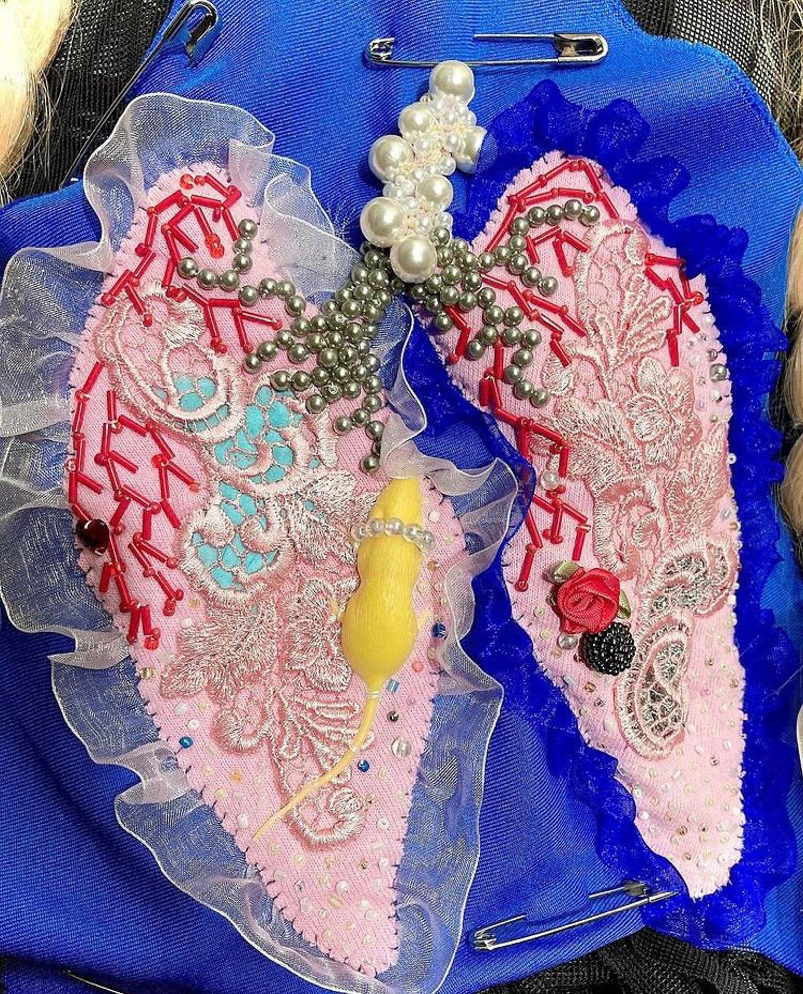 あれ3日で縫ったんですよ(笑)。製作背景も恥ずかしいといえば恥ずかしくて、「これからもずっと一緒かな?」と思っていた人と別れて、泣き腫らしていた時に友人が「今のその顔、模った方がいいよ」と提案してくれたことがきっかけです。数日後に自分の誕生日だったこともあり、今までの過去も全て埋葬するような気持ちでシリコンに顔を浸し、新しい自分を迎えに行く気持ちで今までに作った刺繍作品や、看護師時代の葛藤、「当時、本当はこういうことがしたかったのに我慢していたんだぞ」という気持ちや思い出を全て縫い付けたので「禍々しい祭壇」というのはあながち間違っていないです。
