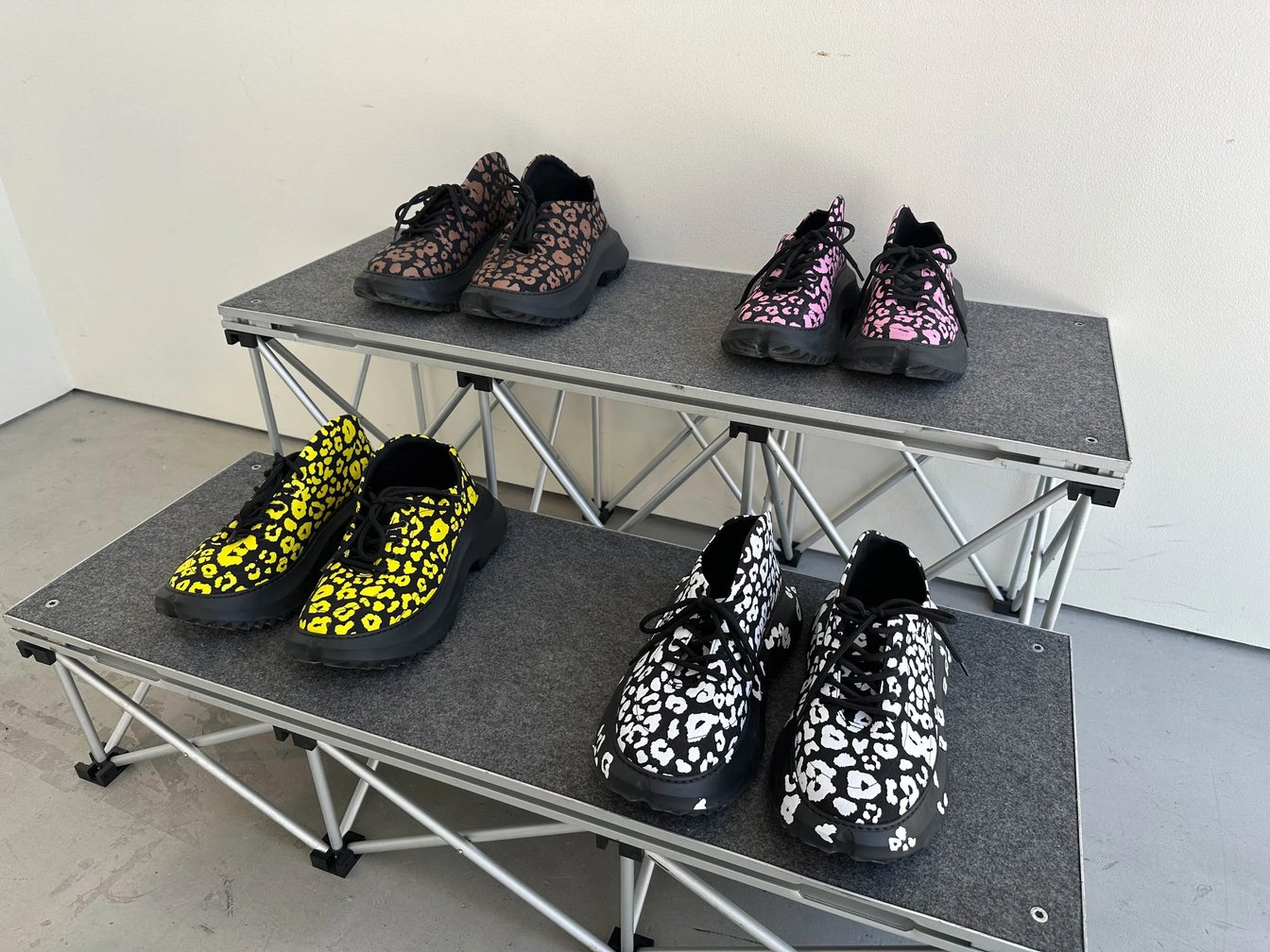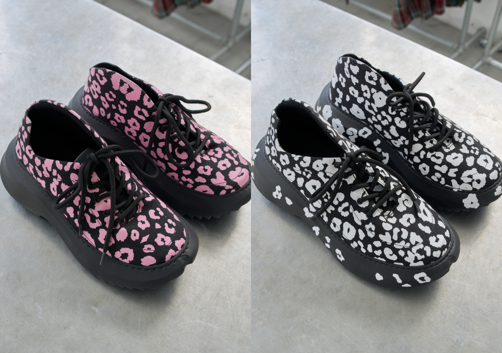 末安:1年前にフィレオの展示会で新作として発表されたシューズを見て、形がおもしろくて好きだなとなって。僕が作る服はカラフルでグラフィカルですが、彼が作るものは基本的にモノトーンで、黒か白しかなかったんです。なので、この靴に対して「アッパーを自分なりのグラディカルにしてみたい」と思ったのがコラボのきっかけ。個人的にレオパード柄が好きだから、フィレオの靴がレオパード柄になってたら可愛いかなと思ってデザインしました。