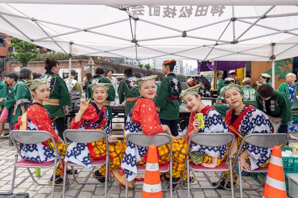 彼女たちは神輿行列を先導する役で、本番直前のお化粧直しをしている最中だった。