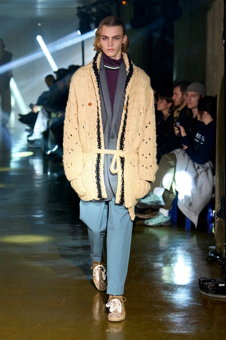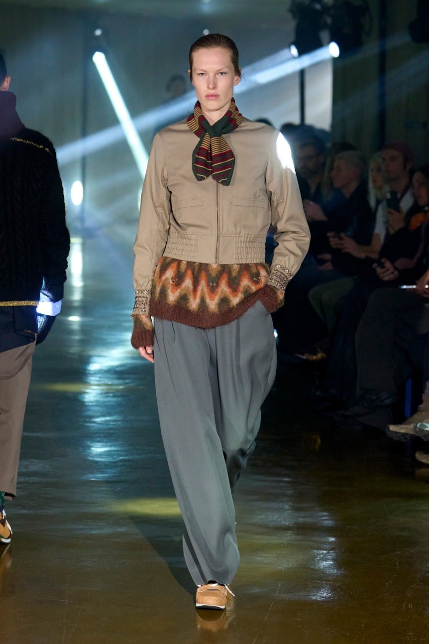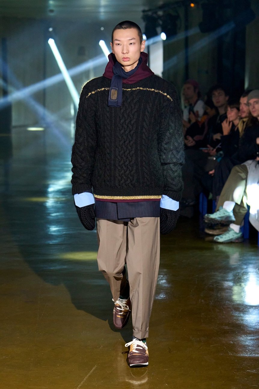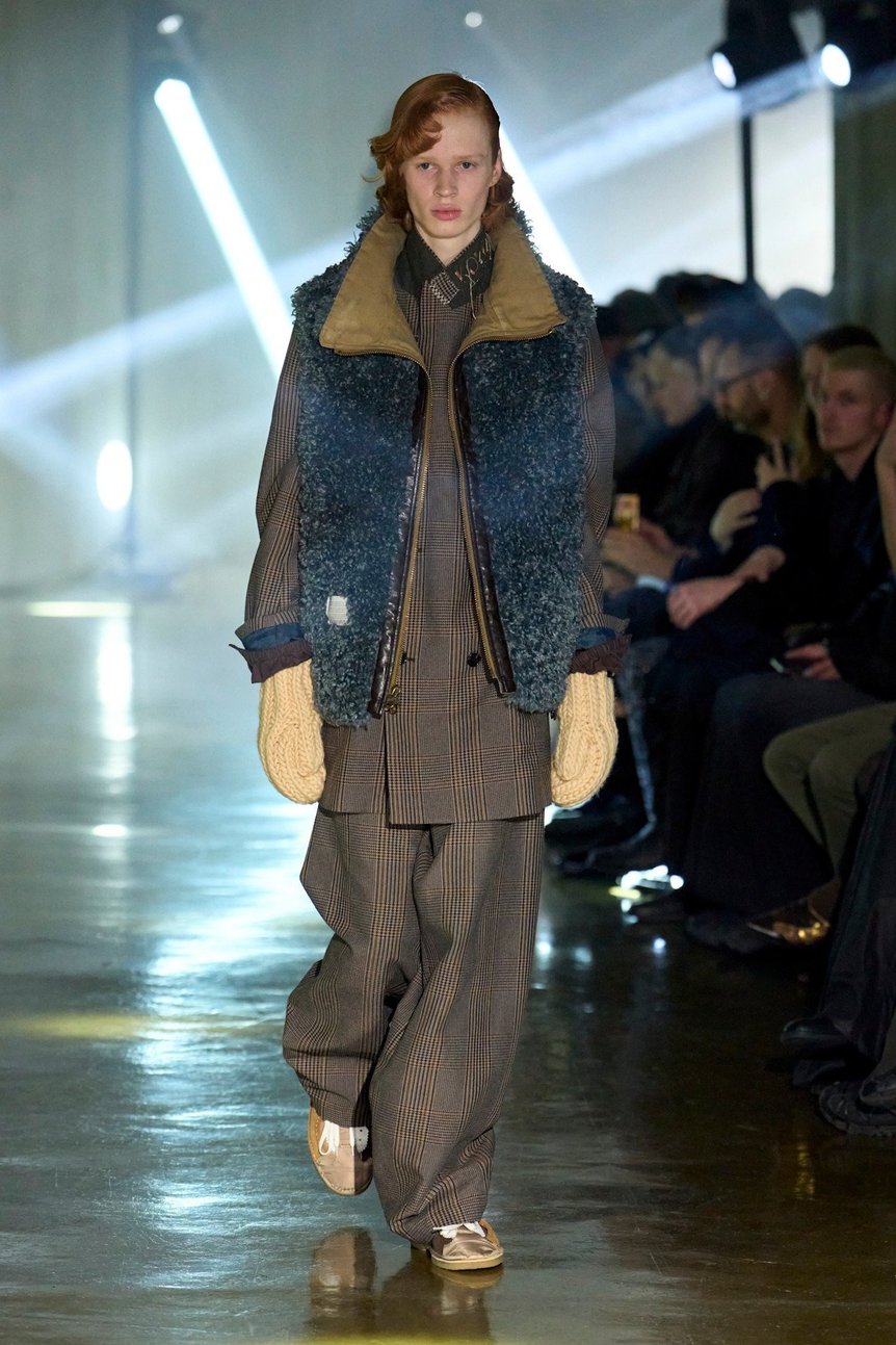 阿部がデザイナーとして手掛けた最後のコレクションとなった2025年秋冬は、これまでの歩みだけを見せるのではなく、しっかりと新しさを更新してきた。ネイビー、ブラウン、グレーを軸に、レッド、パープル、ボルドーなどを差し色に使う阿部らしさは如実に表現され、アイテムはレイヤードを前提としたデザインに。ファーストルックのグレンチェックのスーチングの裏地とシアリングベストはアイアンブルーで色をまとめ、加えてほっこりした手編みの手袋で既視感のないスタイリングに仕上がっている。スーツの上にダウンジャケットとシアリングベストを重ねたルックや、テーラードジャケットの上にニットガウンをレイヤードしたものなど、テーラーリングを現代的解釈でアウトプットした。