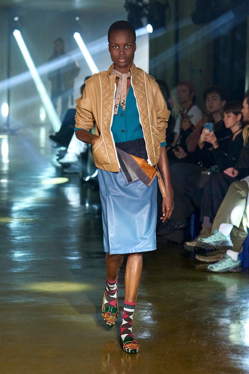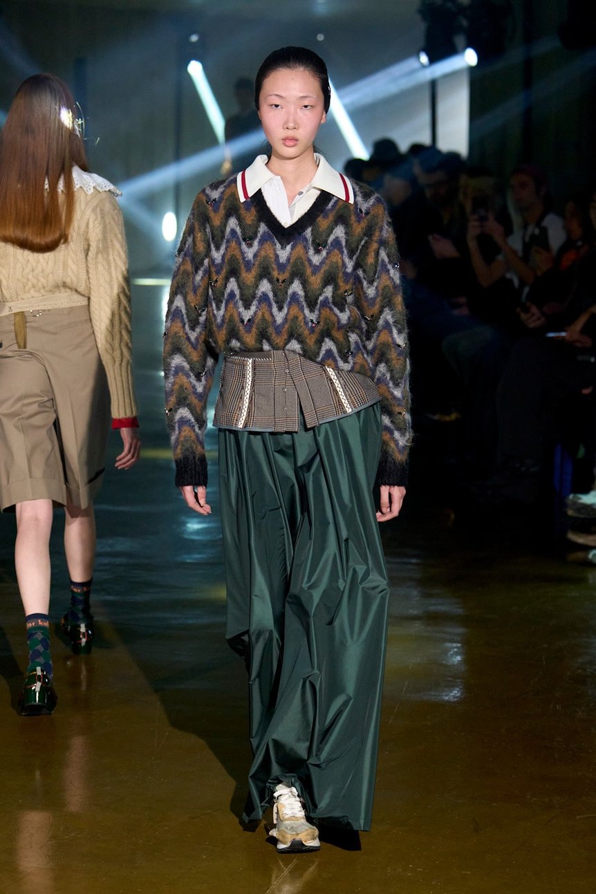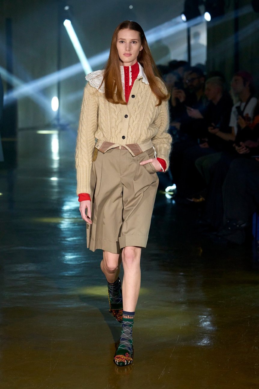 レイヤードはウエスト部分でも存分に発揮。厚手のニットカーディガンをタックインすることで、ウエストを折り返したデザインのハーフパンツを強調したほか、ショート丈のドリズラージャケットからジャカードニットを大胆に見せるコーデ、3枚のテキスタイルを重ねたスカートなどがその代表格だ。
