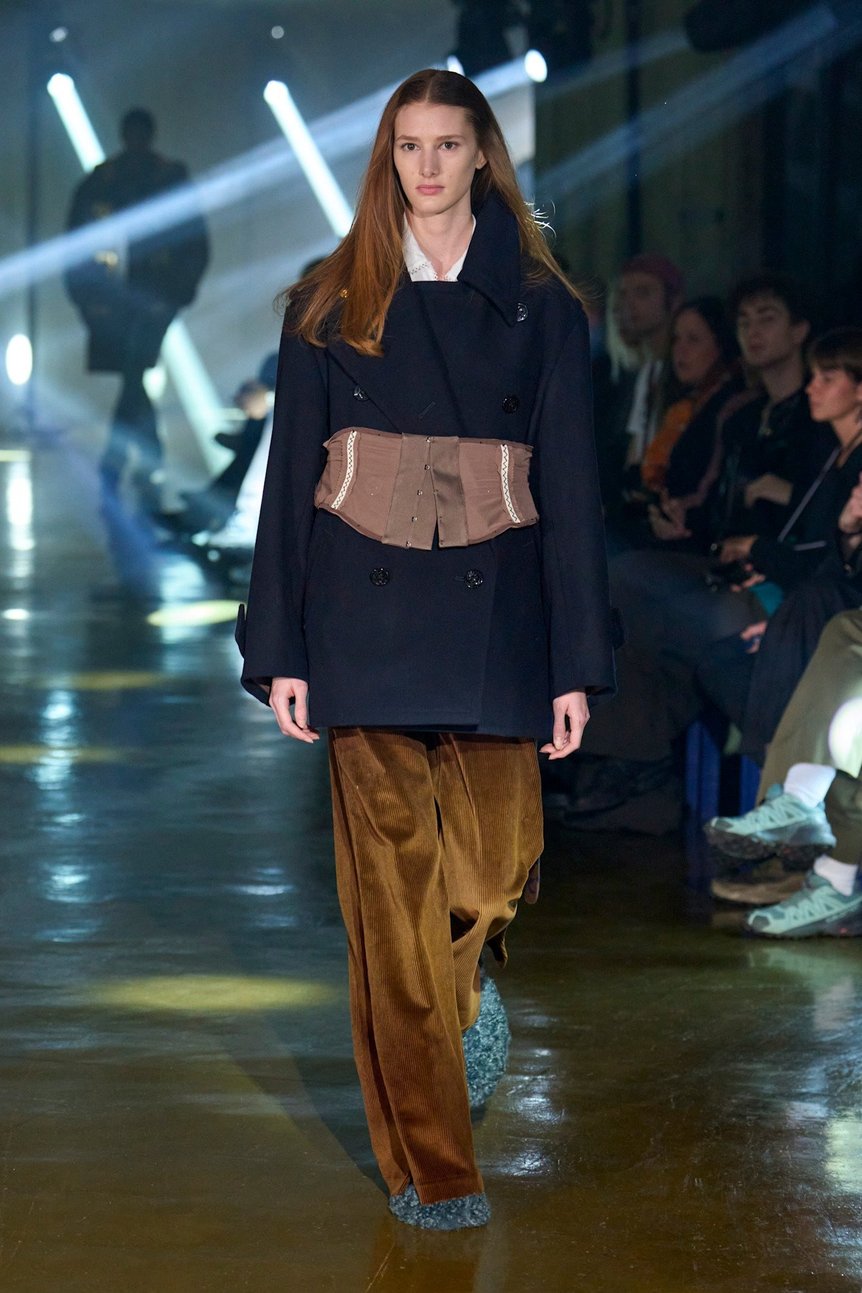 また、新たな提案としてコルセットをスタイリングに採用。コルセットが生まれた1800年代の貴族ように、体のラインを補正するために締め上げるのではなく、あくまでもコーデのアクセントして活用しており、ニットの下から覗かせたり、Tシャツの上に重ねたり、Pコートの上に巻くことで独自のスタイルを作り上げた。