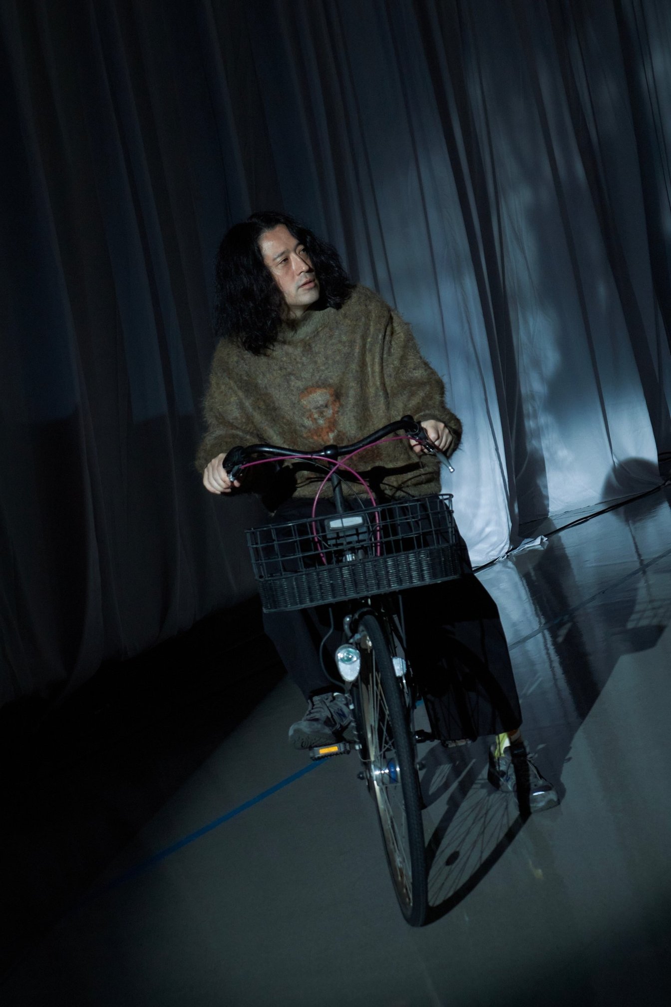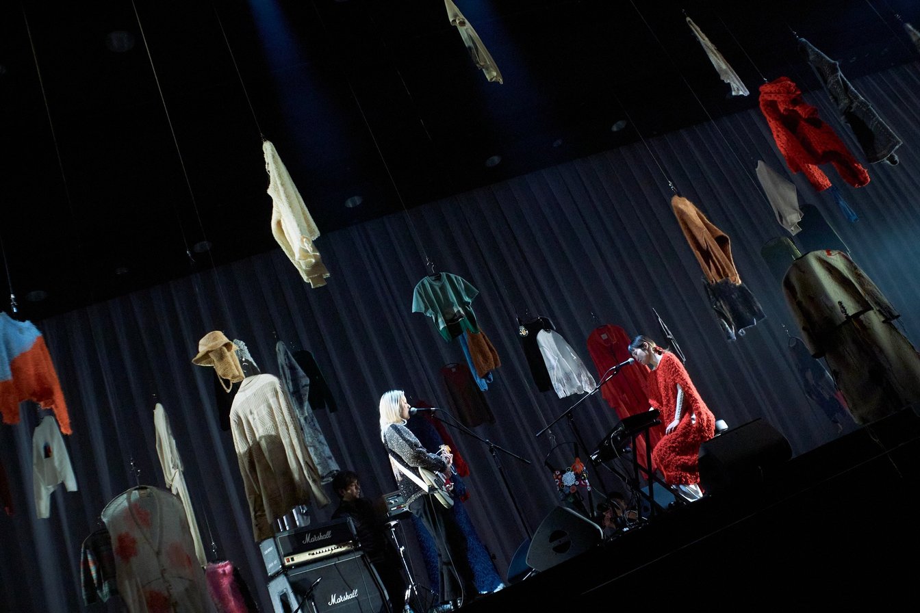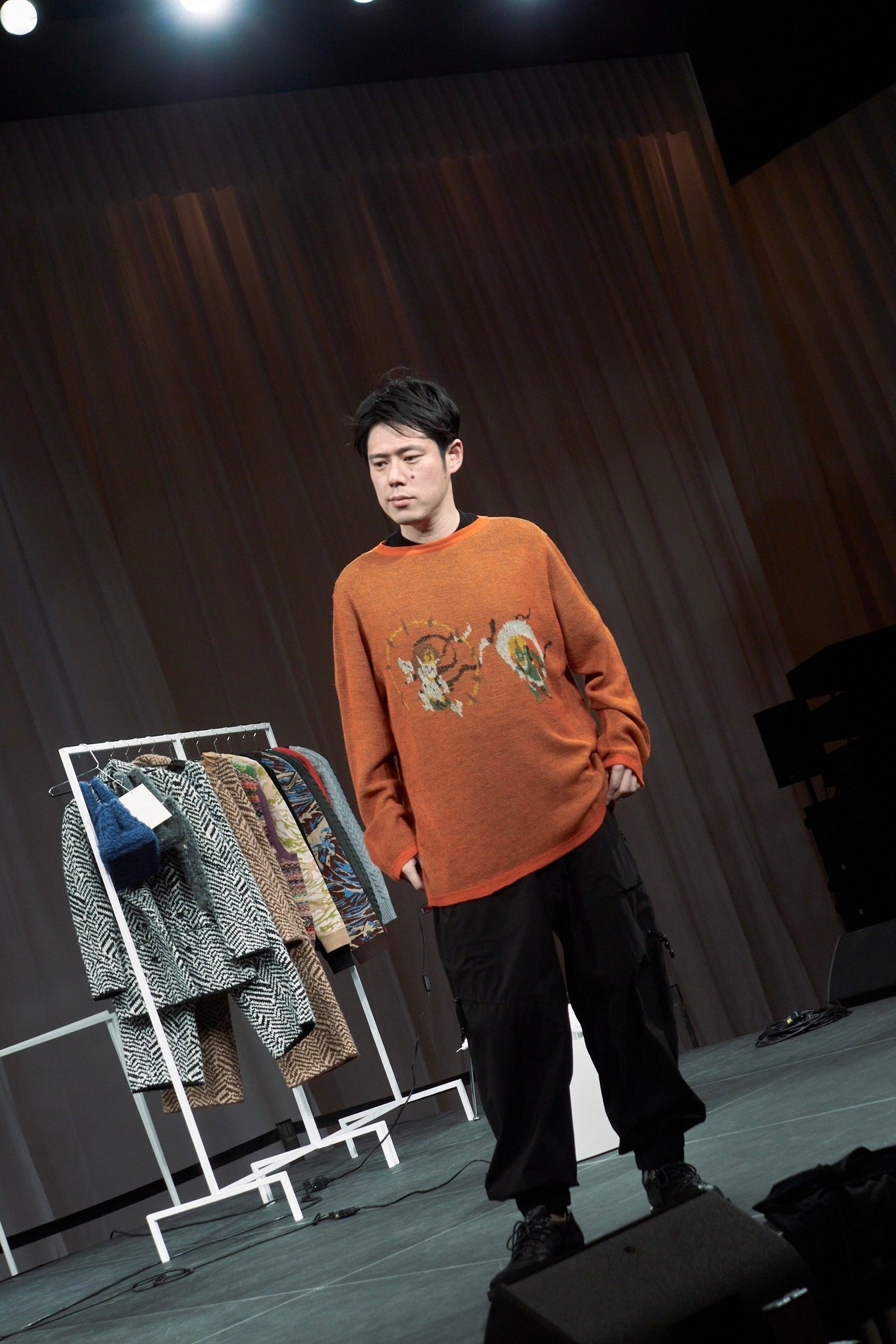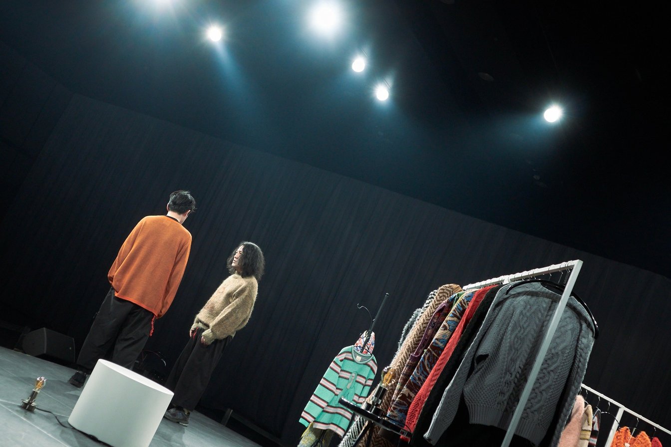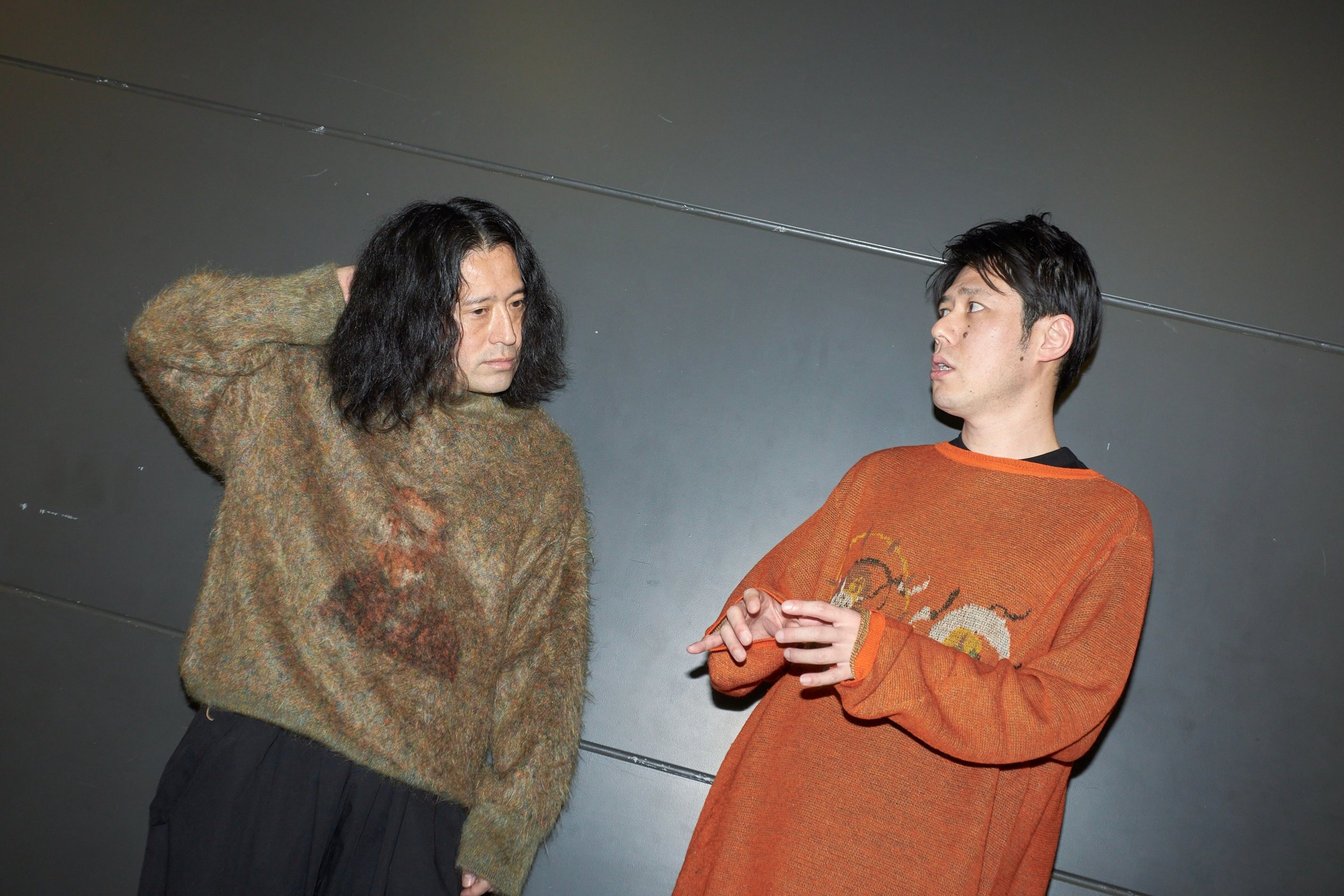 通常のファッションショーは、演出やステイトメントなどでコレクションの補助線のような役割を担うことが多い。しかし、コウタグシケンの服は、具志堅自身が日々生きている中でなんとなく気になったことが一着ごとに濃縮され、既にデザインとして閉じ込められている。例えば、今回発表されたニットのセットアップは、友人の結婚式に赴いた具志堅がスーツを着て、背筋が伸びる感覚を思い出したから。お土産屋さんに売られていた葛飾北斎の神奈川沖浪裏のクリアファイルを見て「これをニットで表現したらどうなるか気になって」作られたものや、新潟出張で立ち寄った居酒屋で見かけた八海山のポスターがあまりにも美しかったから出来上がった猿のカーディガン、ビートルズの新曲「Now and Then」を聴いてAIと向き合う気になって生まれたスカジャンなど、そのどれもが脈絡はないけど間違いなく具志堅が送ってきた半年間の生活の匂いを感じさせる。具志堅の絵日記とも呼べるコレクションアイテムを、同じく何気ない日常のように脱ぎ着する二人。ここにも、おおらかで自由な雰囲気を感じさせる。二人のお笑い芸人が壇上から降りたあと、ギターとキーボードをかき鳴らす「酩酊麻痺」の二人はこう歌ってショーを締めくくる。