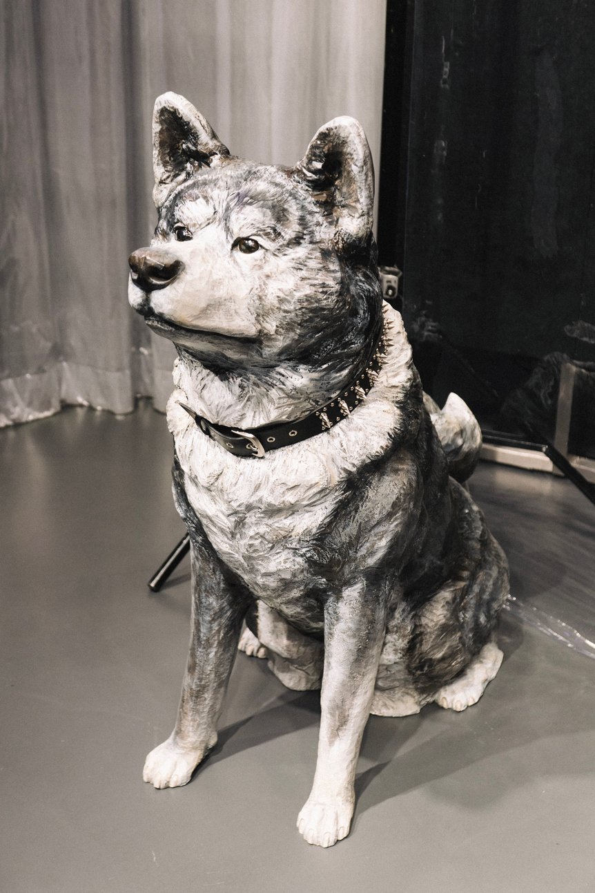中に入ると、初公開となる2025年春夏コレクションのサンプルと2024年秋冬の商品が並び、手にとってリミ フゥを体感することができる。奥に進むと、スタッズの首輪をつけた山本耀司の愛犬「凛ちゃん」の像が設置されたフォトブースがあり、地下へと続く階段の壁には、山本里美自身がペイントした「Limi feu」の文字が躍る。