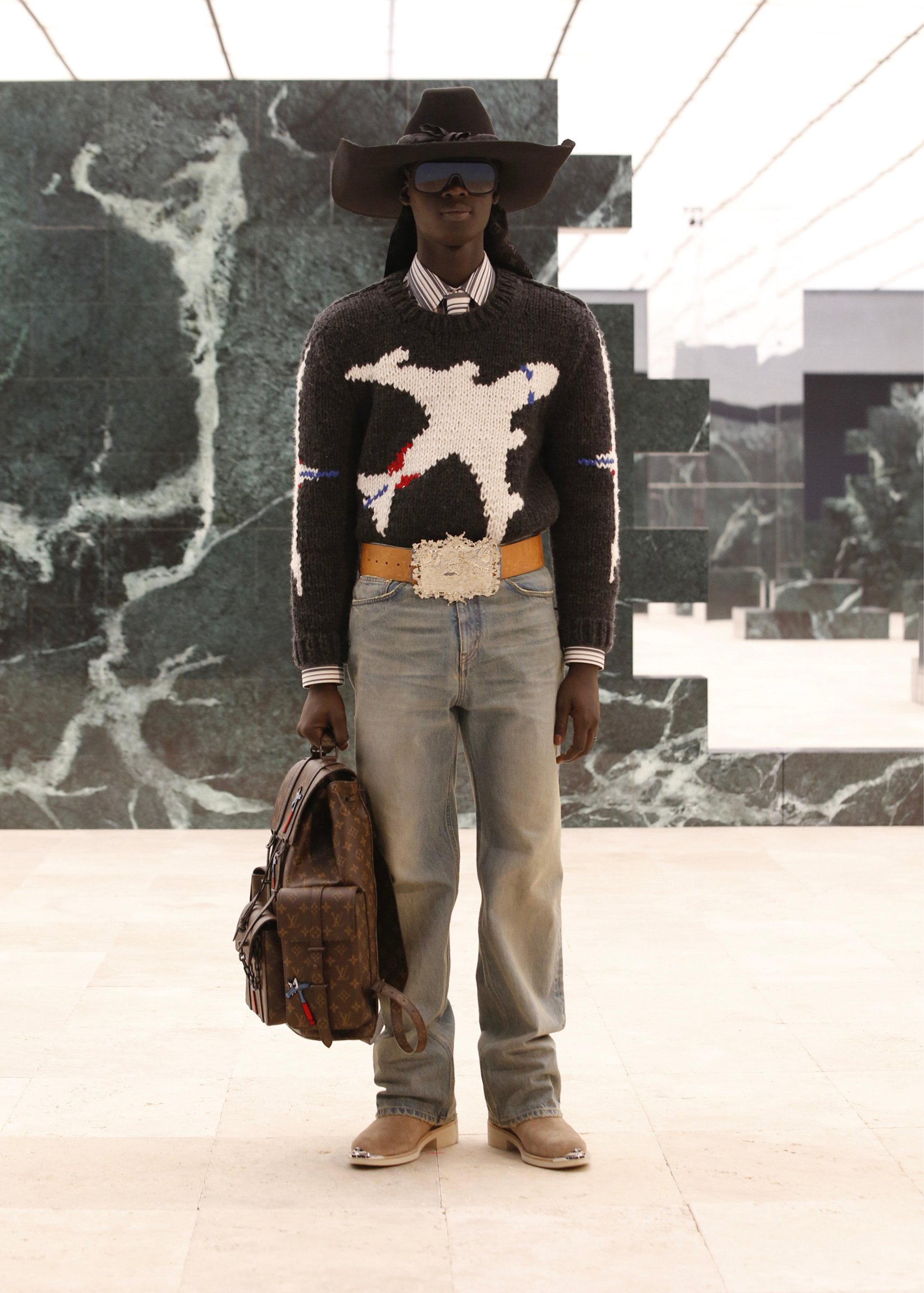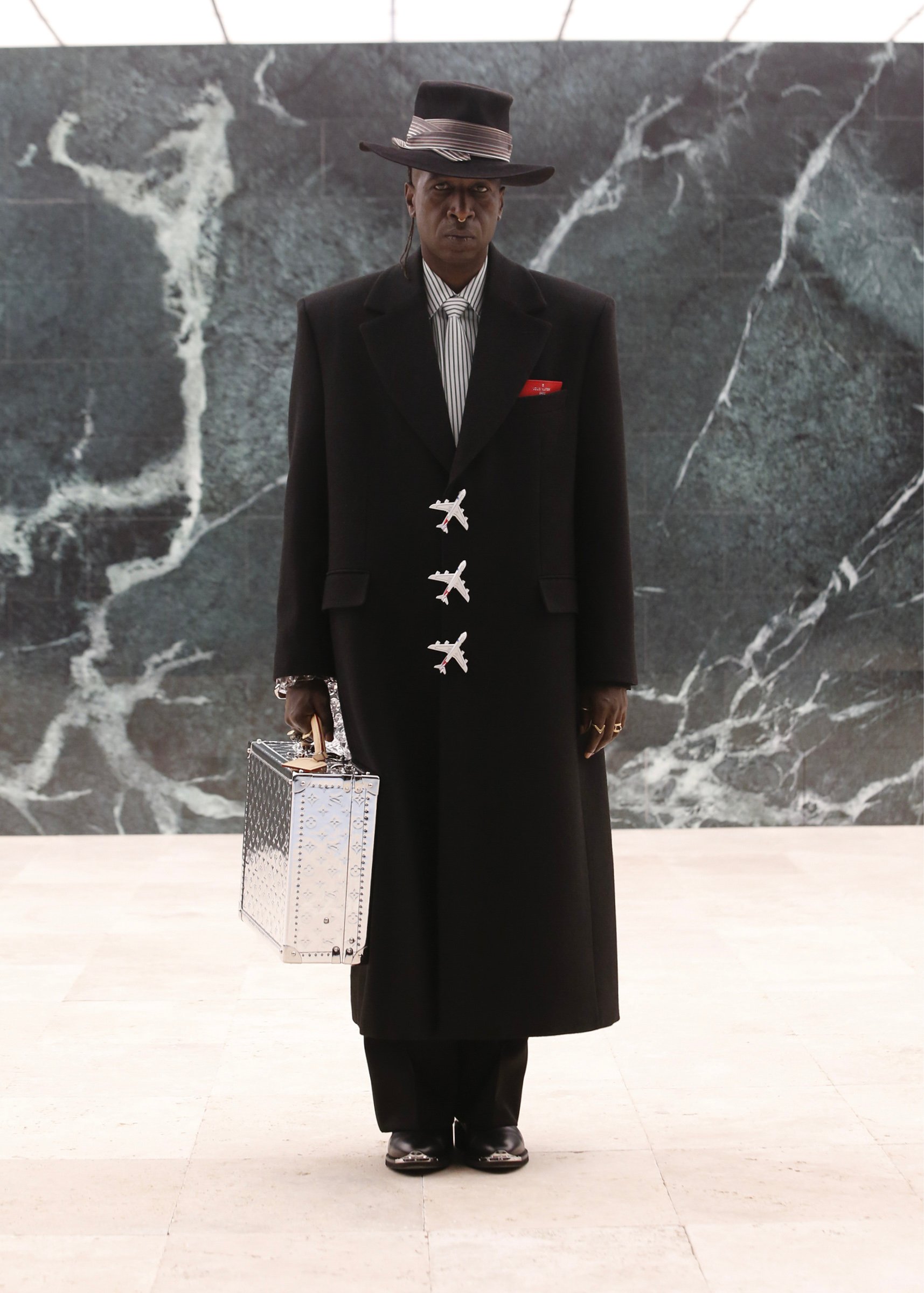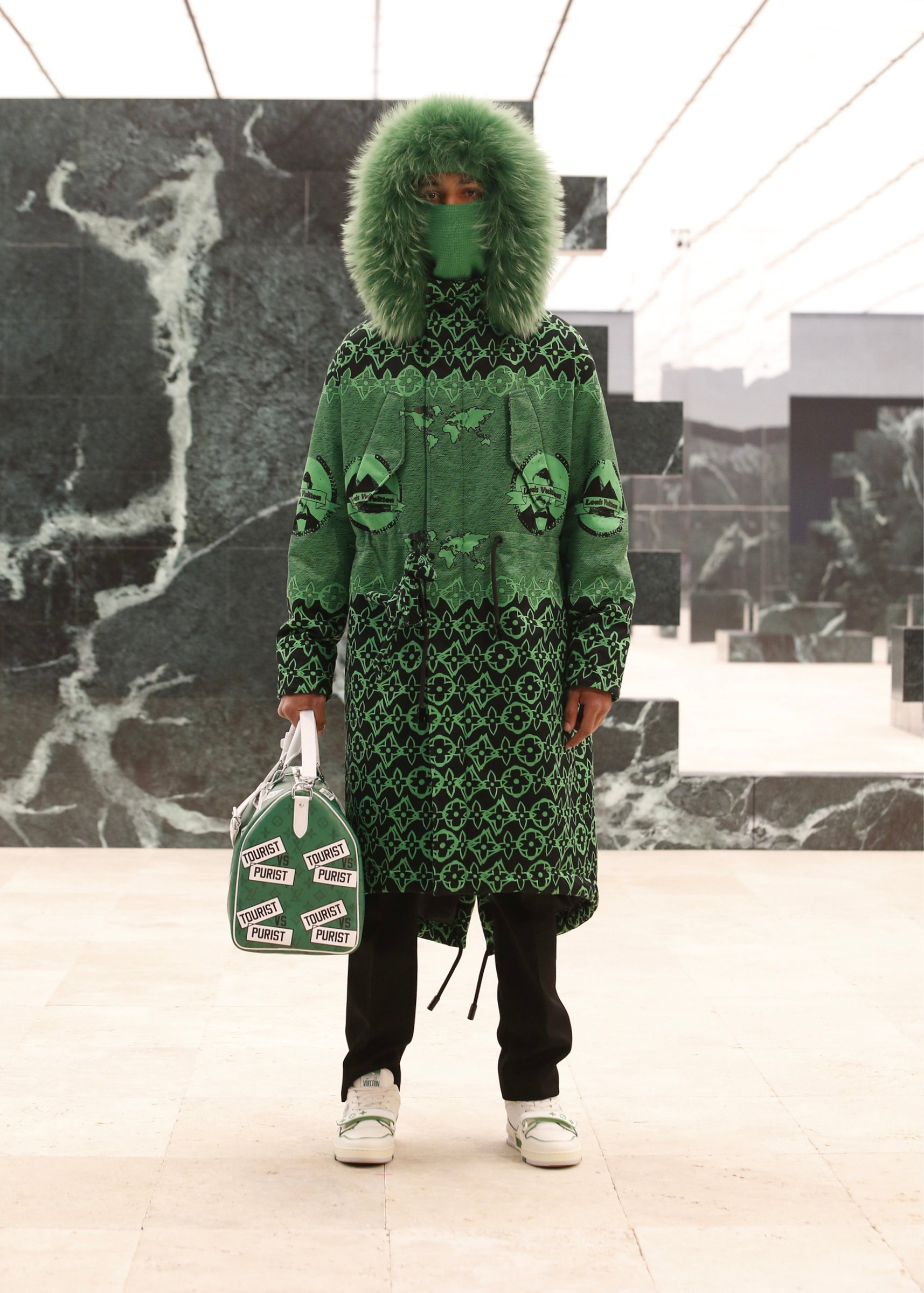 先月発表された2021秋冬メンズ・プレコレクションのルック写真は、背景に飛行機が写っていたが、あれはきっと今回の布石だったのだろう。飛行機のモチーフは、ファーストルックのコートの飾りボタンの他、機体を象ったモノグラムバッグ、そしてセーターの編み柄として登場する。コロナ禍前はヴァージルは世界有数のジェットセッターだったはずだが、飛行機での移動が制限されたことで色々と考えることがあったのかもしれない。これまでに何度か展覧会等で見せてきた「Tourist vs. Purist」(旅行者 vs 純血主義者)の文字がモノグラムのバックに描かれているのも、旅との連動を感じさせる。