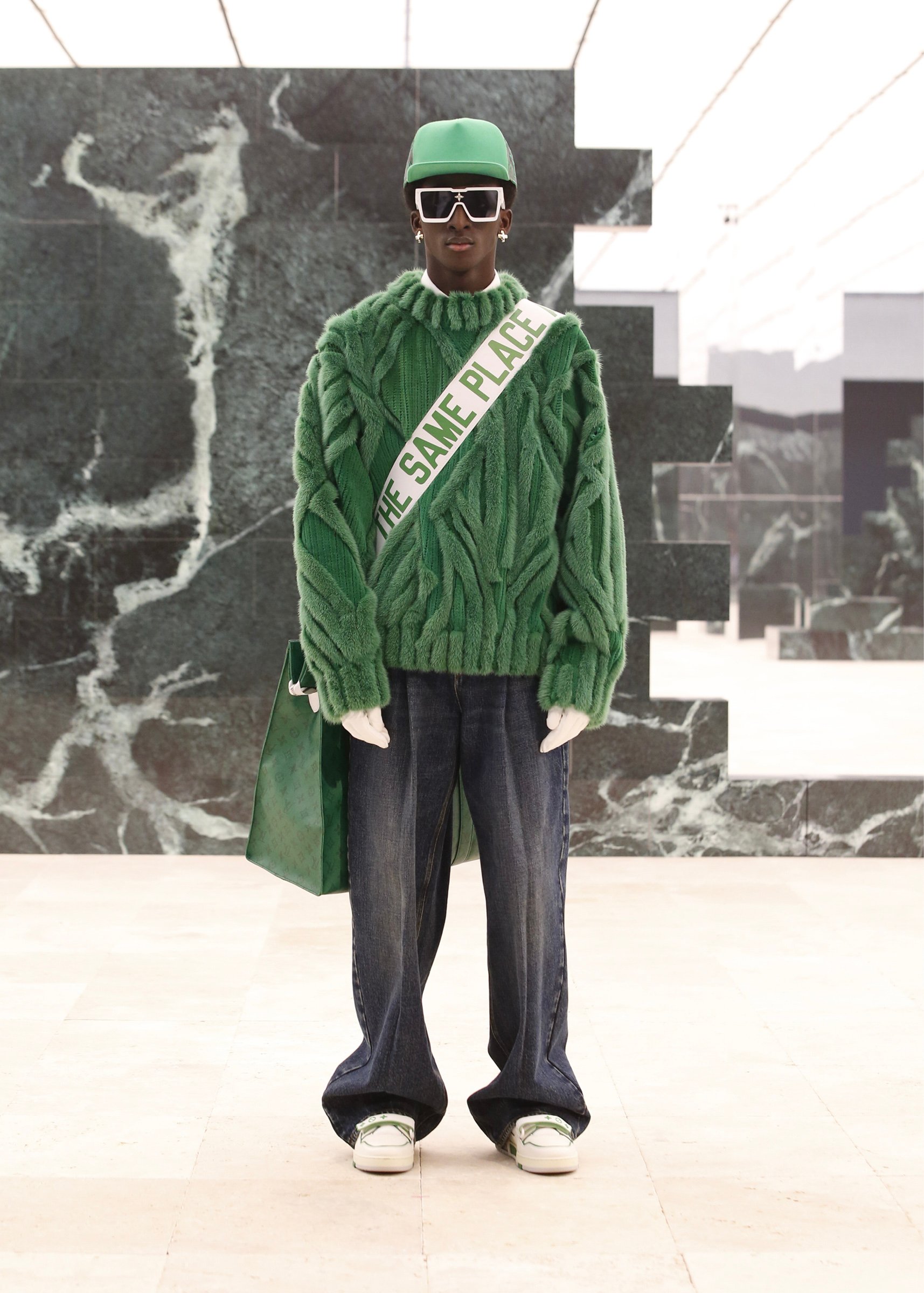 コレクションのキーカラーは、ガーナ国旗や自然回帰を連想させるグリーン。床に引きずる長さのトレンチコート、太畝のコーデュロイジャケット、世界地図と手書きのモノグラムがジャカードで表現されたモッズコートなど、様々なアイテムで提案されている。