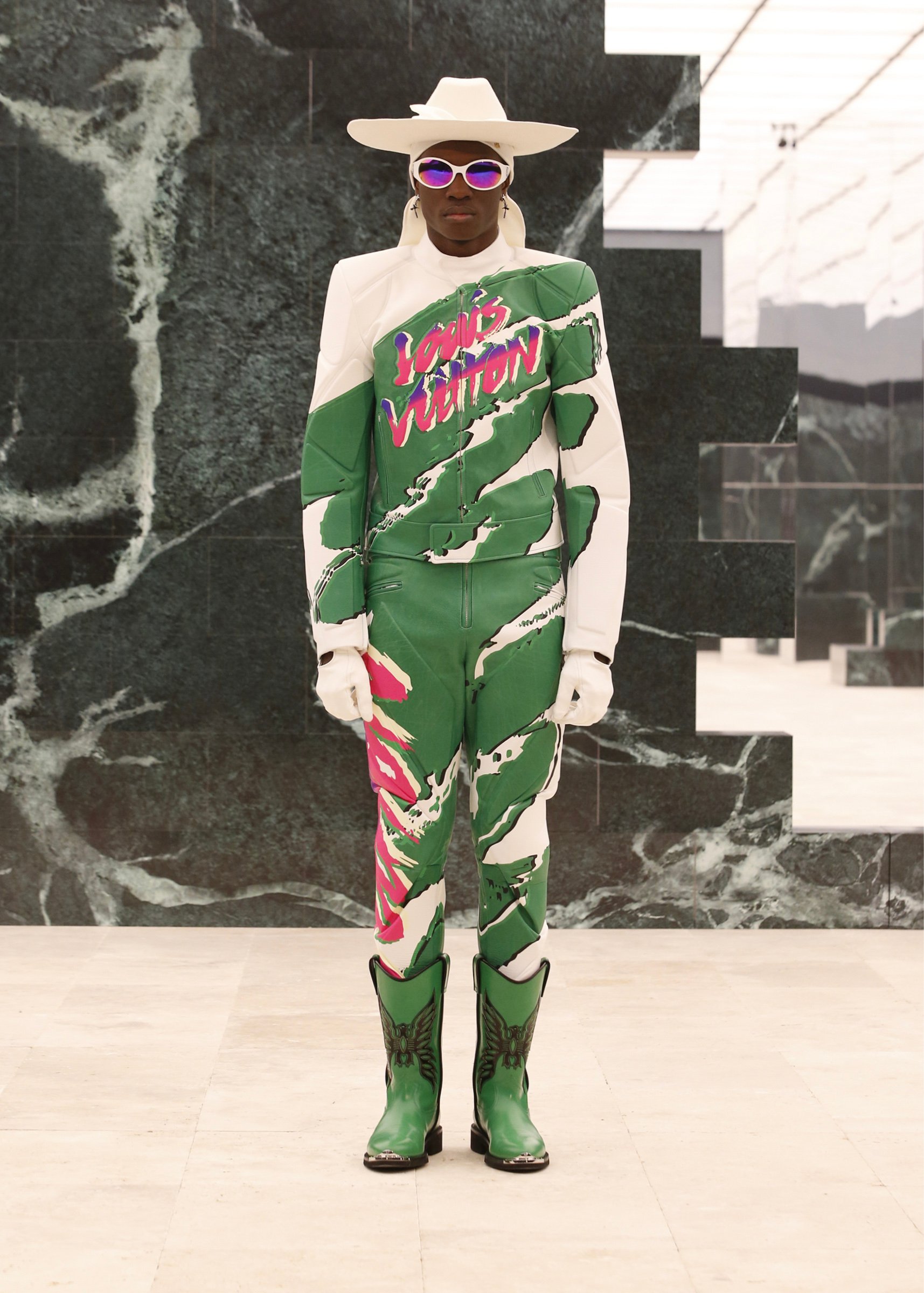 全体的に目立つのは、ウエスタン、カウボーイの要素。ヴァージルのシグネチャーブランドである「オフ-ホワイト」では以前から提案してきたウエスタンブーツ(正面にイーグルの焼印を施し、トゥは金属のチップで飾っている)と、ウエスタンベルトをスタイリングのポイントに使っていて、とくに極太ベルトの存在感は強烈だ。バイクのライディングスーツにウエスタンブーツを合わせた異質なスタイリングは、現代の馬=バイクを掛け合わせたのだろう。