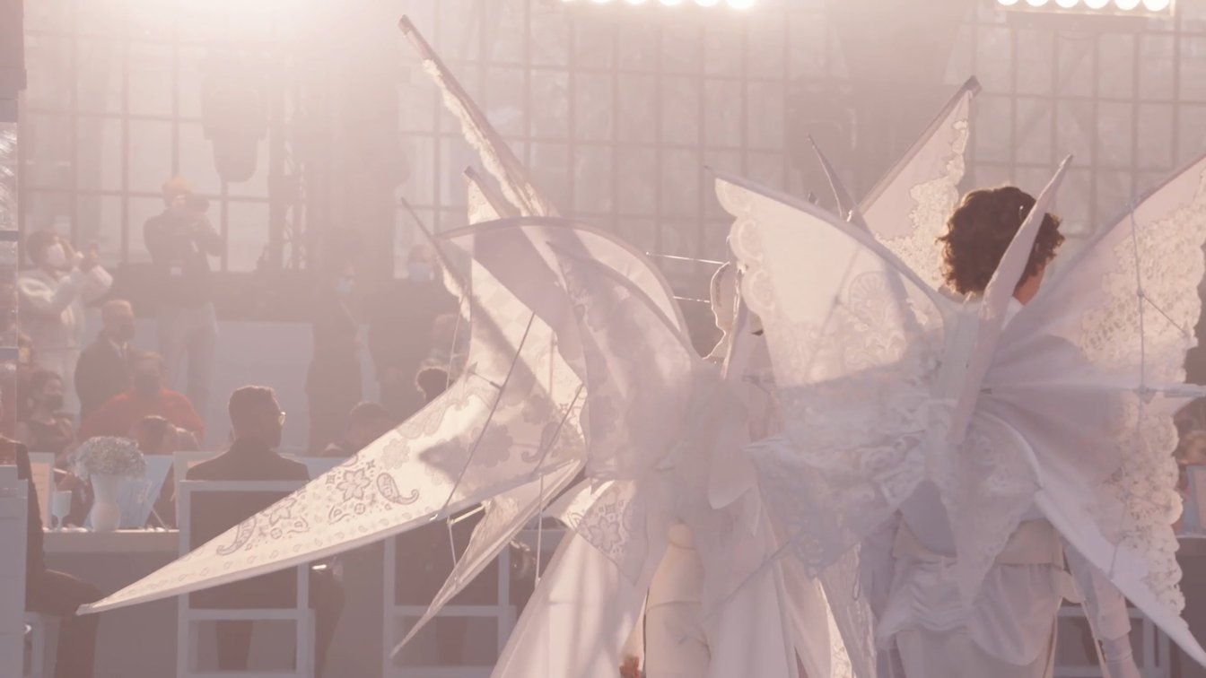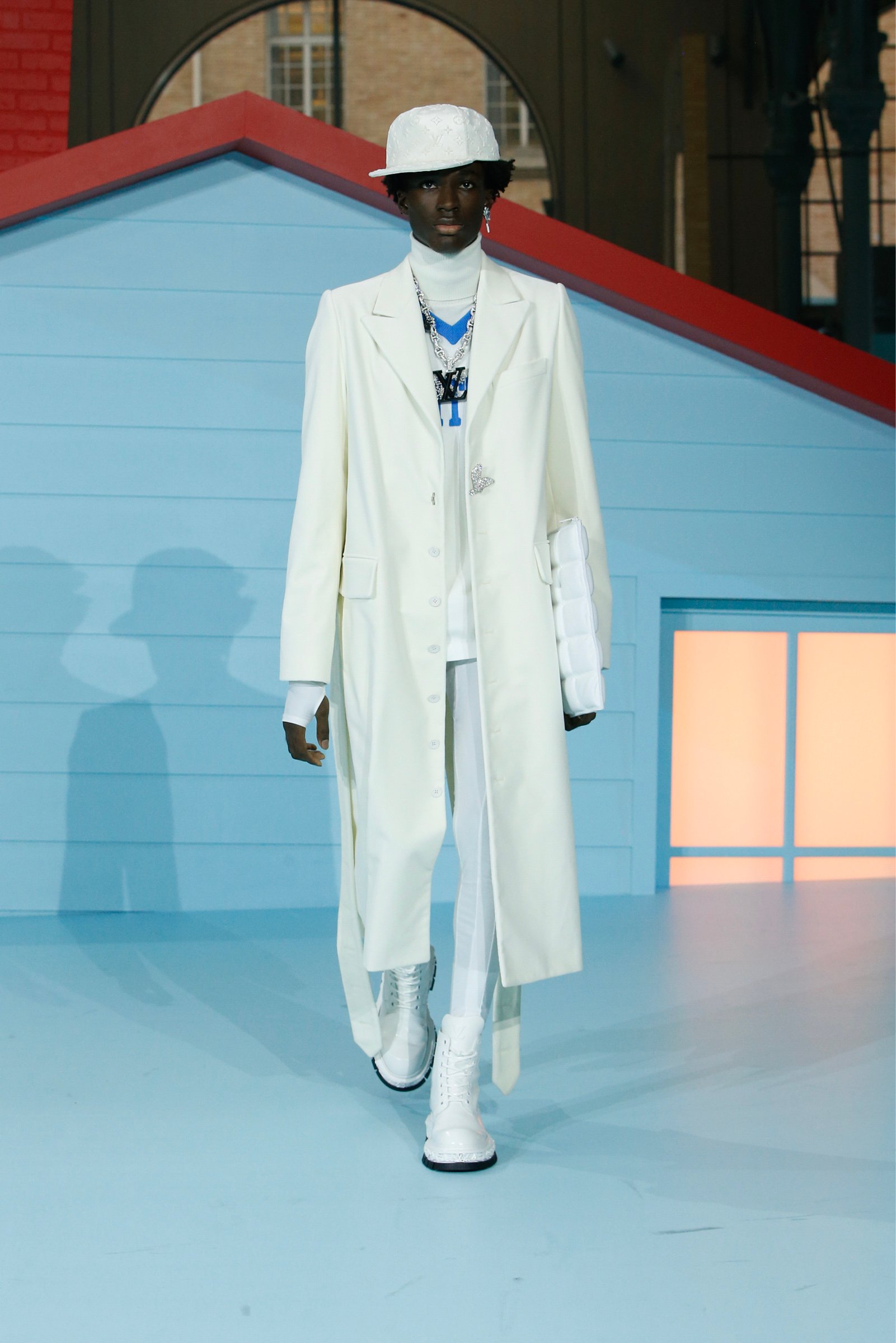 終盤は清らかな白一色のスタイルに一転。キャップとベール、スタジャンとチュールスカート、レギンスとクリノリンといった、ニュートラルなスタイルにスポーツやクチュールの要素を取り入れるバランスは、ヴァージルならでは。繊細なレースの羽根をつけた3ルックは天使のような装いで、ロマンティシズムのムードを引き立てた。また「空を飛ぶ」というモチーフは、ヴァージルのコレクションにたびたび用いられてきた子どもの憧れを象徴している。