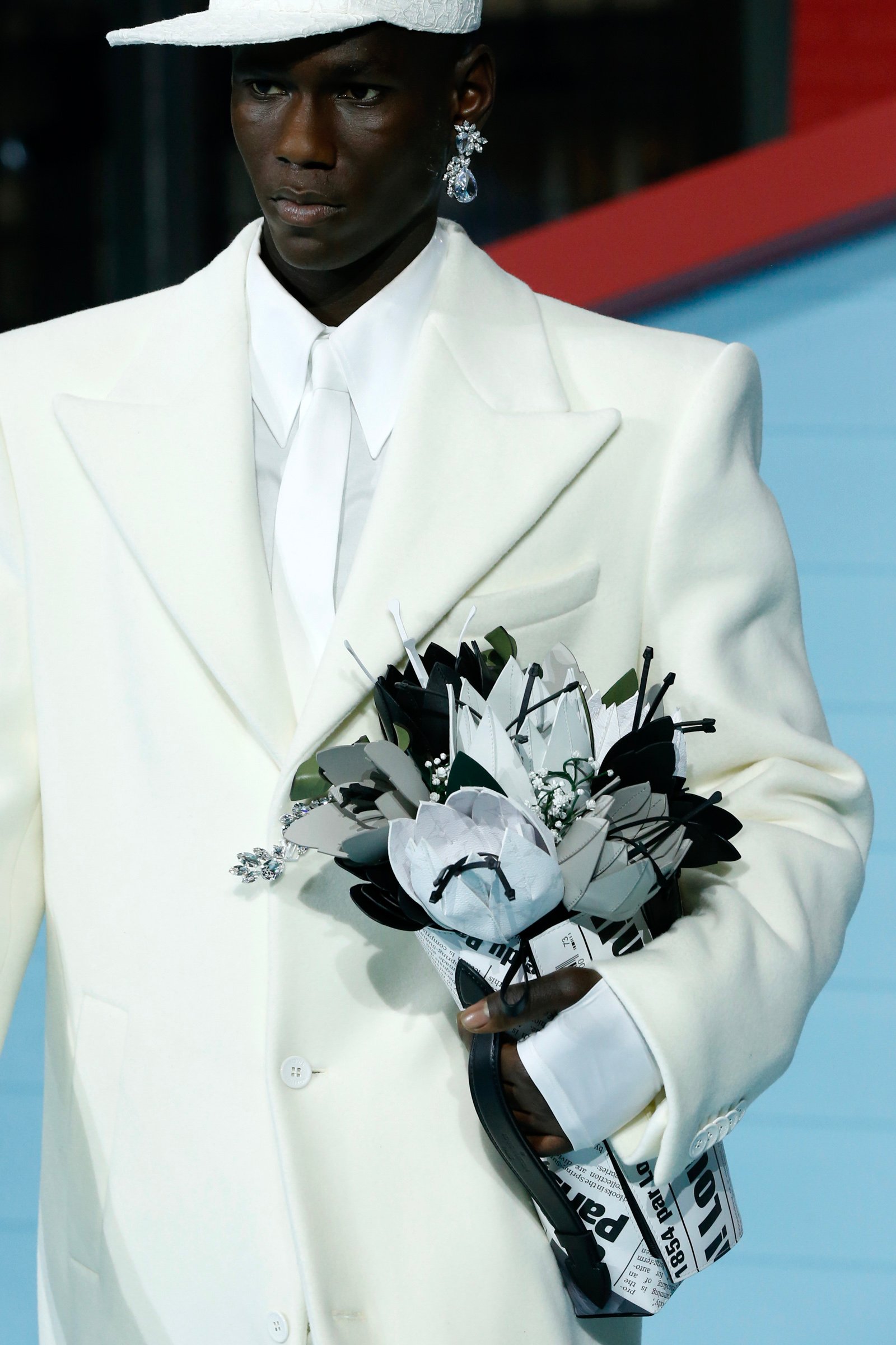 ファーストルックは、ヴァージルが毎シーズン独自のフォルムで提案してきたテーラードスーツ。張り出した肩と絞られたウエストのコントラストは、オリンピアンの超人的なシルエットを意識したという。ブラックやパープル、ホワイトといったワントーンルックをはじめ、ベルベッドやサテン、タペストリー調の花柄といった様々なテキスタイルで提案。メッシュ状の白いレースをレイヤードしたフェミニンなスタイルも登場した。