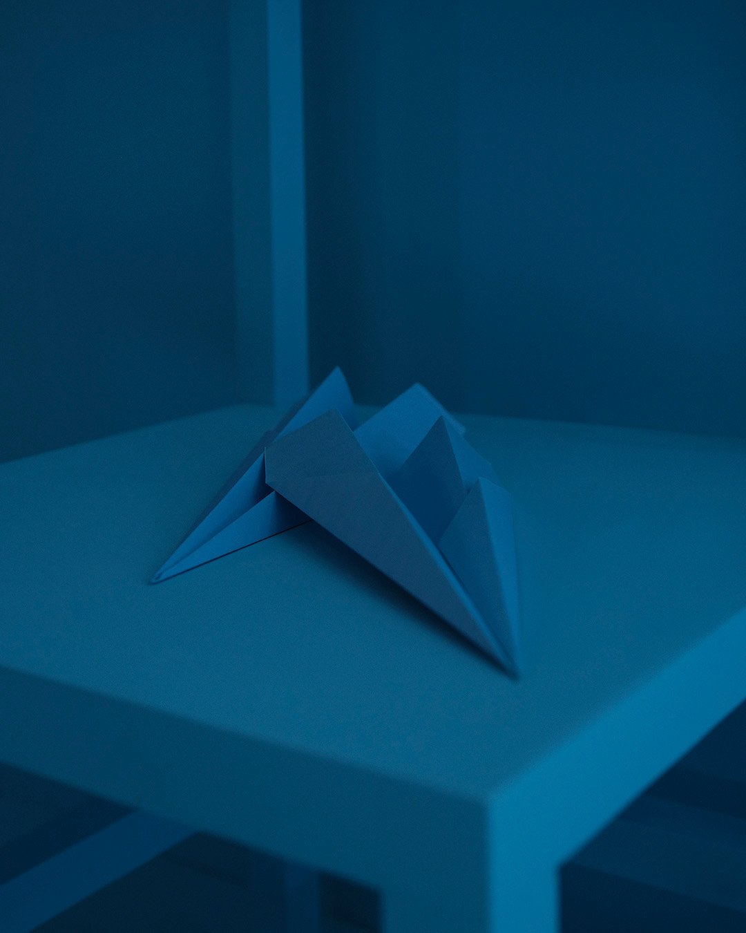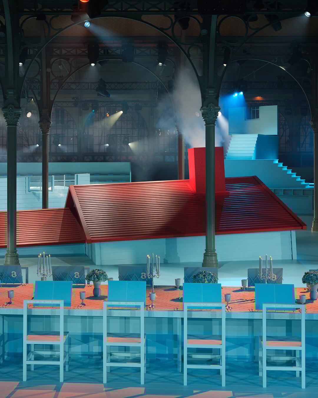 会場内は薄いブルーに彩られ、赤い屋根や玄関、ベッドルームといったバラバラになった家のオブジェ、そしてオーケストラが座る長いダイニングテーブルを設置。ショーの序盤は、階段とトランポリンを使ったヨアン・ブルジョアによるパフォーマンスが、時間を繰り返し巻き戻すようなシュールレアリスムの世界を演出した。