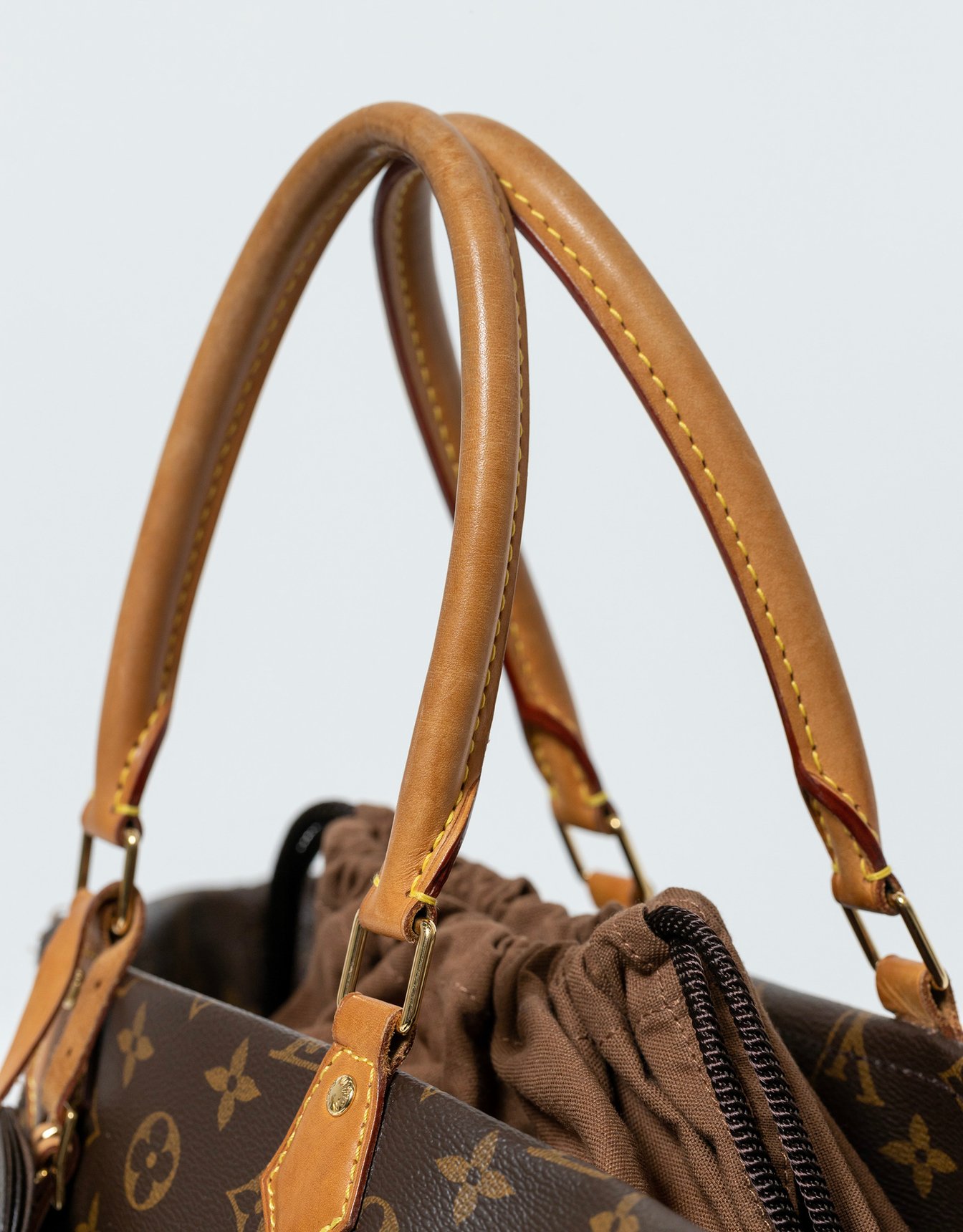 横幅33cm・縦幅42cm・奥行14cmの手頃なサイズで、付属するコットン製の巾着は外すことも可能。素のモノグラム・キャンバスの素材感と、収納物が中から見える様を楽しめる。耐久性と機能性も十分で、放り込んだ物が穴から落ちてしまったことなど両手で数えるくらいしかない。インバッグのポーチがもはやバッグ本体と言って差し支えないが、バッグ本体を包装するために用意された「R.K.」のイニシャル入り大型巾着袋がもう1つ付いていた。