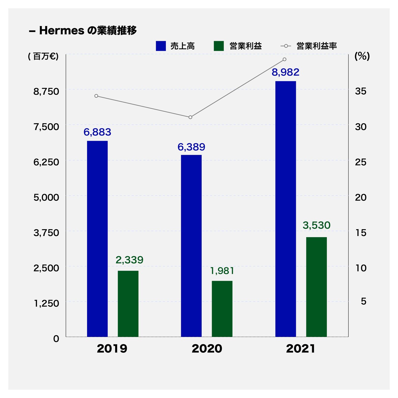 エルメス・インターナショナル(以下、エルメス)も競合他社同様、好調な2021年であった。売上高は前年比42%増、コロナ禍以前の2019年比では33%増となった。