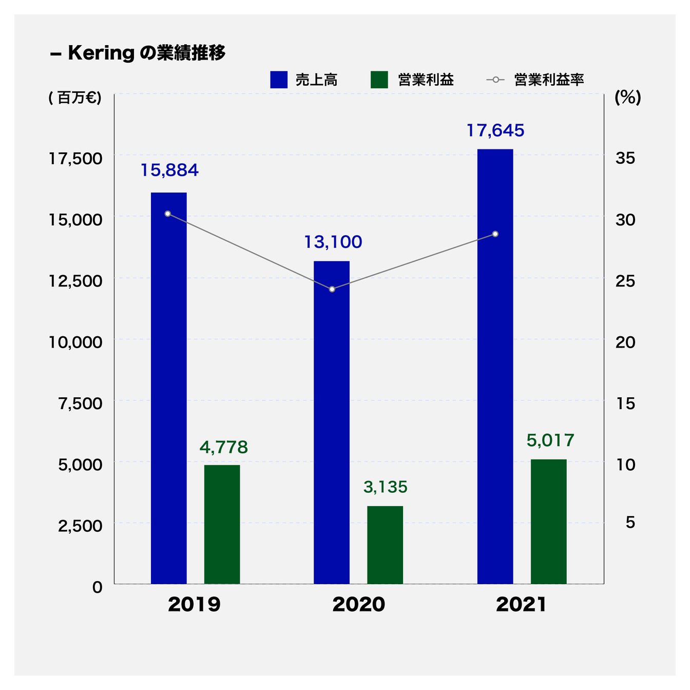 ケリングも売上高は前年比35%増と2桁成長をしているが、LVMHやエルメスと比較するとやや劣る水準だ。