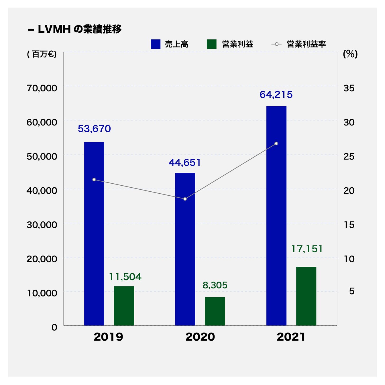 LVMH モエ ヘネシー・ルイ ヴィトン グループ(以下、LVMH)の2021年度通期決算は、市場予想を上回って売上高前年比44%増と好調に推移。コロナ禍以前の2019年度と比較しても2桁成長を達成した。