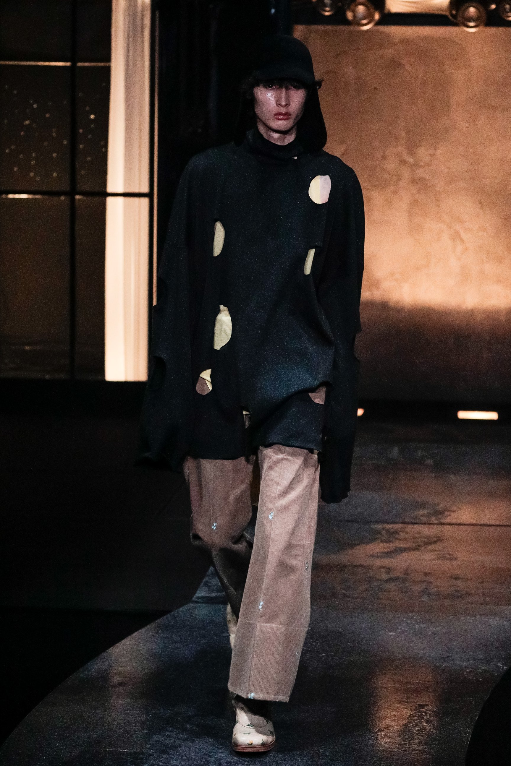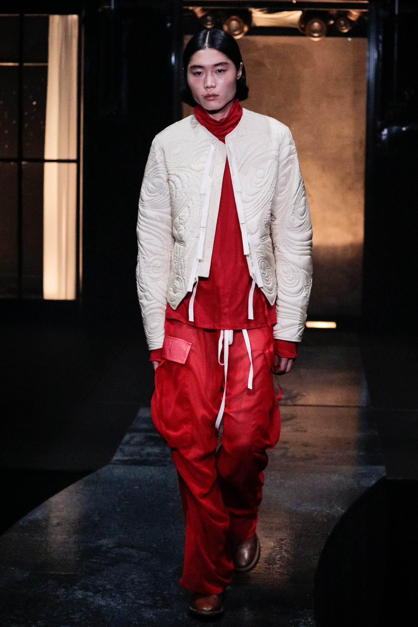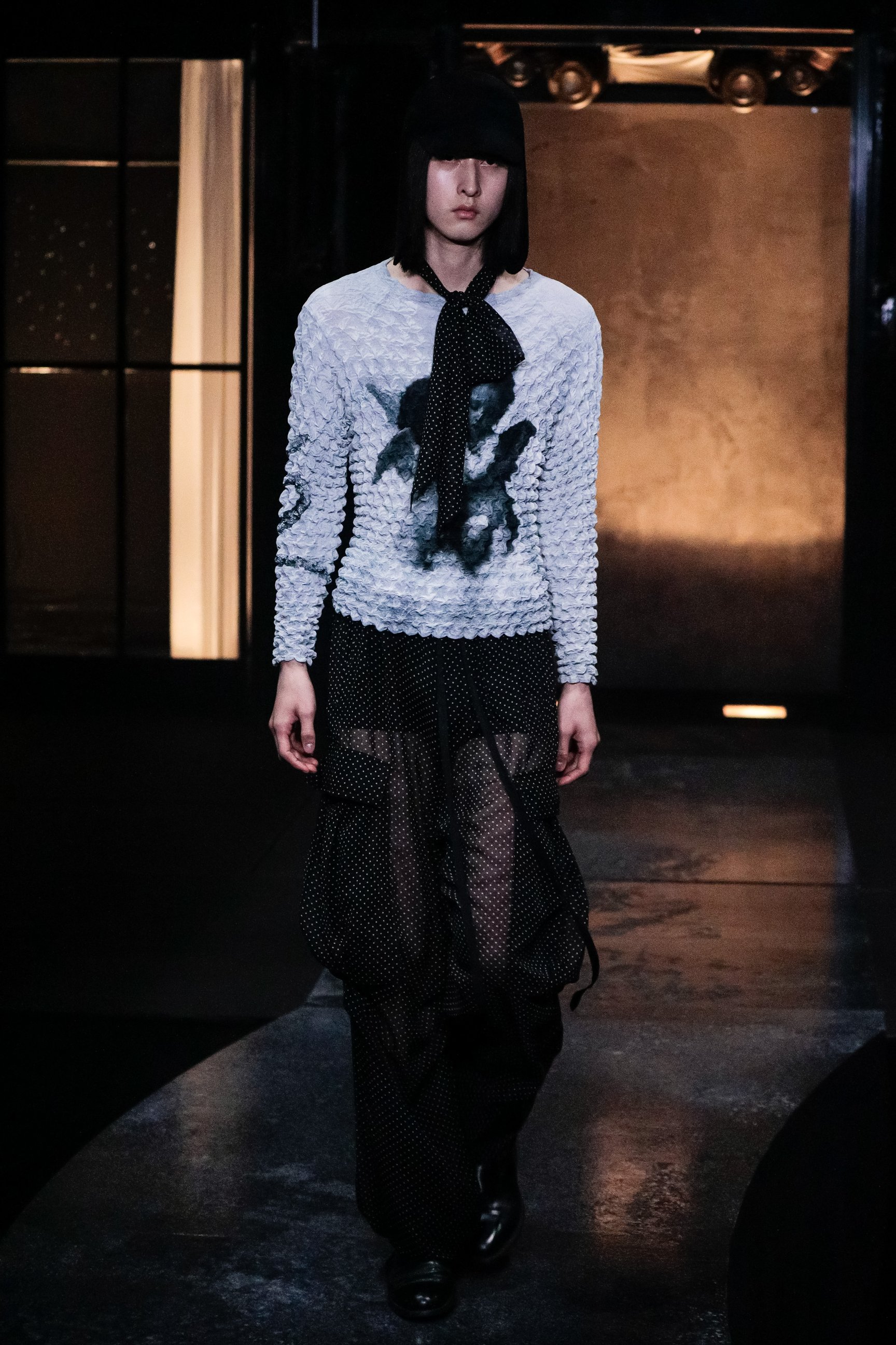 ショーの序章は、紗幕に投影した映像。ファーストルックを務めたモデルのYUKIが性別に葛藤した幼少期の回想を元に、Shu Sasakiが制作したストーリーで幕を開けた。明かりの灯った家を模したセットから、モデルが舞台に登場。絞り加工を施したトップスや、花の刺繍をあしらったコーデュロイパンツ、四つ葉のクローバーのチャームを付けたコート、ドット柄のシースルージャケットなどを発表した。ウィメンズに用いられるディテールや表情豊かなテクスチャーがジェンダーフルイドの印象を与え、それぞれのスタイルに異なる個性をまとわせている。フィナーレでは、天井からYUKIが乗った舞台がゆっくりと下降し、映像の過去とショーの現在のクロスオーバーを表現した演出で幕を閉じた。