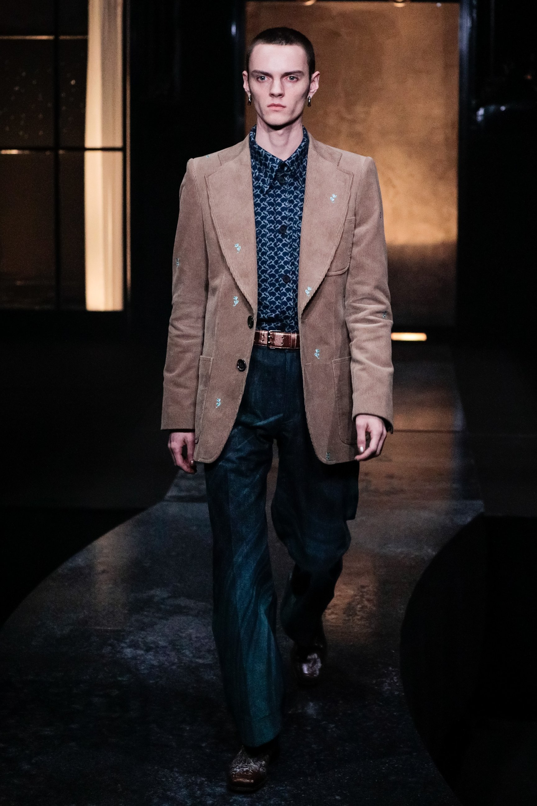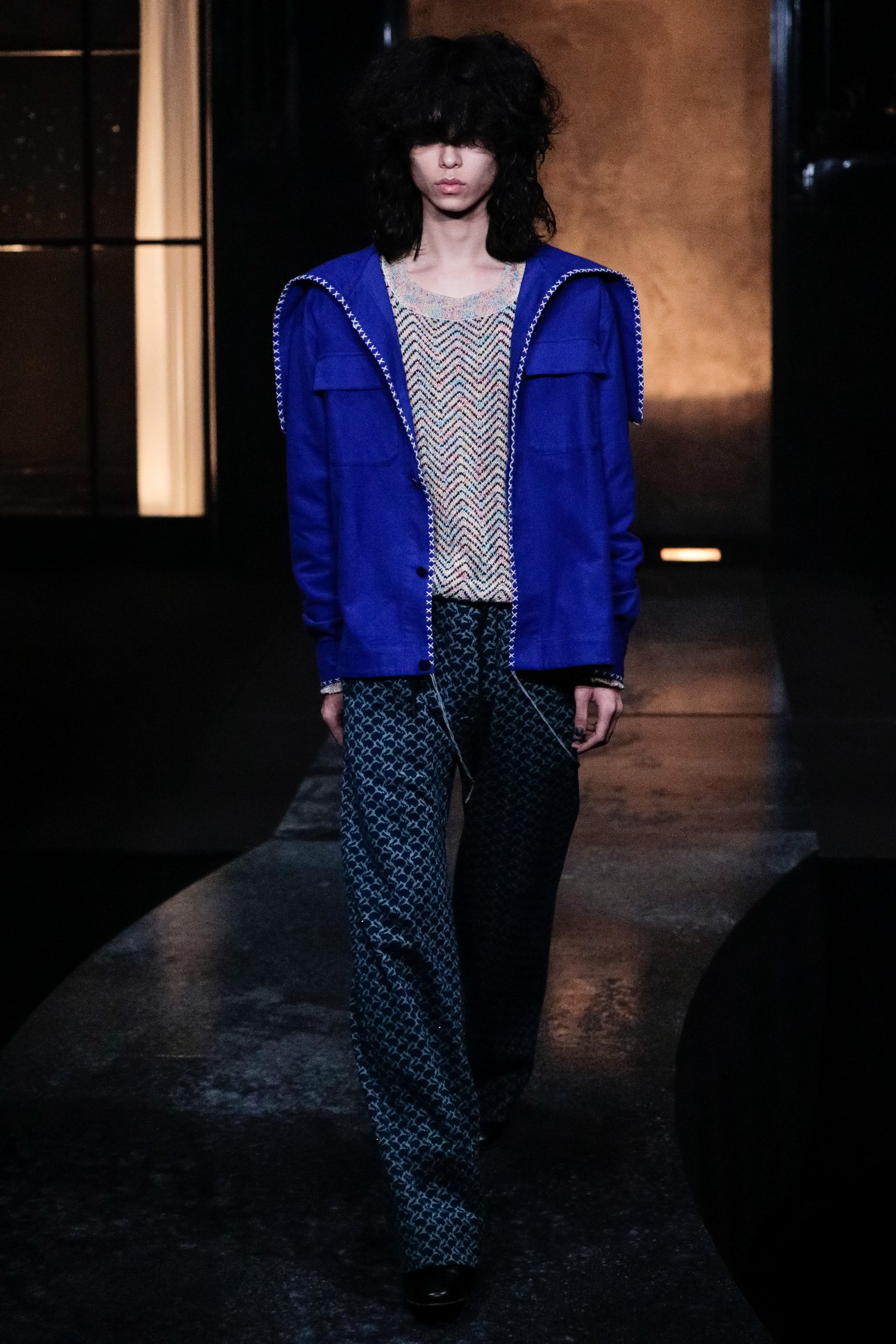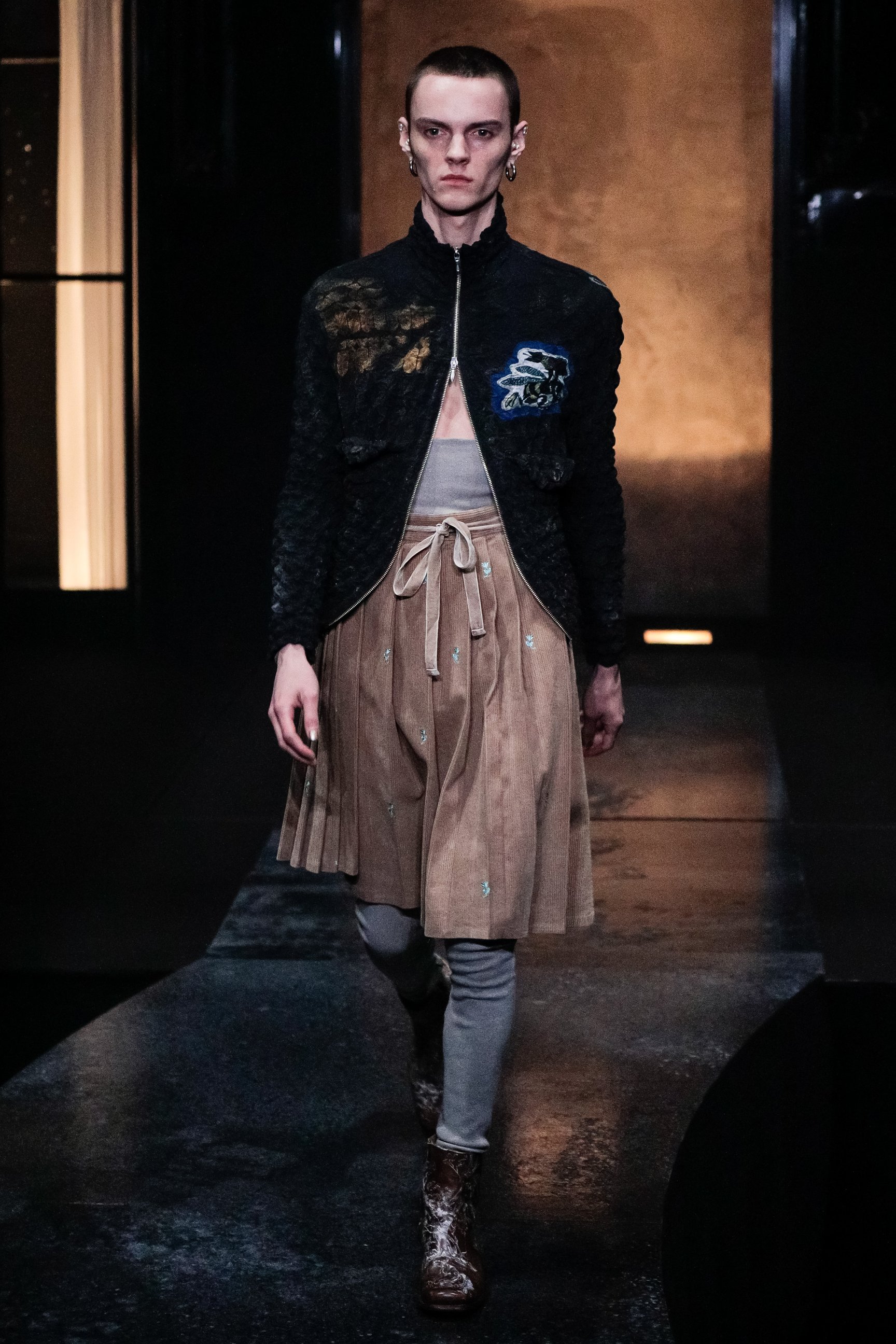 ショーの序章は、紗幕に投影した映像。ファーストルックを務めたモデルのYUKIが性別に葛藤した幼少期の回想を元に、Shu Sasakiが制作したストーリーで幕を開けた。明かりの灯った家を模したセットから、モデルが舞台に登場。絞り加工を施したトップスや、花の刺繍をあしらったコーデュロイパンツ、四つ葉のクローバーのチャームを付けたコート、ドット柄のシースルージャケットなどを発表した。ウィメンズに用いられるディテールや表情豊かなテクスチャーがジェンダーフルイドの印象を与え、それぞれのスタイルに異なる個性をまとわせている。フィナーレでは、天井からYUKIが乗った舞台がゆっくりと下降し、映像の過去とショーの現在のクロスオーバーを表現した演出で幕を閉じた。