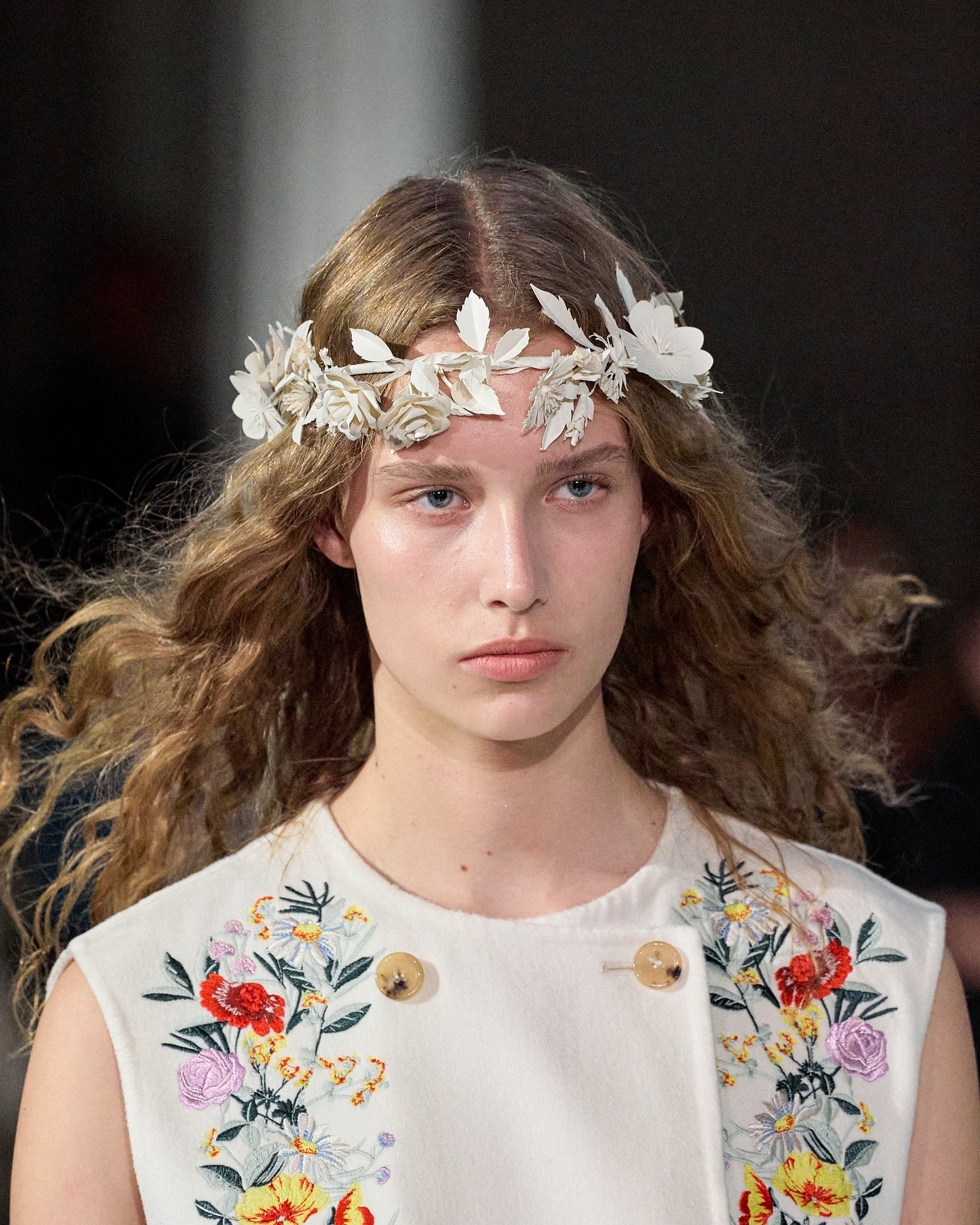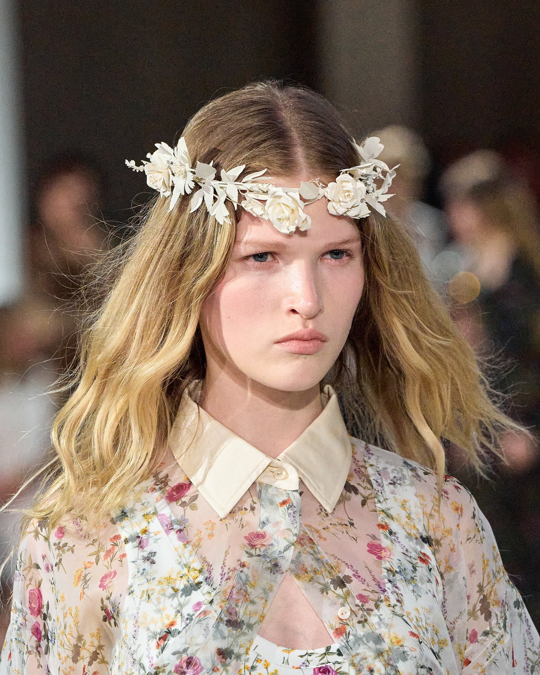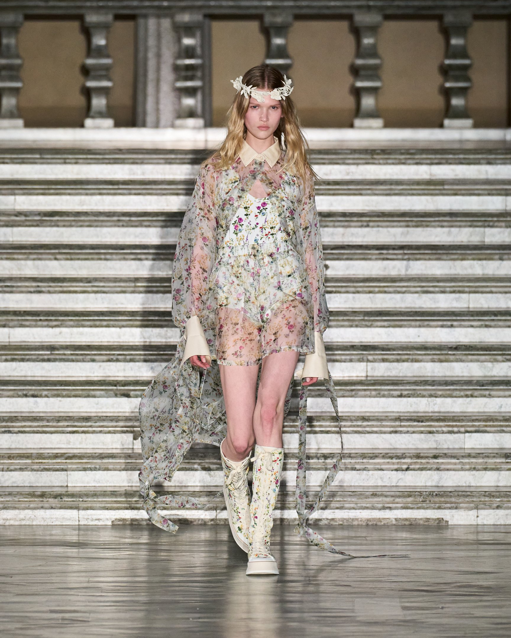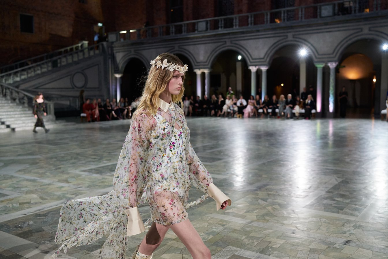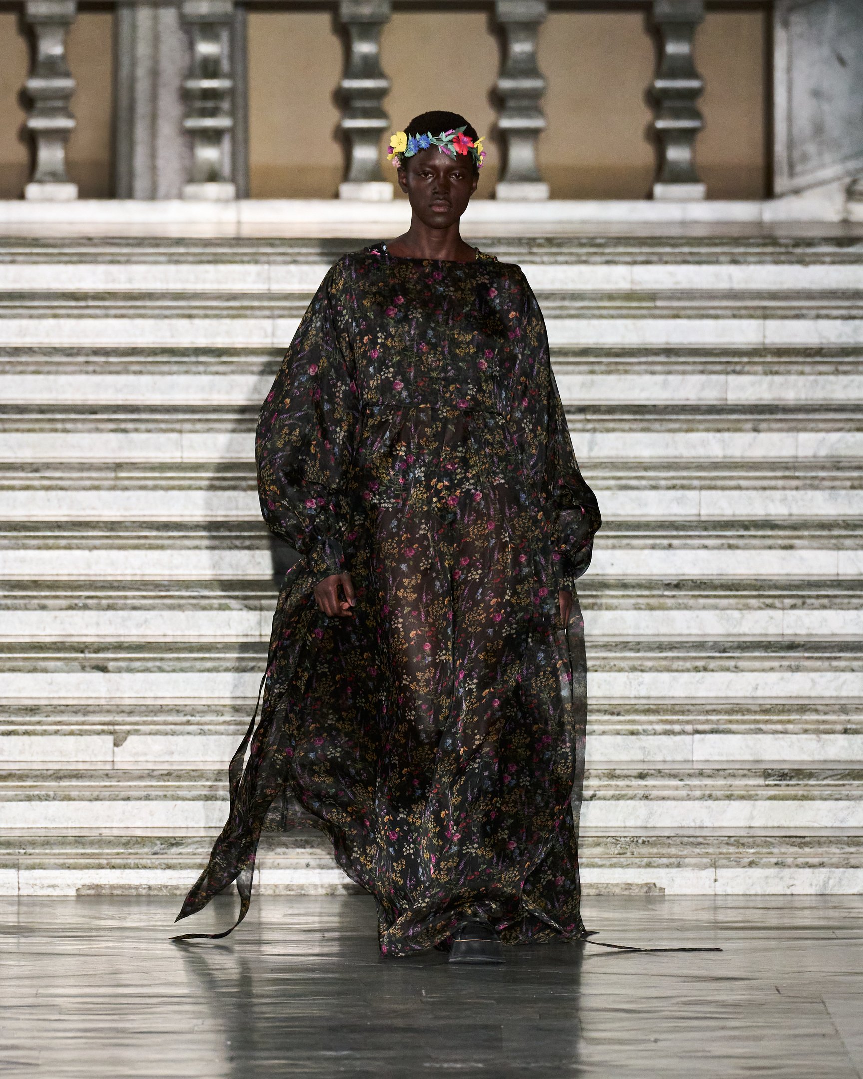 モデルたちが被っていた花冠は、テーマの「セプテム・フローレス(Septem Flores)=7種類の花」と呼応。夏の訪れを祝う民俗祭「ミッドサマー」の伝統では、7種類の野の花を見つけた者がそれを枕の下に置いて眠ると、将来の恋人の夢を見られると言われている。その言い伝えをもとに、色とりどりに描かれた花々がファンタジックな世界観を演出した。