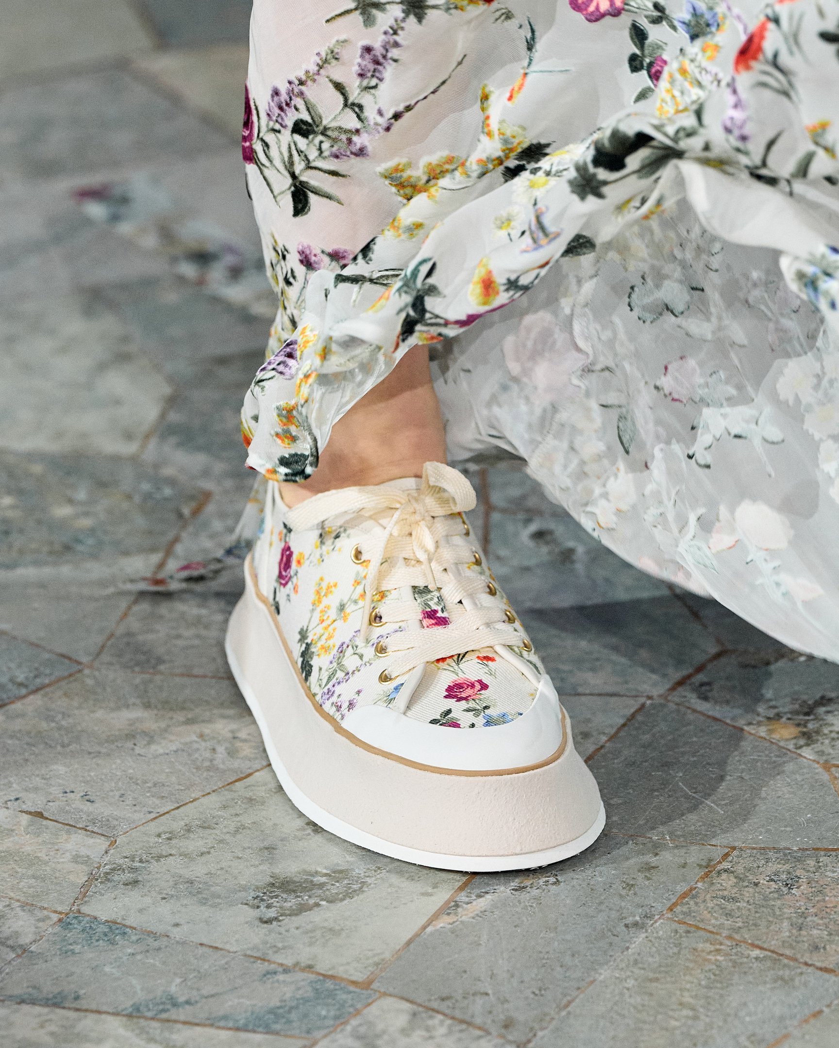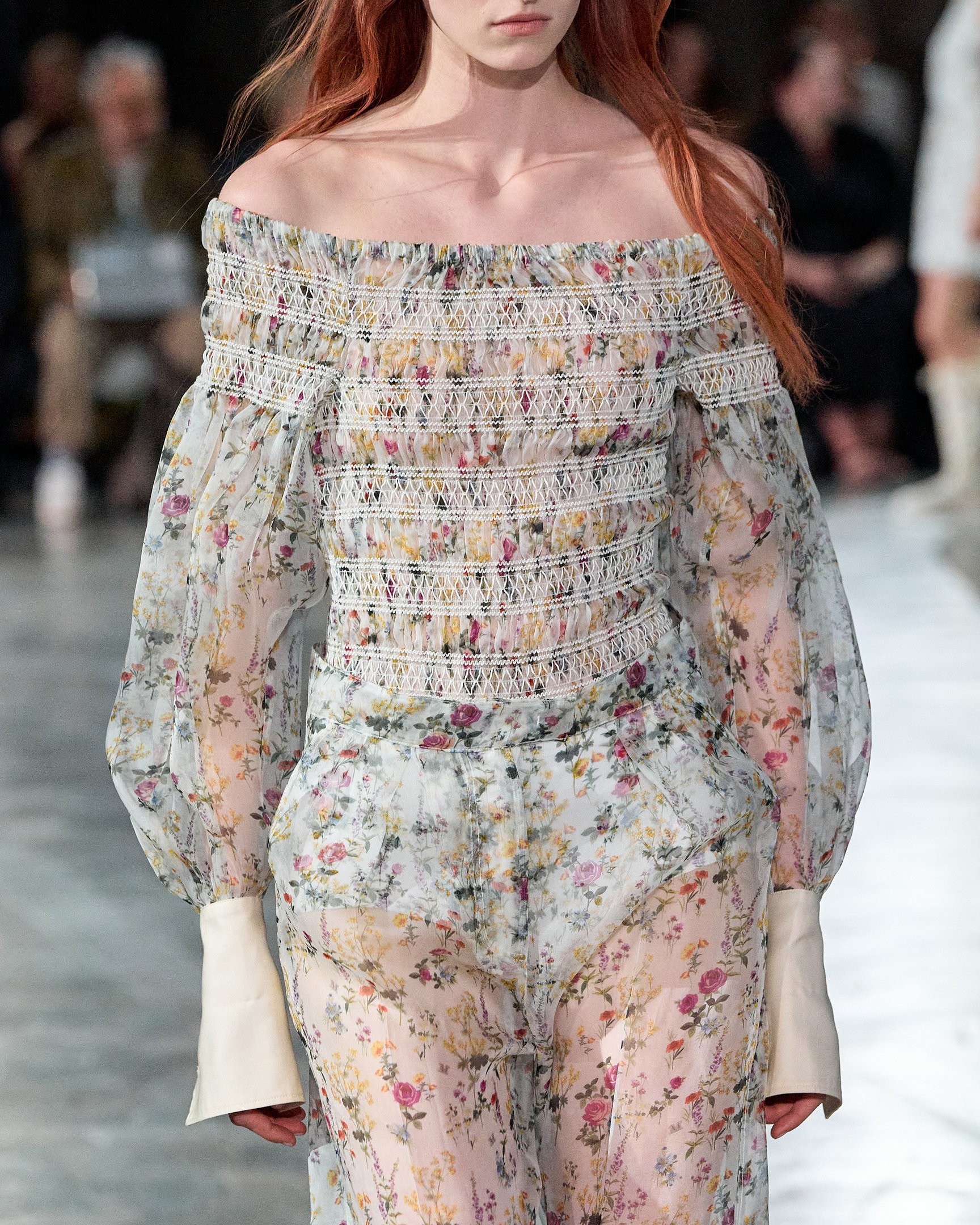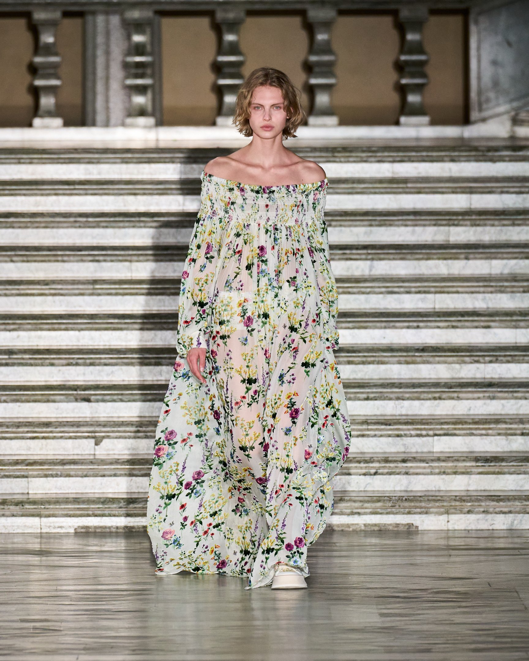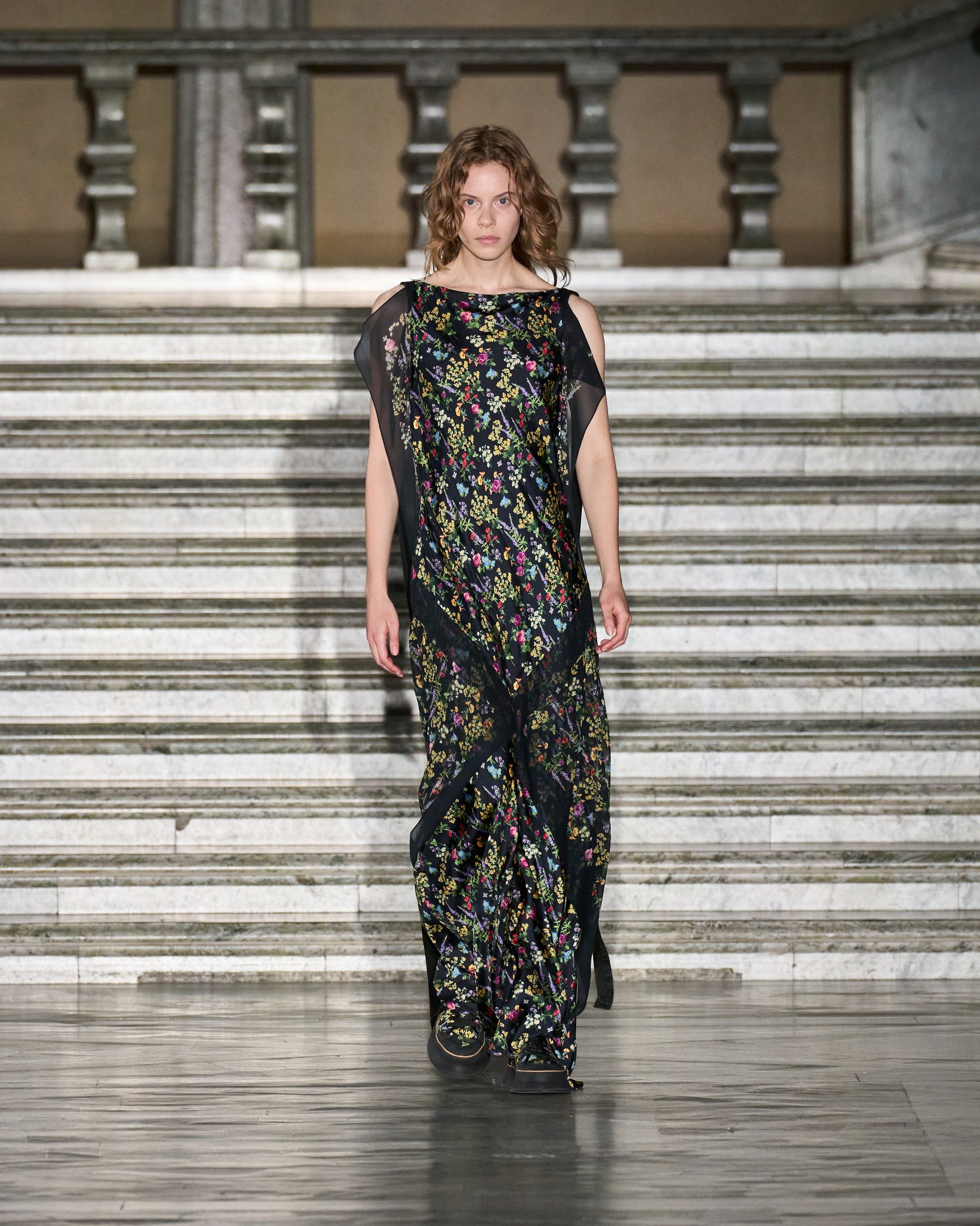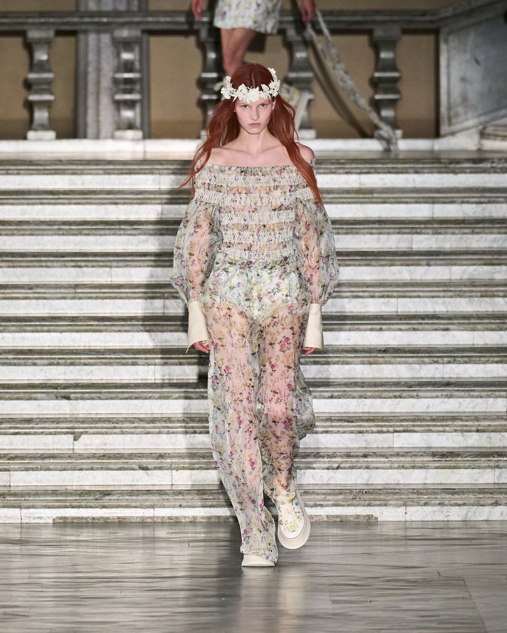 モデルたちが被っていた花冠は、テーマの「セプテム・フローレス(Septem Flores)=7種類の花」と呼応。夏の訪れを祝う民俗祭「ミッドサマー」の伝統では、7種類の野の花を見つけた者がそれを枕の下に置いて眠ると、将来の恋人の夢を見られると言われている。その言い伝えをもとに、色とりどりに描かれた花々がファンタジックな世界観を演出した。
