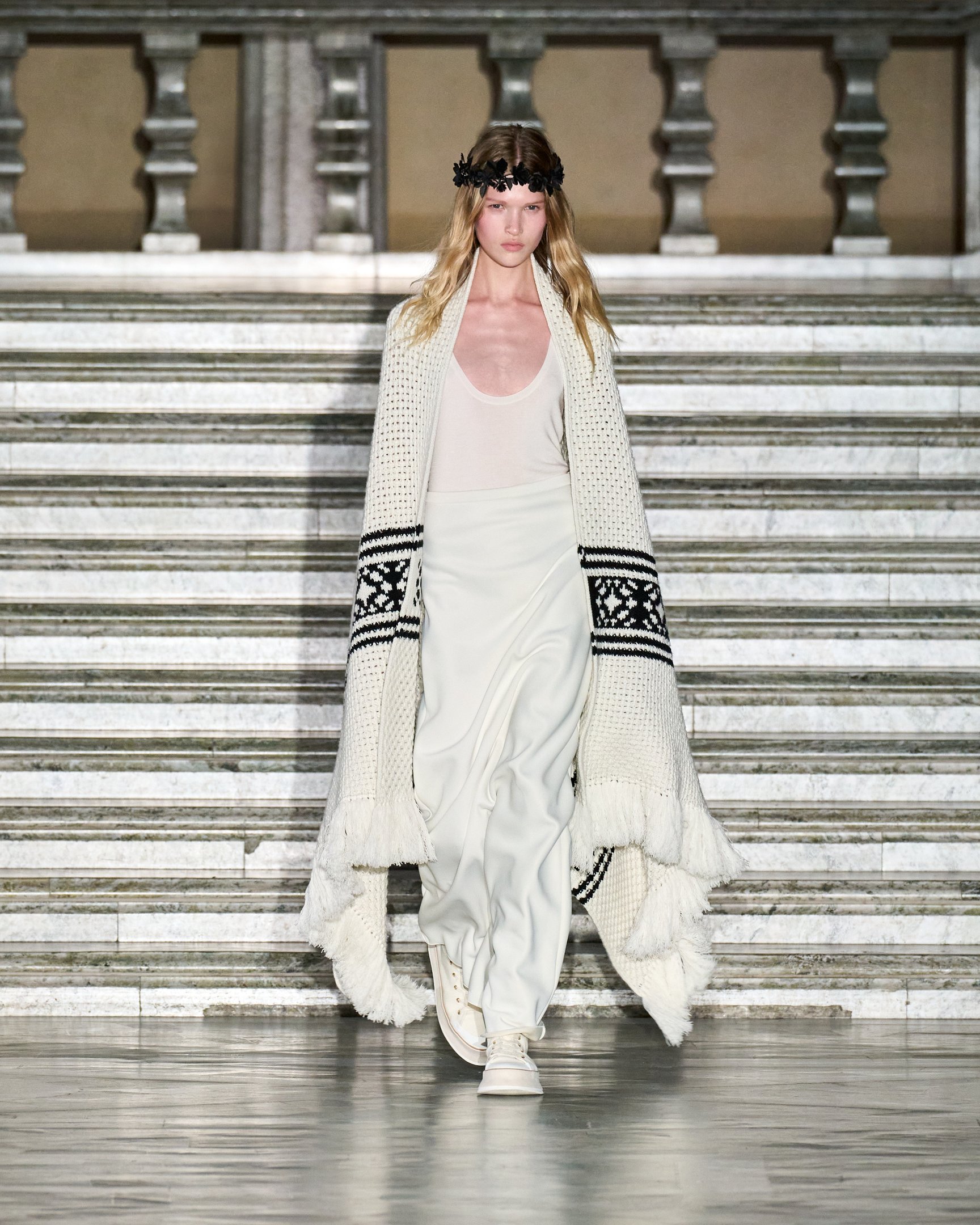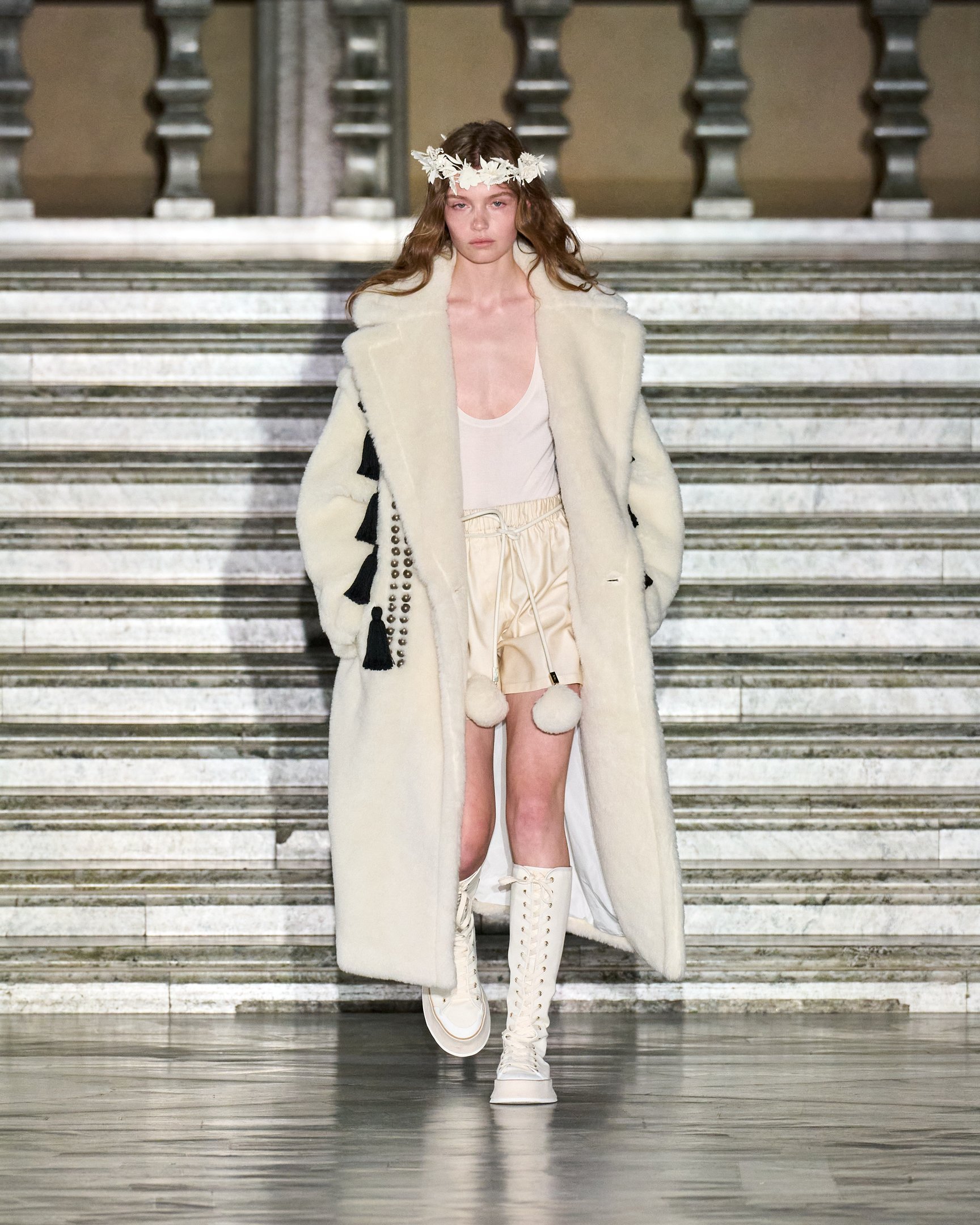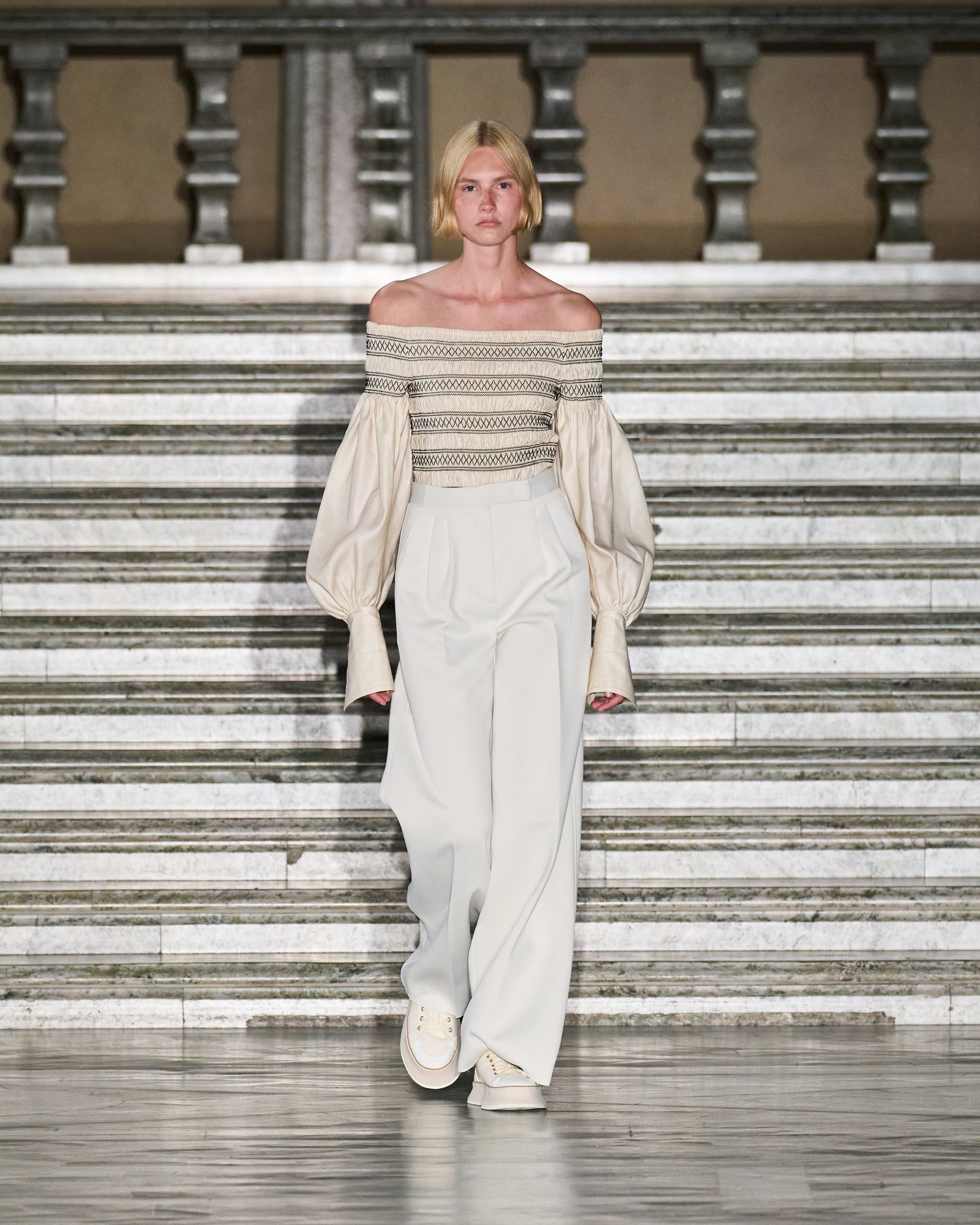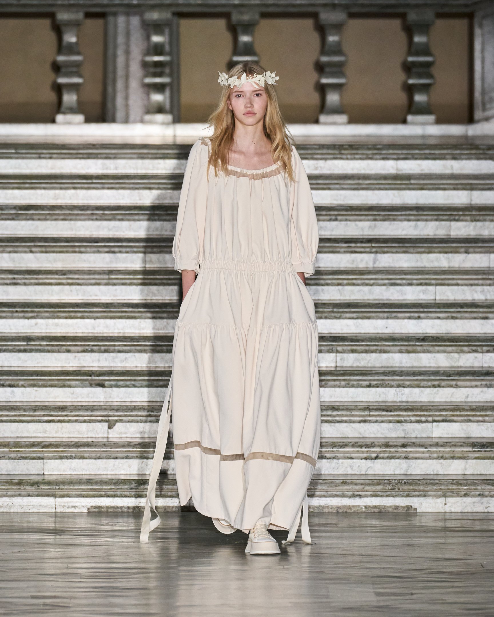 メゾンのフレンズであるローラは「ベージュの優しいトーンのアイテムや花柄がたくさん入ったリゾートアイテムが出てきて、すごくかわいい」とコメント。そのほかデミ・ムーア(Demi Moore)やリリー・コリンズ(Lily Collins)、エイミー・アダムス(Amy Adams)らも来場し、マックスマーラが描く神秘と魔法に包まれた世界を堪能した。ショー前夜には、ストックホルム群島の一つ、スヴァルツォ・クロッグ島にてウェルカムディナーを開催。ゲストも白いドレスや花冠をまとい、白夜に包まれながら北欧の短い夏の訪れを祝った。