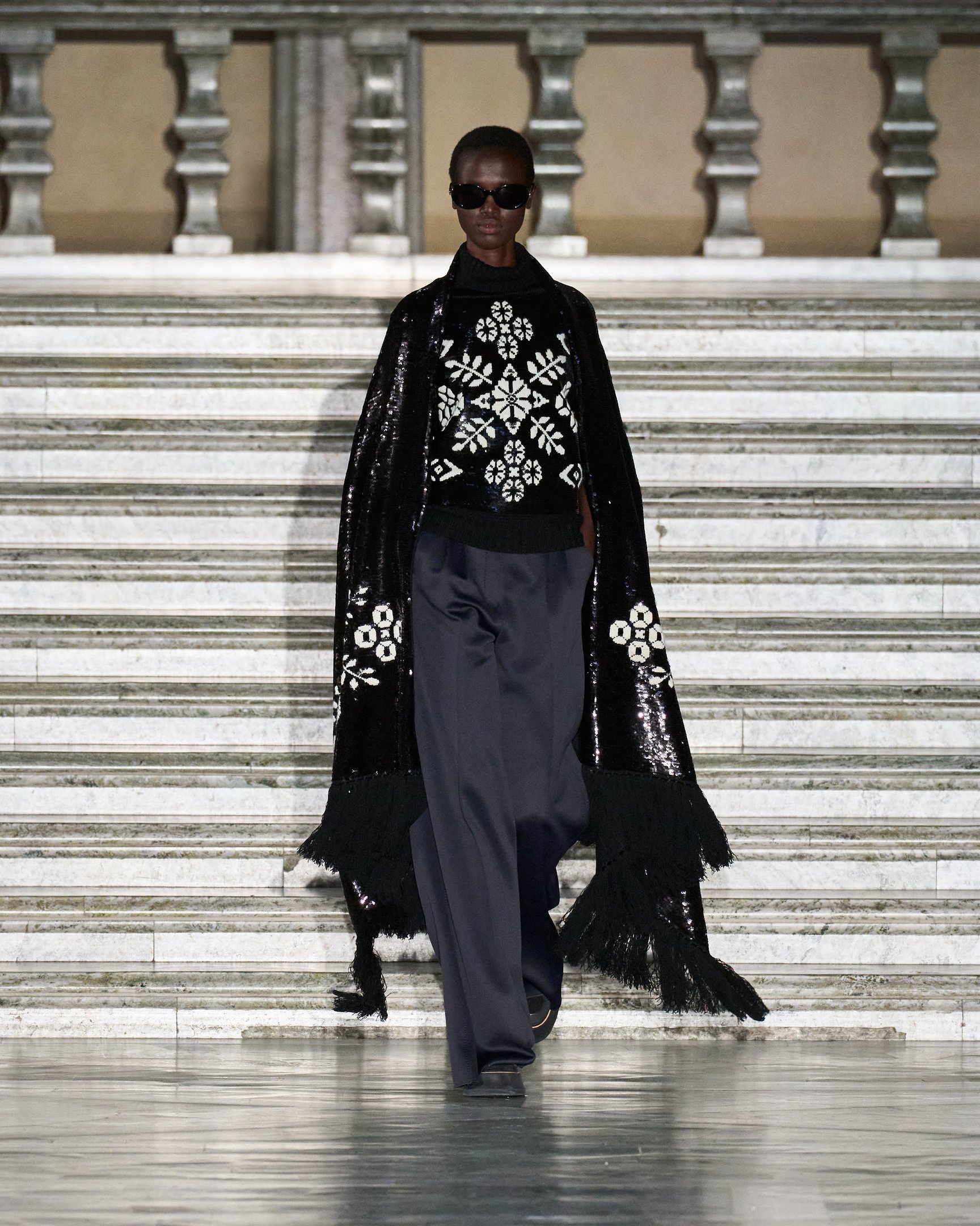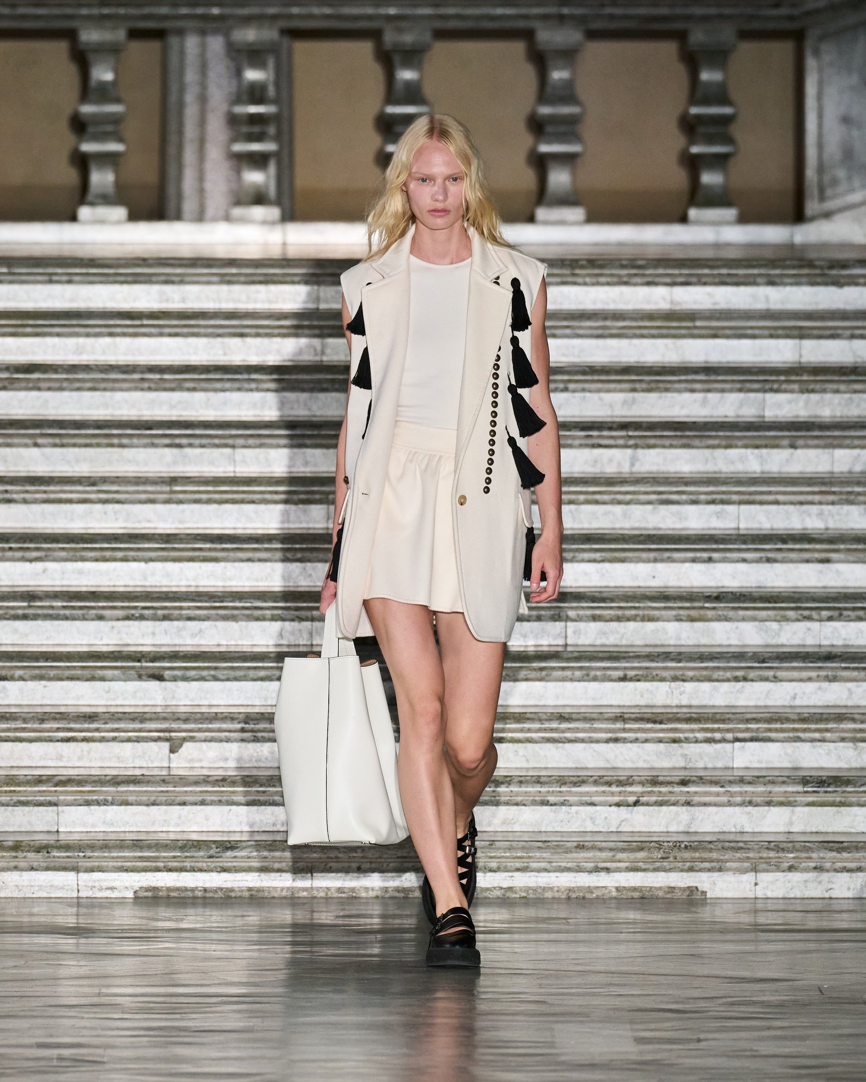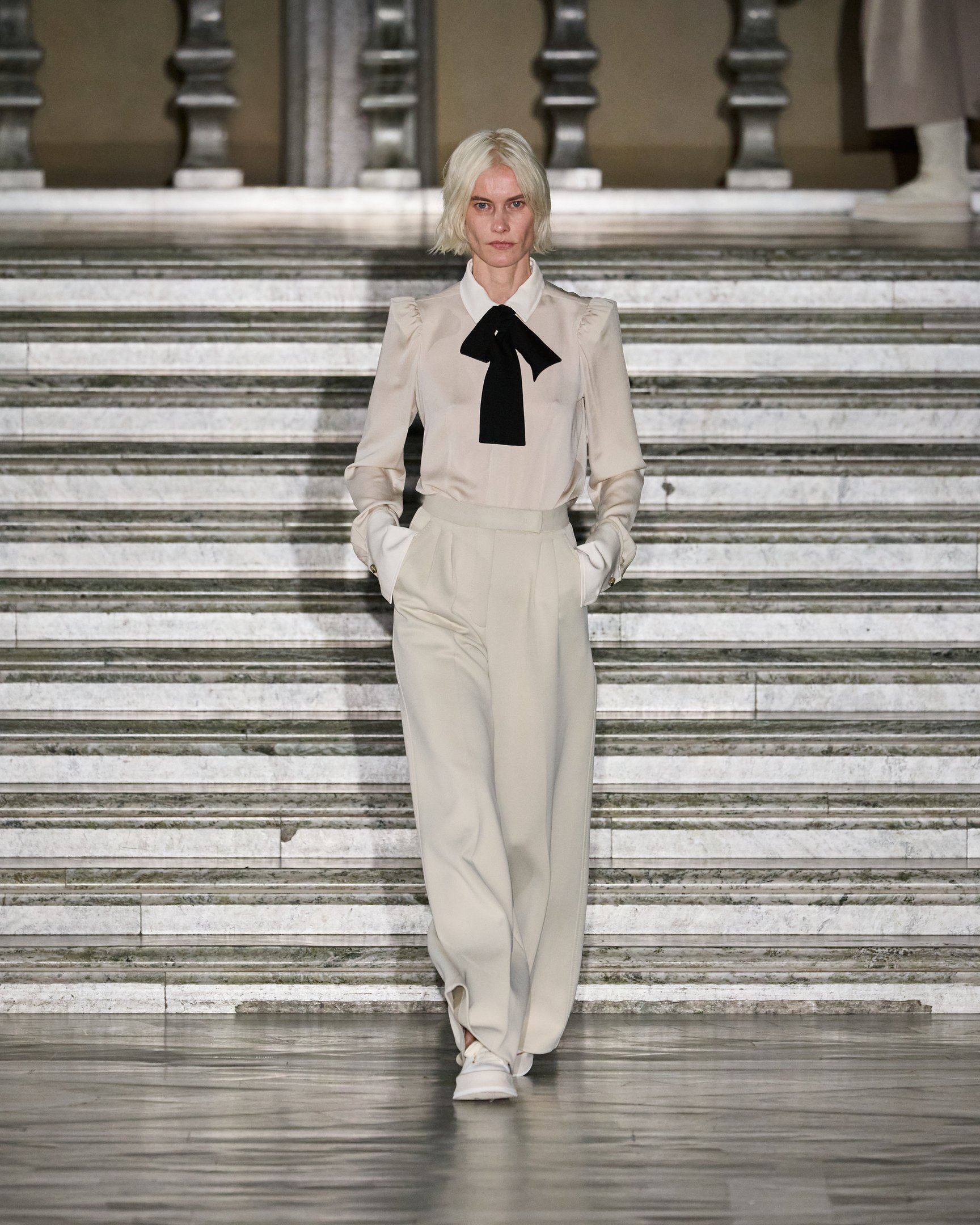 クリエイティブ・ディレクター、イアン・グリフィス(Ian Griffiths)が手掛ける「マックスマーラ(Max Mara)」が、スウェーデンで2024年リゾートコレクションを発表した。イタリアを代表するブランドの一つだが、今回の舞台はストックホルム市庁舎。ノーベル文学賞やノーベル科学賞の記念晩餐会が開かれるアイコニックな会場を、神秘的なムードのモデルたちがウォーキングした。