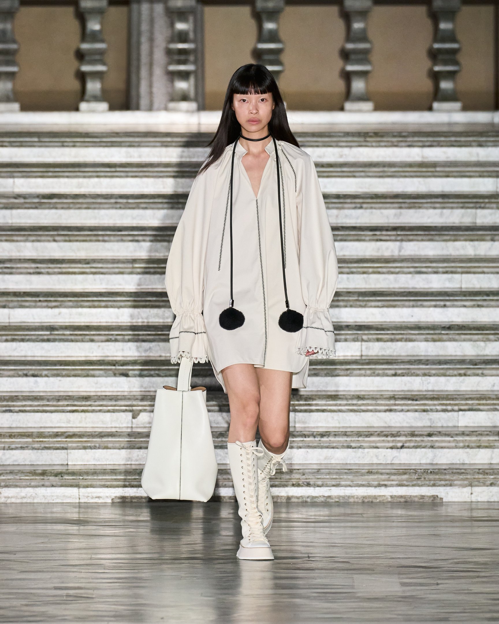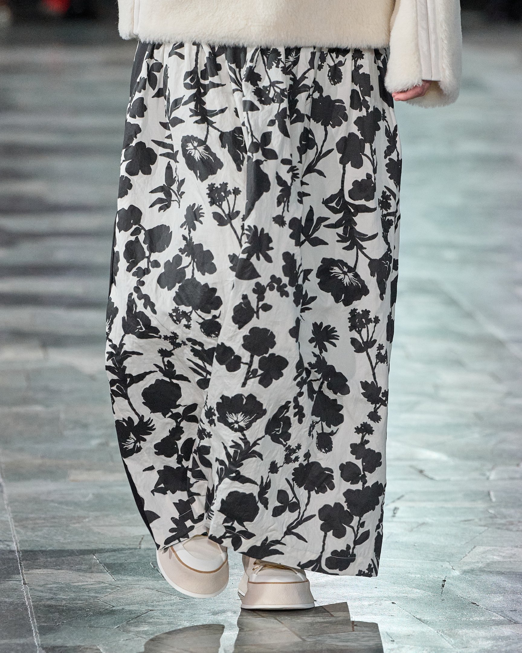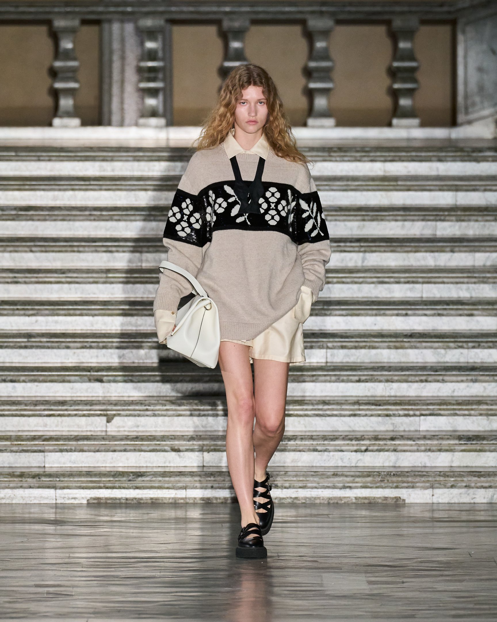 しかし、古典的なフォークロアスタイルに陥らず、リアルクローズとして着こなせるのはシンプルなシューズ&バッグを取り入れたスタイリングのおかげ。モノトーンのグラフィックやロングカフスなどもアクセントとなり、都会的なルックに落とし込まれた。
