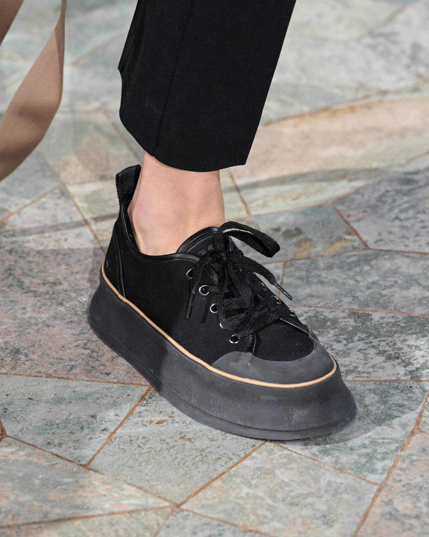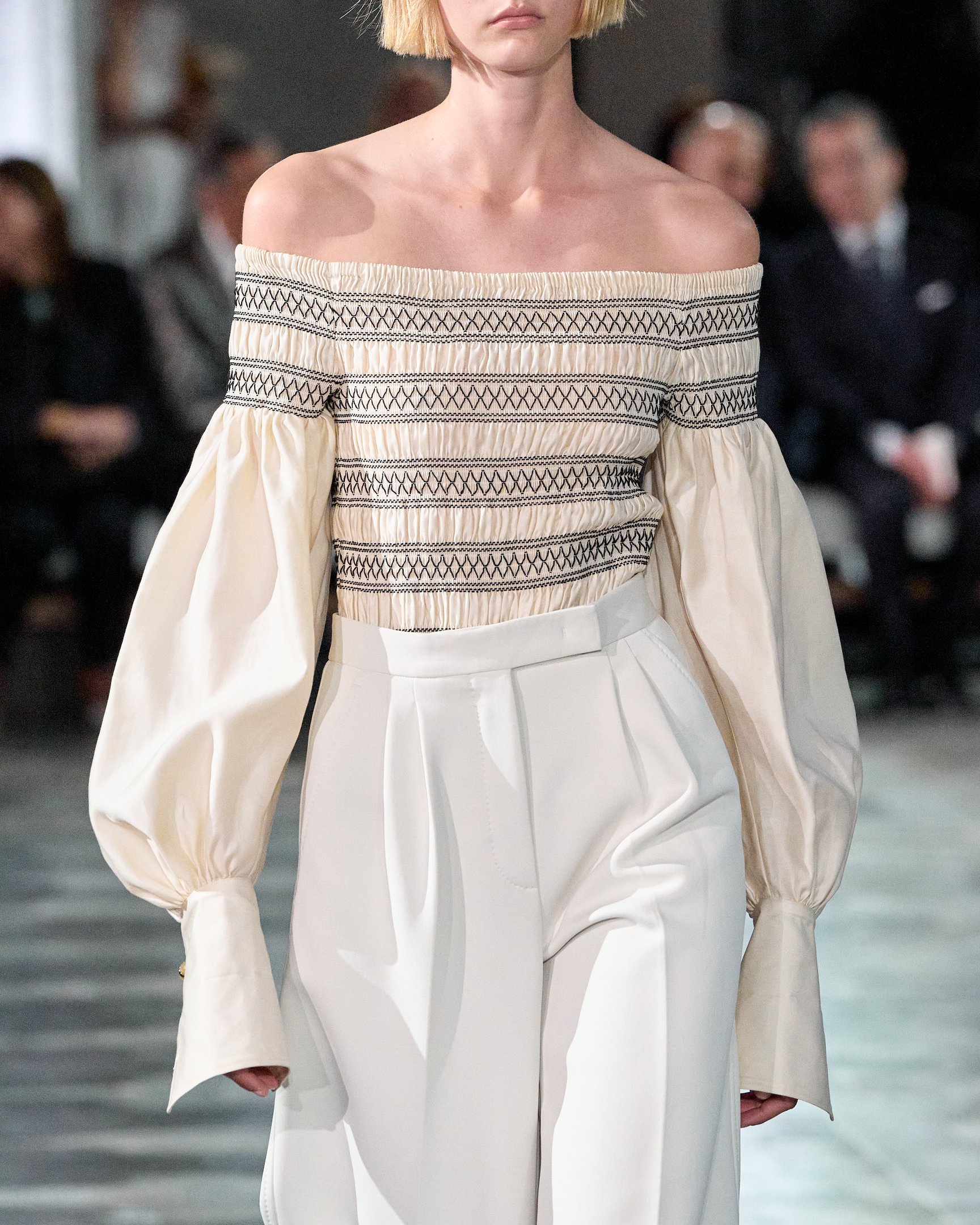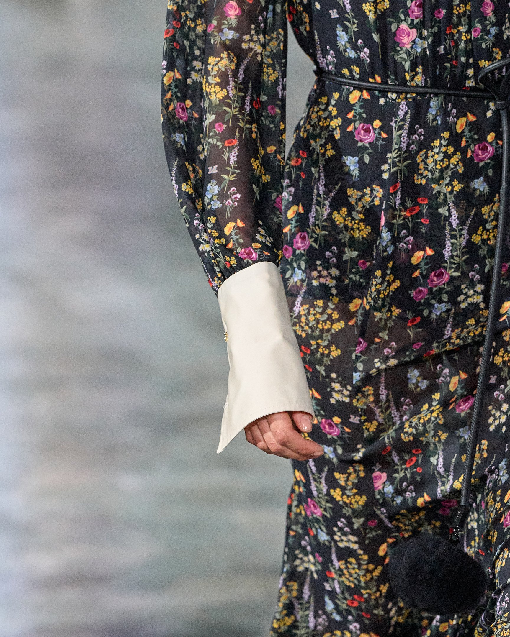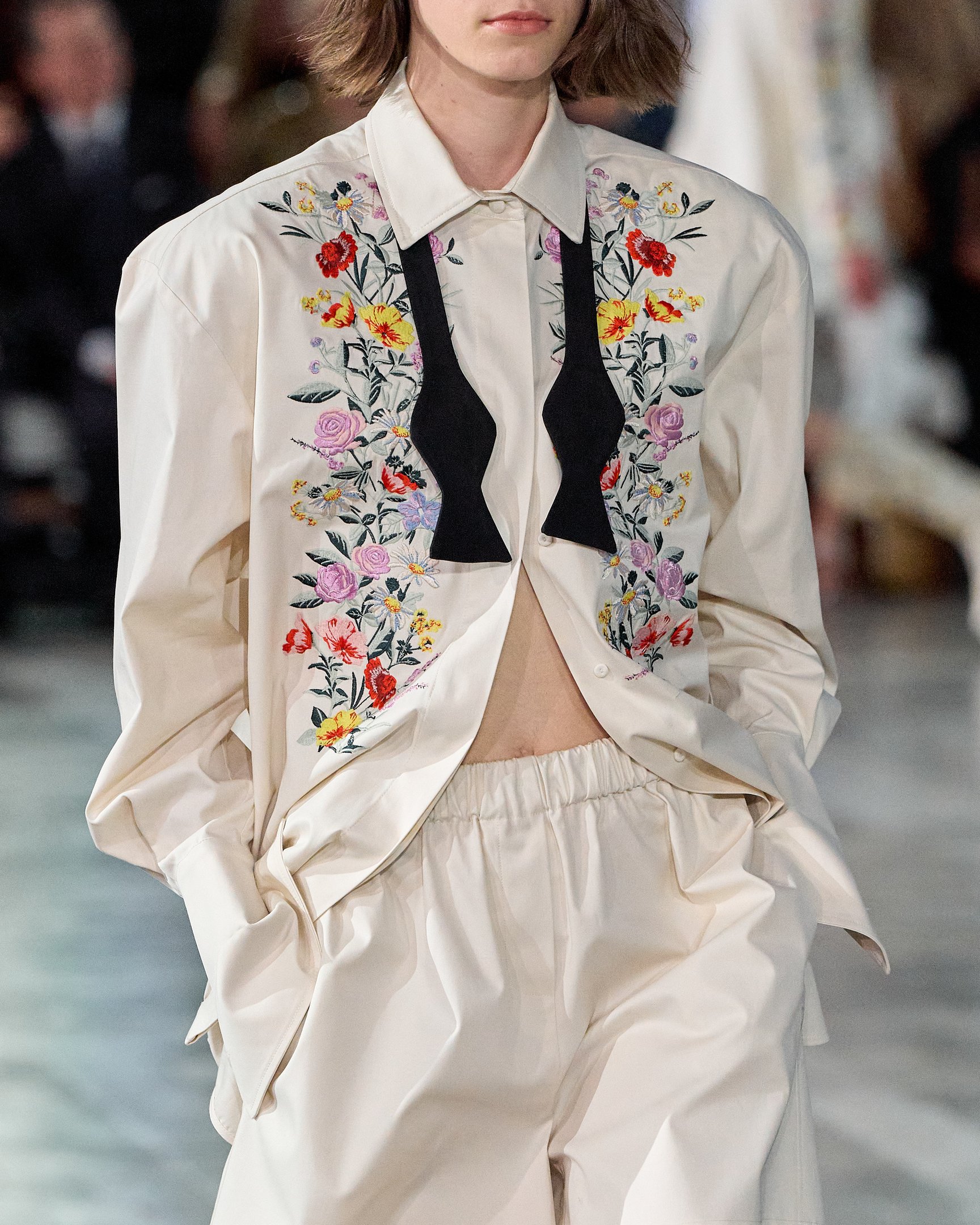 しかし、古典的なフォークロアスタイルに陥らず、リアルクローズとして着こなせるのはシンプルなシューズ&バッグを取り入れたスタイリングのおかげ。モノトーンのグラフィックやロングカフスなどもアクセントとなり、都会的なルックに落とし込まれた。