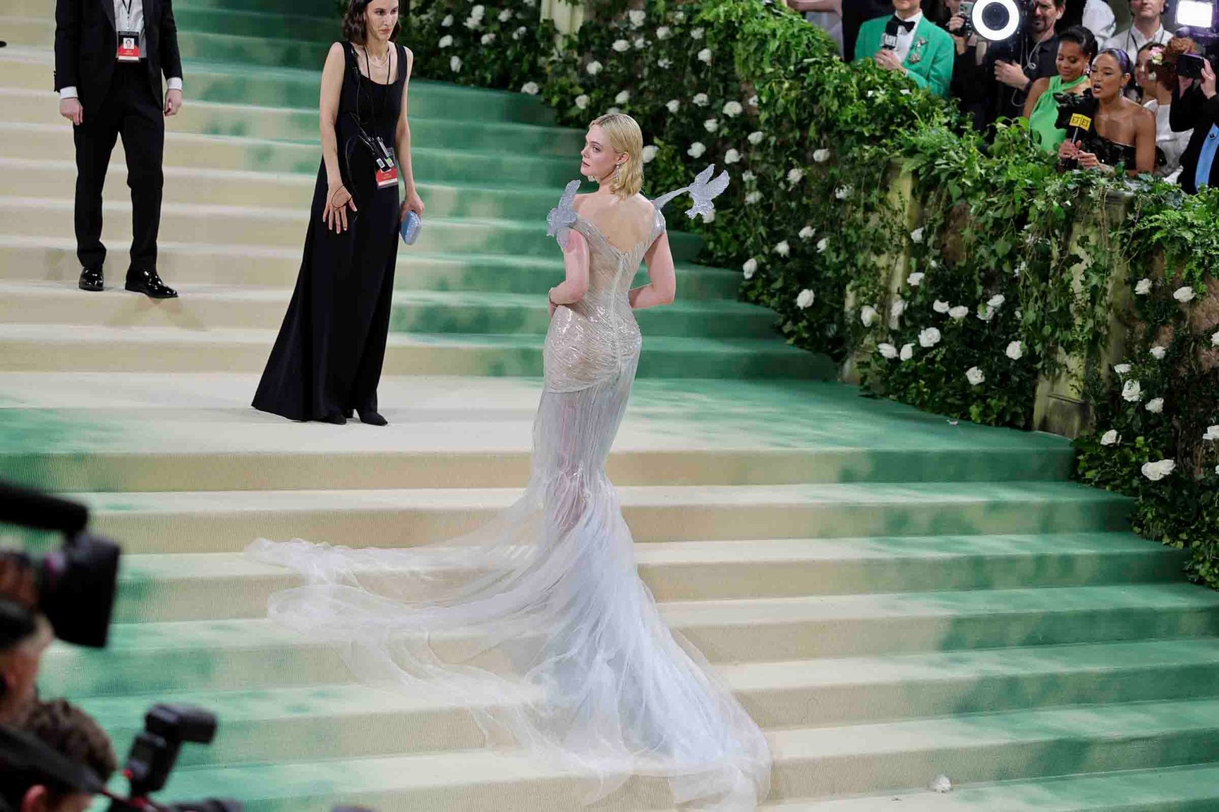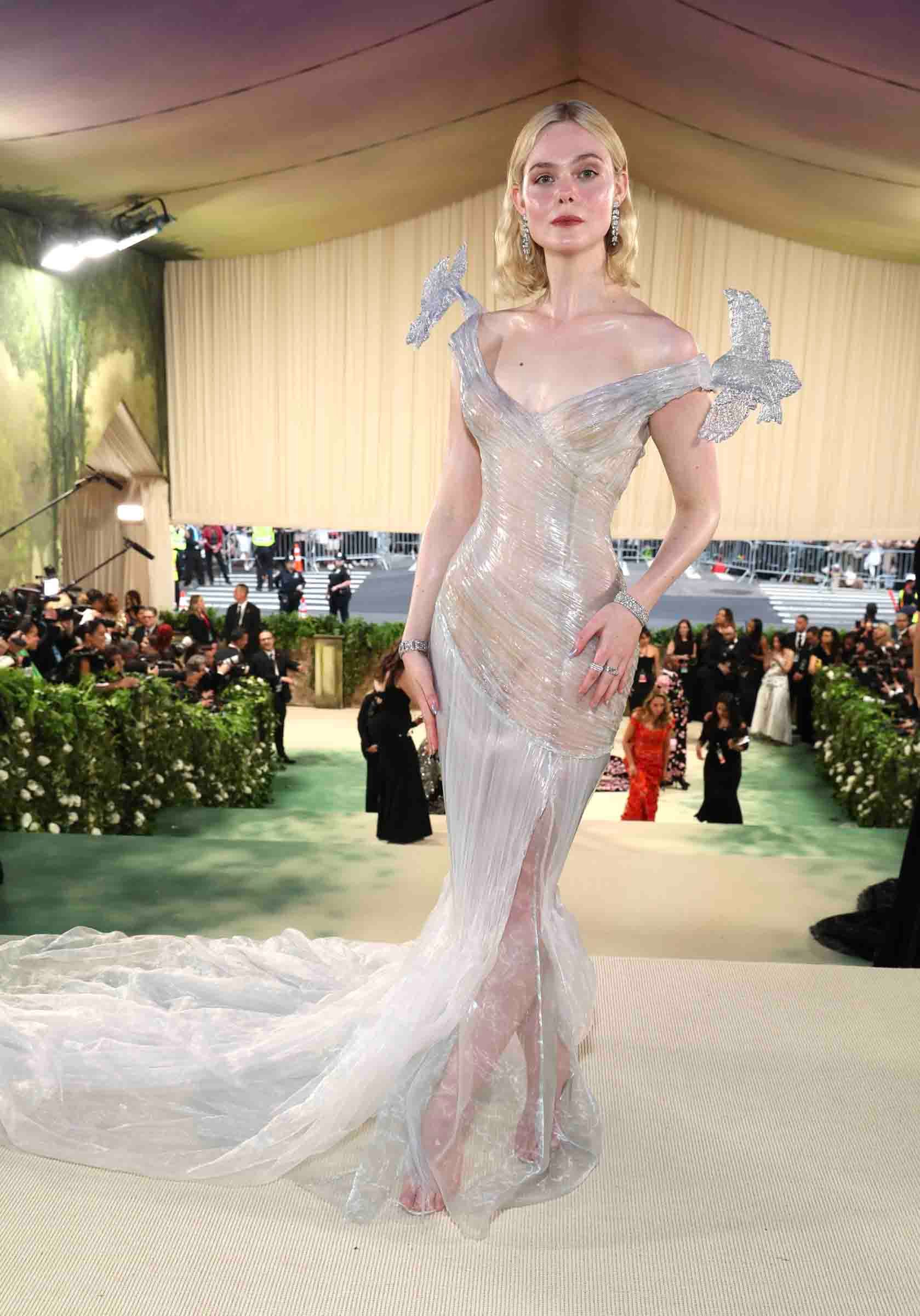 エル・ファニング(Elle Fanning)は、自身が主演を務めた映画「眠れる森の美女」を再現するような「バルマン(BALMAIN)」のドレスを纏いました。だまし絵のようなガラス効果を出すために作られた4層の樹脂により、手作業で覆われたオーガンザが美しく光ります。ショルダー部分には、グレーブルーの樹脂で造形された2羽の鳥が装飾されています。