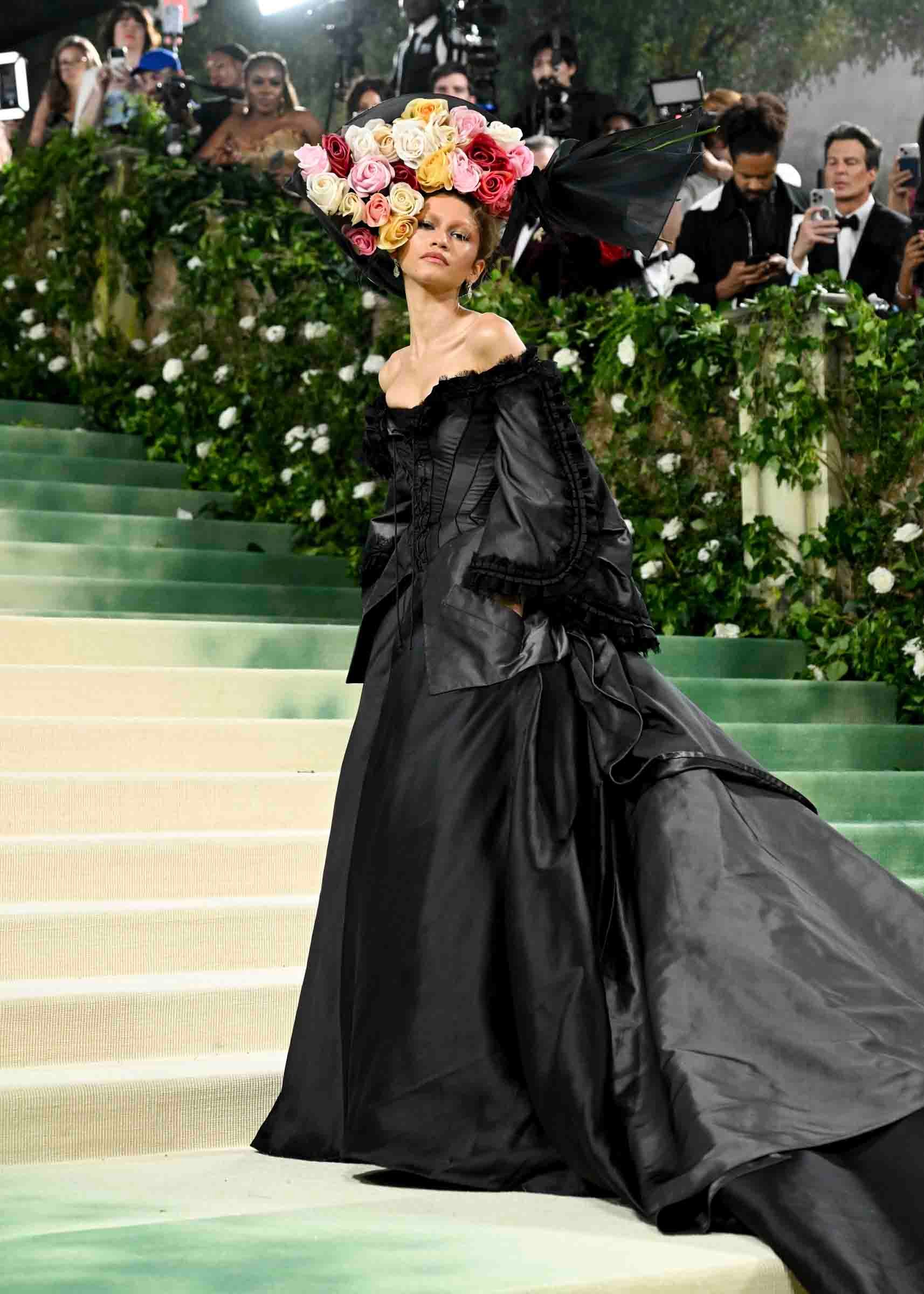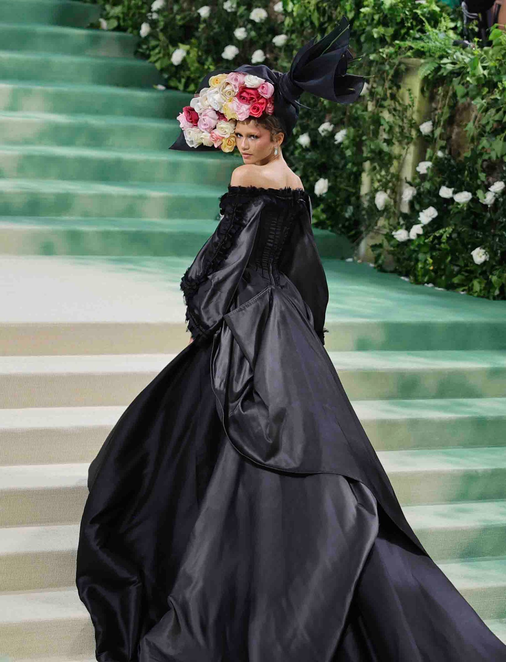 共同ホストを務めるゼンデイヤ(Zendaya)は、ジョン・ガリアーノ(John Galliano)が特別に制作したオートクチュールを着用して来場。シルクサテンのコルセットにラメとオーガンザのバイアスカットドレスを組み合わせたルックは、アルミニウム素材と虹色のオーガンザを重ねたドレープとリボン、手描きのモチーフを手刺繍したコサージュが印象的です。ベールのような帽子は、スティーブン・ジョーンズ(Stephen Jones)、タビパンプスは、クリスチャン・ルブタン(Christian Louboutin)による特注品なのだとか。