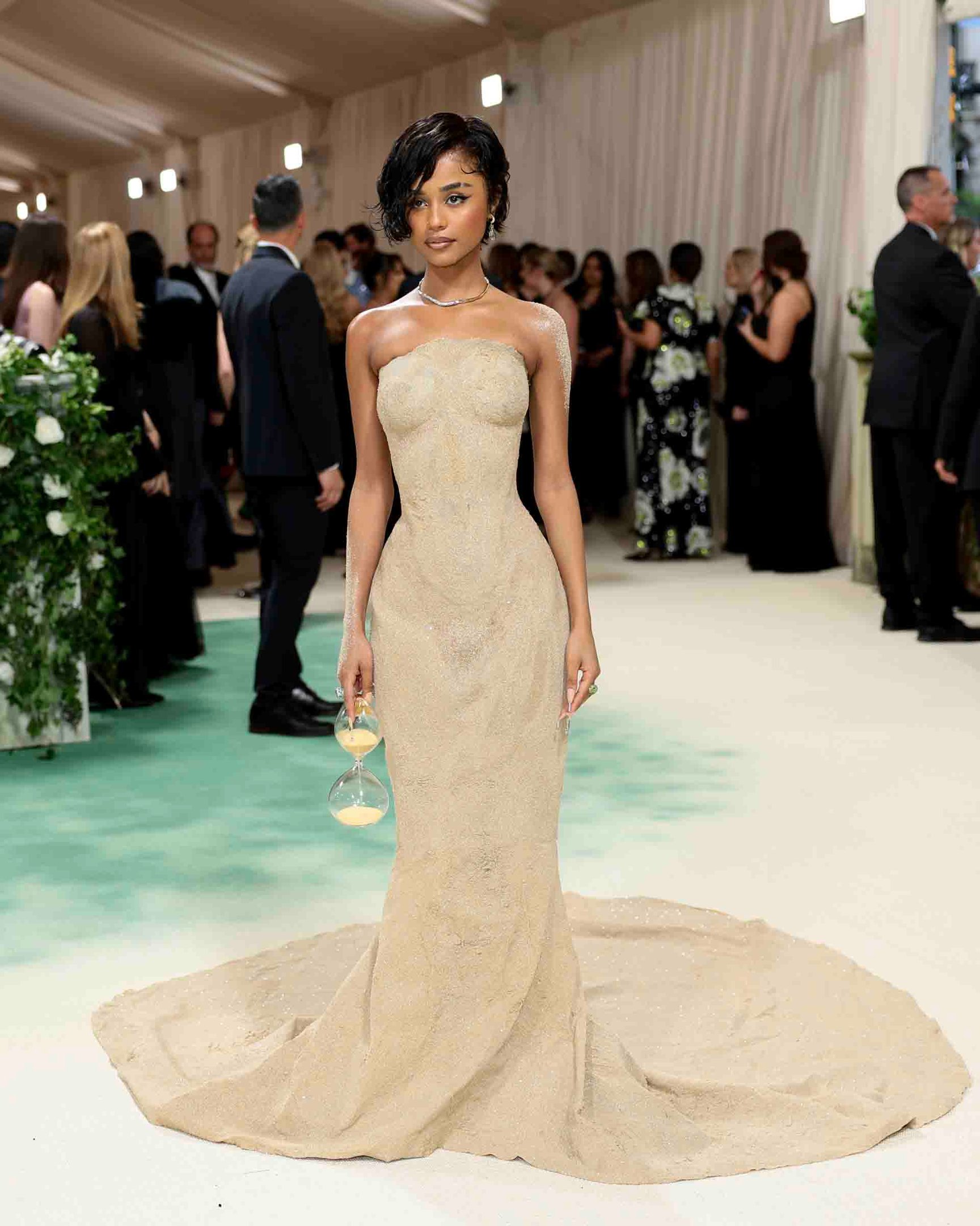 アーティストのタイラ(Tyla)は、「時の砂」をテーマに、砂時計をイメージしたバルマンのドレスを着用。ブランド独自のアップリケ技法であしらわれた砂やクリスタルのスタッズは、タイラ自身の身体を石膏で形どった生地にプレスして取り付けたのだそう。