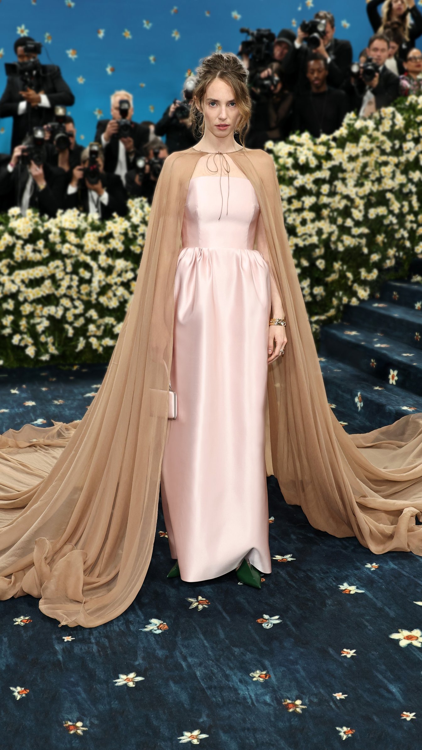 イーサン・ホーク(Ethan Hawke)とユマ・サーマン(Uma Thurman)の娘であり、ネットフリックス(Netflix)の人気シリーズ「ストレンジャー・シングス 未知の世界」で注目を集めたマヤ・ホーク(Maya Hawke)もメットガラに参加。ピーチピンクのガウンに、シアーなベージュのケープを重ねた柔らかくフェミニンな装いで、クラシックなムードを演出しました。一方、ストレンジャー・シングスで共演したサディ・シンクとのレッドカーペットでの再会がSNSでも話題に。