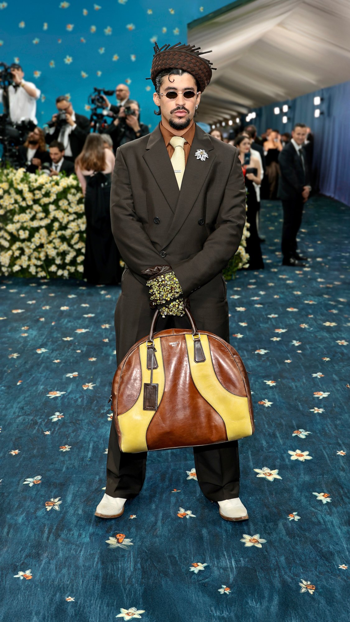 「プラダ(PRADA)」のチョコレートブラウンのダブルブレストスーツに、編み込みハット、ビジュー付きのグローブを合わせたルックで登場したのはバッド・バニー(Bad Bunny)。編み込みハットはプエルトリコの農業労働者が伝統的に着用する「パヴァ帽」が着想源で、文化的ルーツへの敬意を表し、モダンにアップデートしたものだそう。