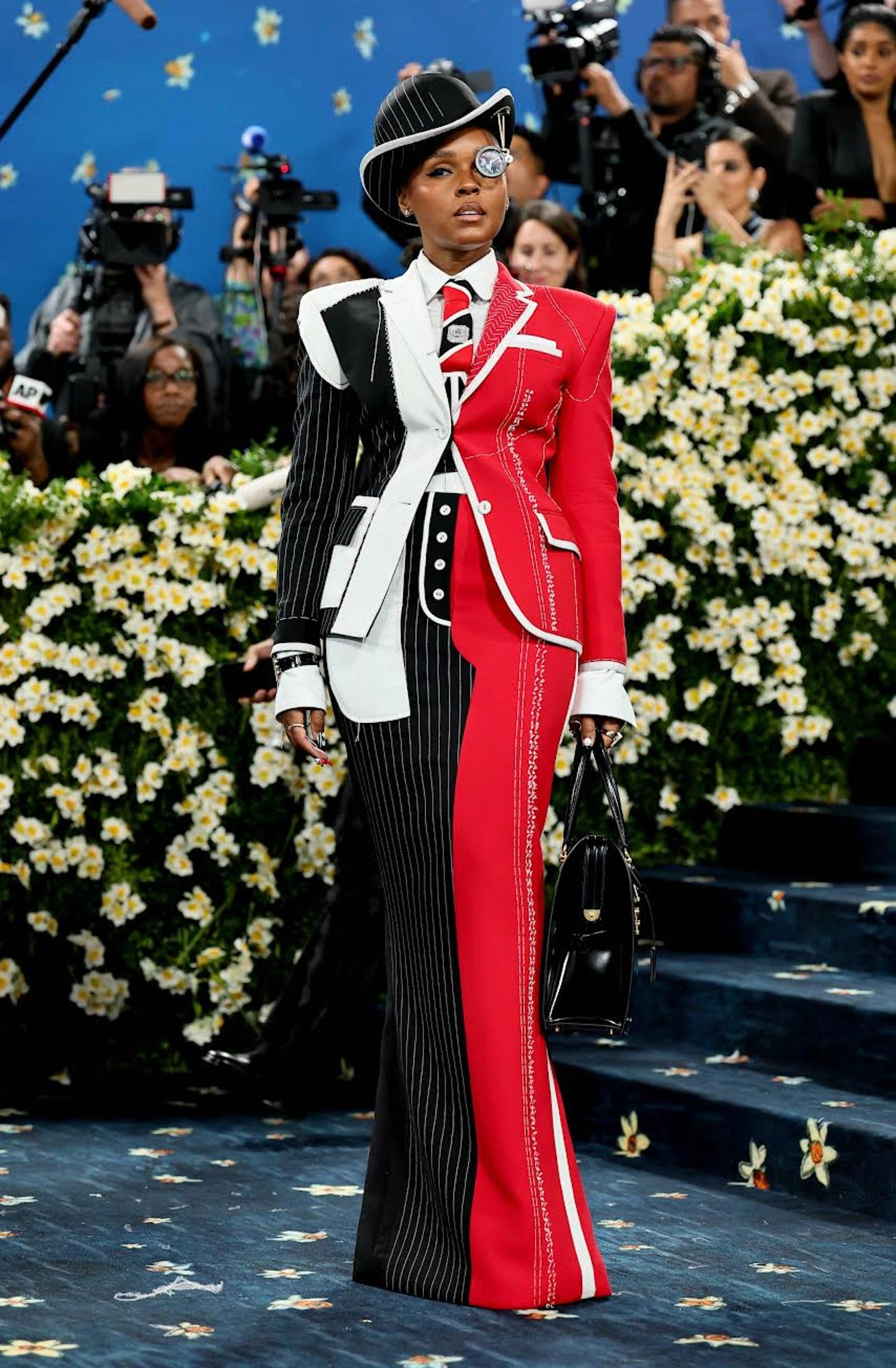 「トム ブラウン(THOM BROWNE)」の特注“だまし絵”スーツケープで登場したジャネール・モネイ(Janelle Monae)。ケープは、半身が白ステッチ入りのブラックモヘア、もう半身がピンストライプ刺繍のレッドダッチェスシルクという左右非対称の仕立てで、アウトラインにはグログランのリボン刺繍があしらわれています。特徴的なのは、ショルダーパッドや仮縫いステッチを敢えて露出させ、テーラリングの裏側までをも可視化するデザイン。まさにテーマである「あなただけの仕立て(Tailoring Black Style)」になっています。