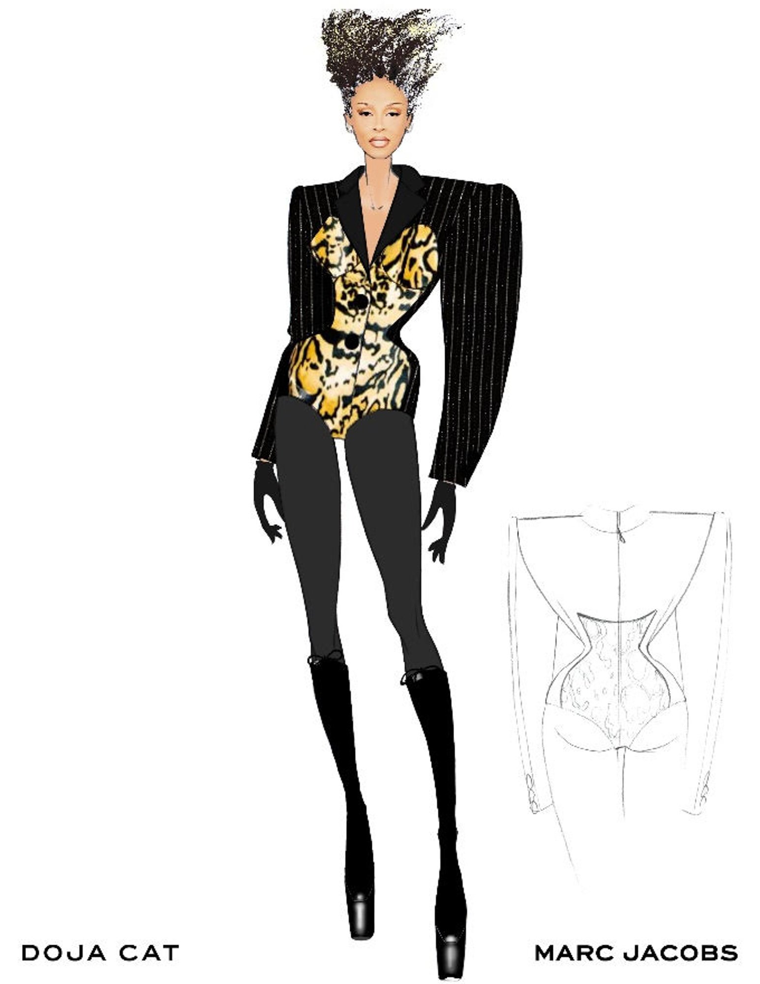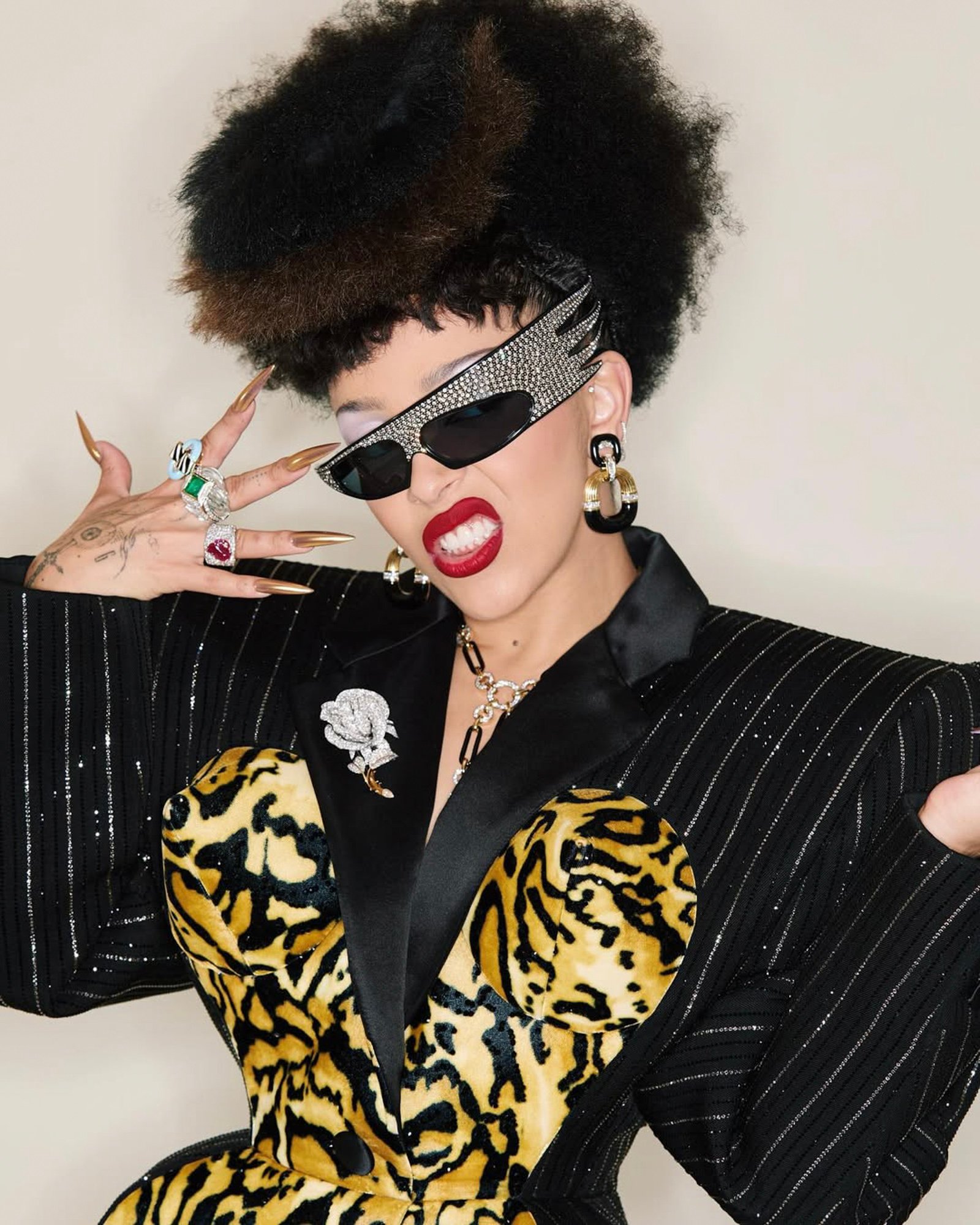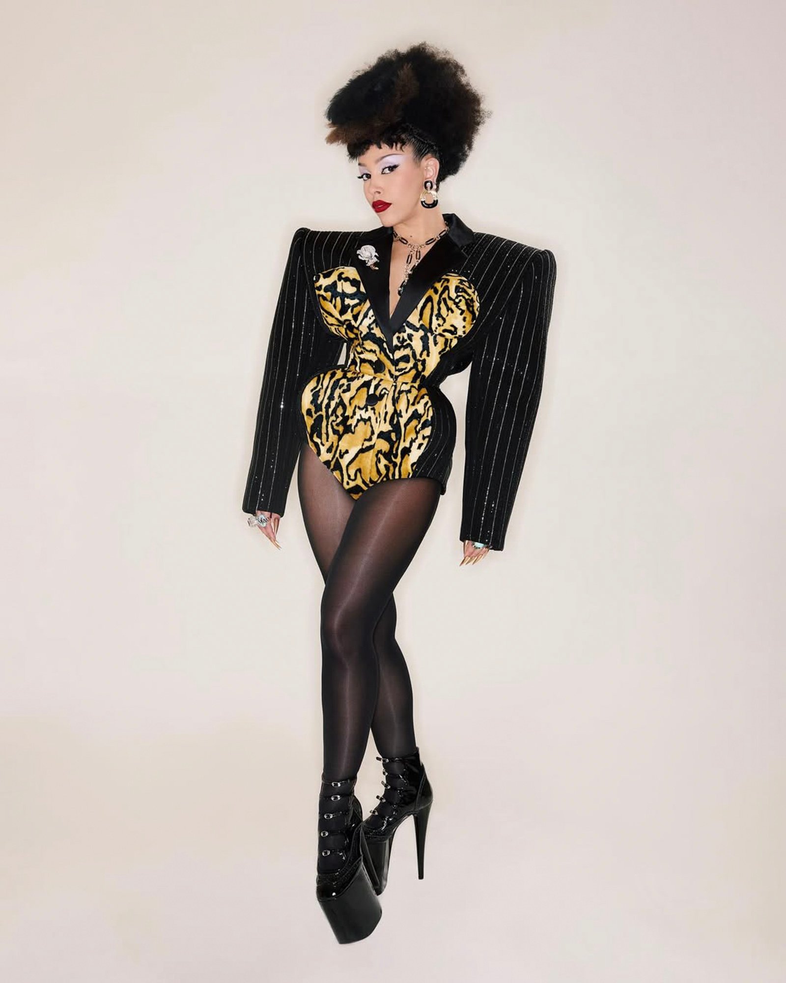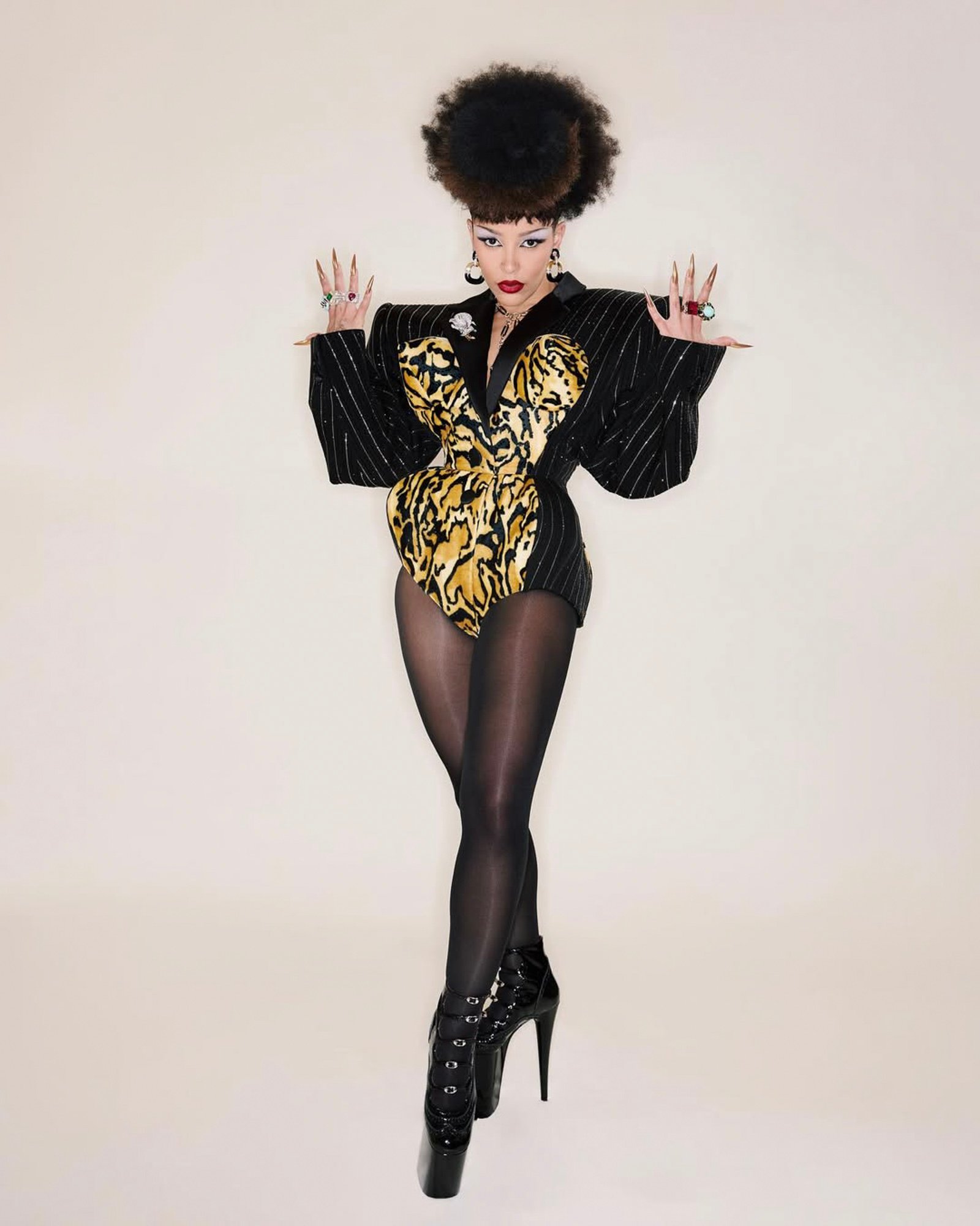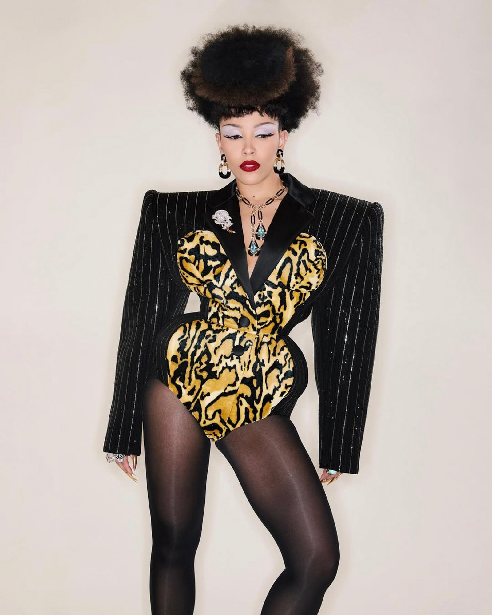 スワロフスキークリスタル刺繍がきらめくブレイザーボディスーツで一際輝いていたドージャ・キャット(Doja Cat)。体から大きく飛び出したパワーショルダーにアンクルブーツを合わせることで、抽象的なダンディズムを再解釈したスタイルに。