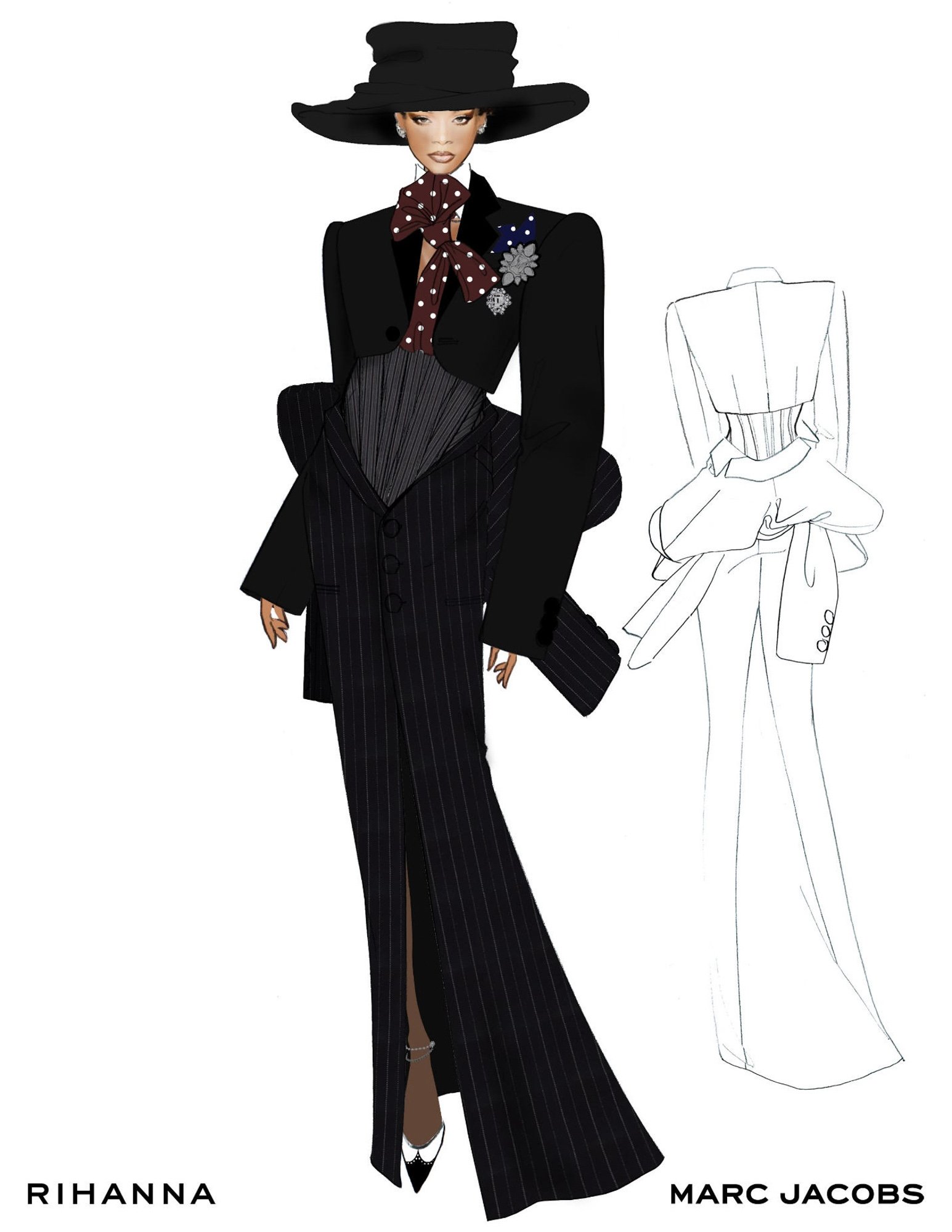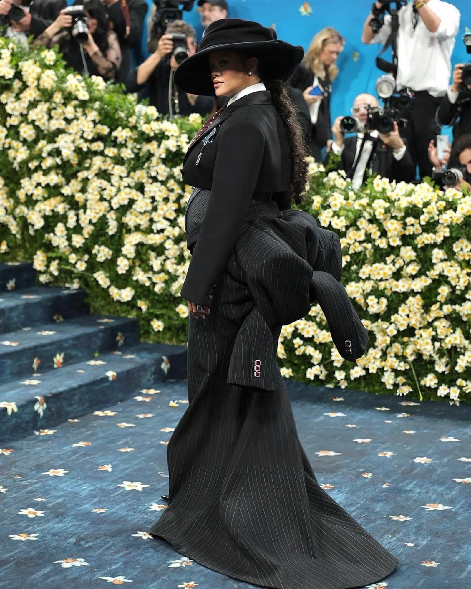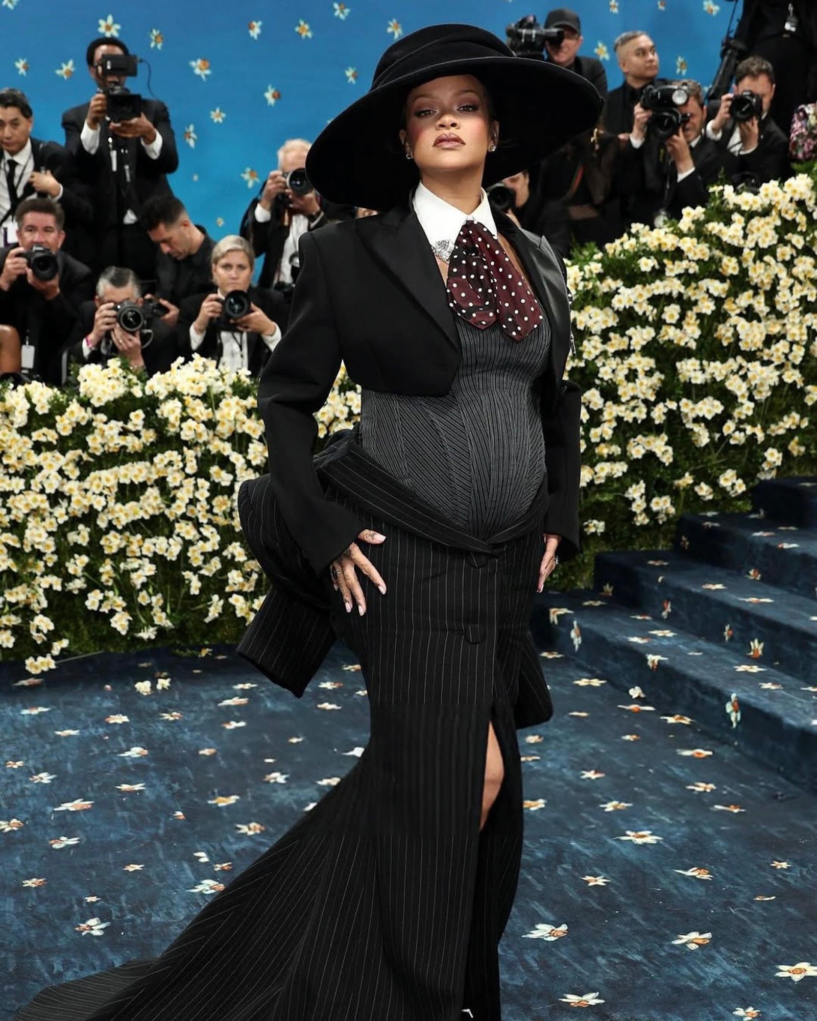 「マーク ジェイコブス(MARC JACOBS)」によるカスタムルックで登場したリアーナ(Rihanna)は、メットガラの会場で第3子妊娠を発表し、大きな話題になりました。ショート丈のスペンサージャケットに、ストライプのビスチェボディスーツ、バッスルスカートを合わせたスタイリングは、クラシックな紳士服とモードなマタニティウェアを融合させた力強いルック。ハットは、奇才帽子デザイナー、ステファン・ジョーンズ(Stephen Jones)が手掛けました。