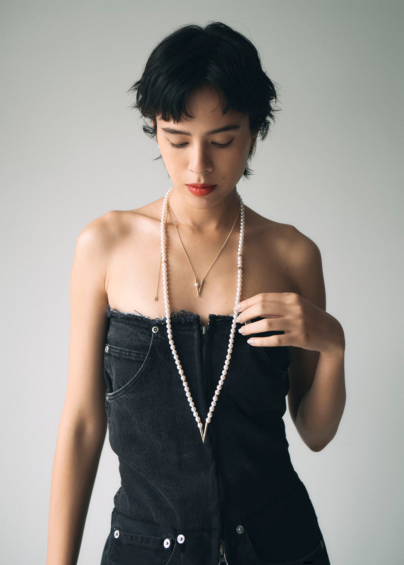 夏南さんは直感型、Senさんは論理型と、互いの異なる所を尊重し合いながら自然とバランスを保っている2人。「私がふわっと捉えていることを、彼はロジカルに捉えて表現したり、オーガナイズしたりしてくれます。そういうところは頼りになりますね」。しかし撮影のときはそれが逆転するという。「僕はカメラの前では勘で動いています。こういう見せ方が綺麗だな、というのが感覚で分かるというか」と言うSenさんに対して「私はけっこう論理的かも。今日の撮影も、ジュエリーが綺麗に映る角度をずっと考えていました」。考え方や感覚が違う2人だからこそ、ポジティブな影響を与え合えるのかもしれない。身につけている「V Code」のジュエリーも、上品なパールと鋭い“V”のモチーフが生み出すコントラストが魅力だ。