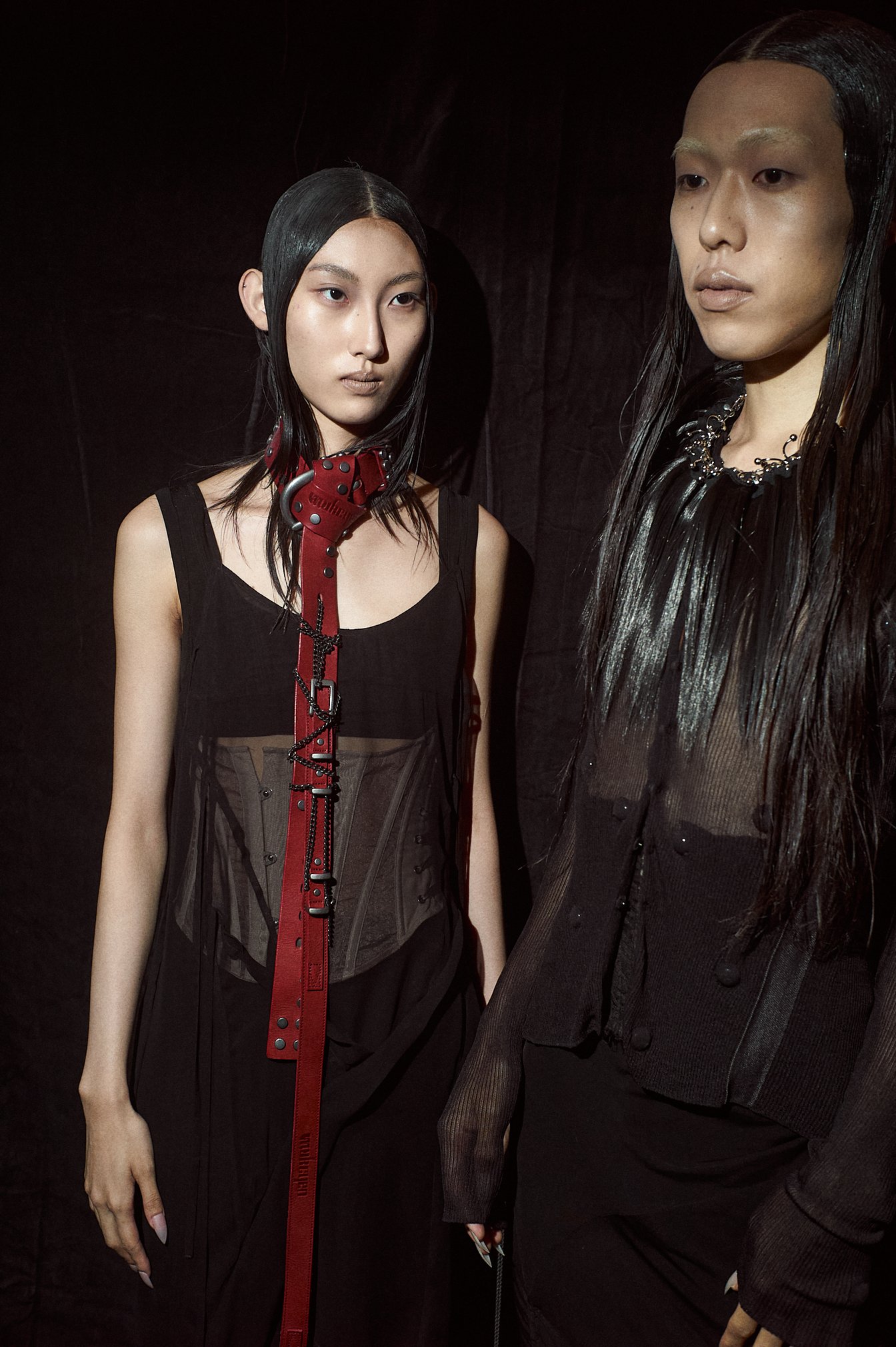 「ムッシャン」のデザイナーは、木村由佳と云う女性である。彼女は、セクシュアリティーの境界に挑戦する主題を掲げているわけではない。伝統的な下着やコルセットも、彼女の手に掛かると外出着になる。男のデザイナーであれば、女性の体型を強調することに重点を置く傾向が強くなるところだが、彼女には、常に女性のプロポーションを気にしない節がある。それに彼女は、シャープな仕立てと、ボリュームを持たせたカタチとを両立させることが出来るデザイナーで、寧ろそれを得意としているようだ。但し、今は完璧ではないけれどね。