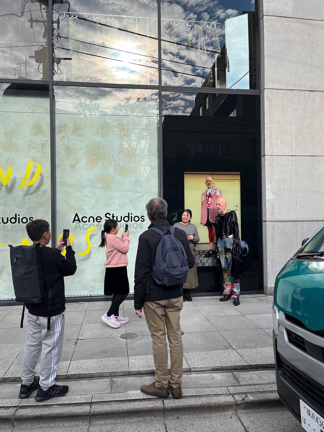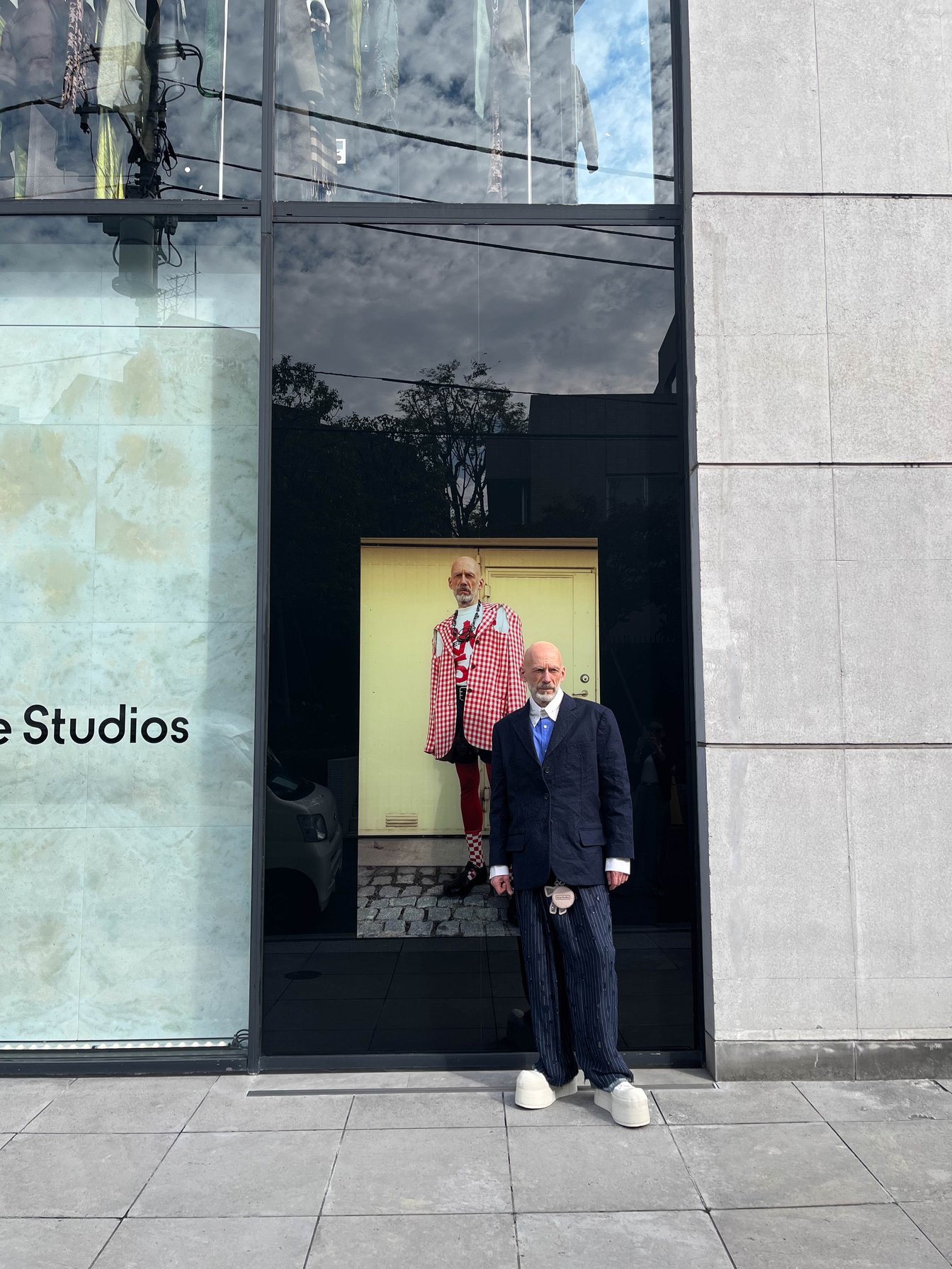 旗艦店であるアクネ ストゥディオズ アオヤマのウィンドウには、期間限定でマグヌスのビジュアルが登場。アクネ ストゥディオズのネイビーのセットアップに厚底のホワイトスニーカーを合わせて、ディスプレイの前で記念撮影を行った。マグヌスの手にかかれば、スーツスタイルも一癖ある装いに。