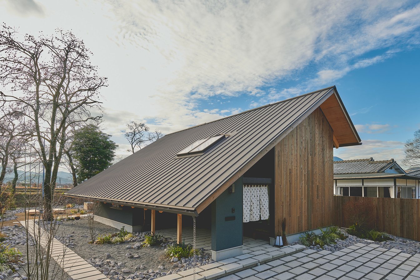 里山の景観に溶け込む木材を基調としながらも、特徴的なのは外観。片側が一階の高さまで下がった大屋根が印象を残す。