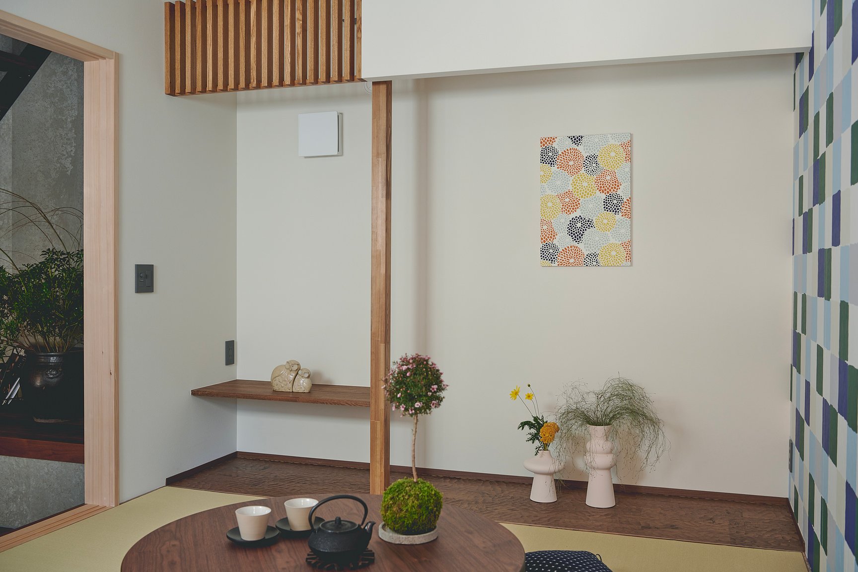 のれんをくぐった先の"通り庭"が土間へと続いていて、玄関から入った右手には"離れ"をイメージした和室。床の間や縁側など、昔ながらの和室を思い起こさせながらも、ポップな壁紙がアクセントとなっている。