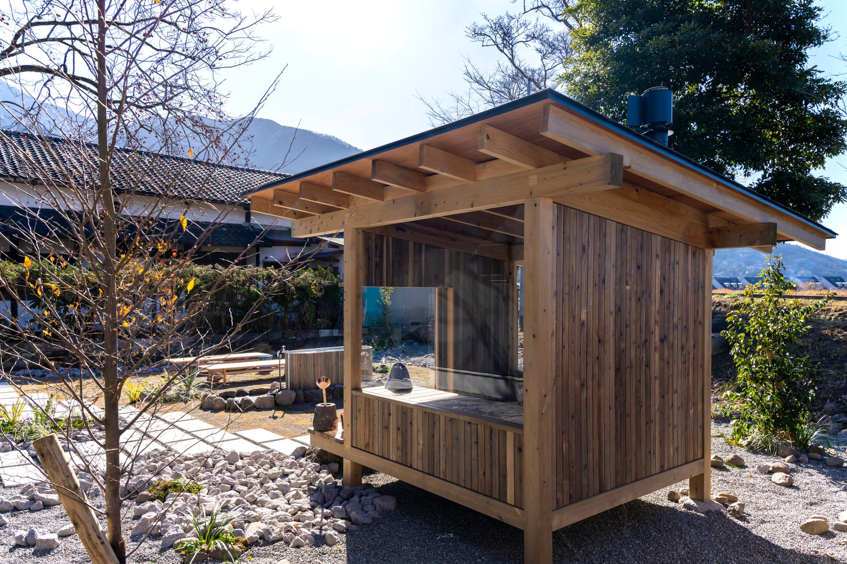 土手に面した庭に"離れ"のように設置された小屋は、谷尻誠が参画している「DAICHI」のサウナ。まるで茶室のような空間で、水風呂や外気浴ができるベンチも用意されている。