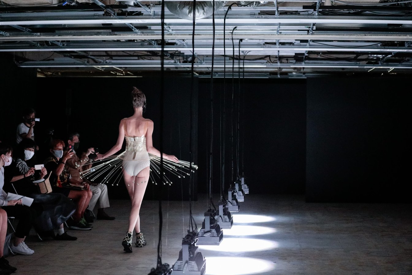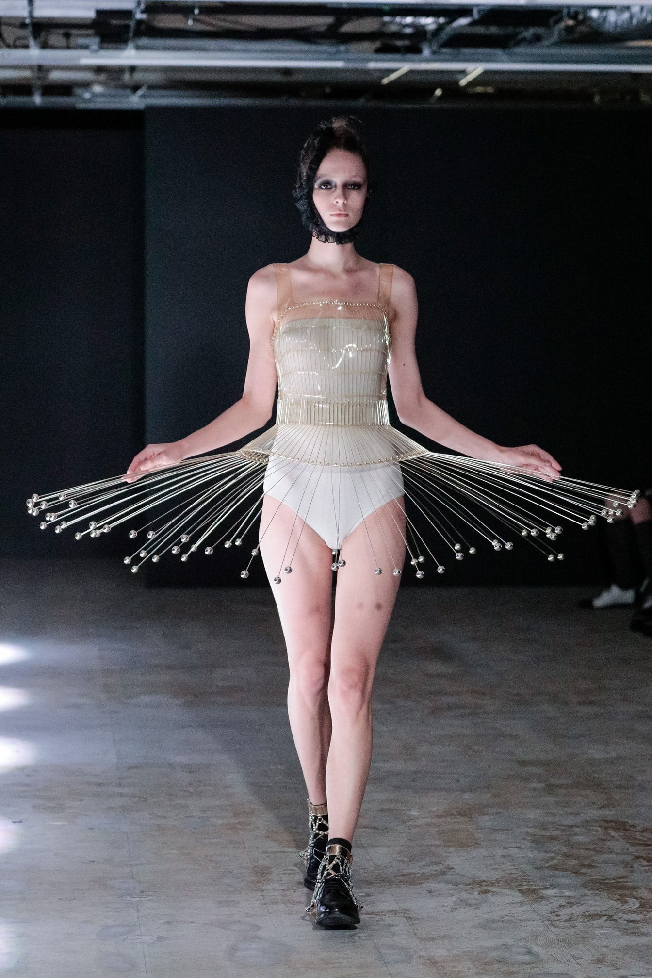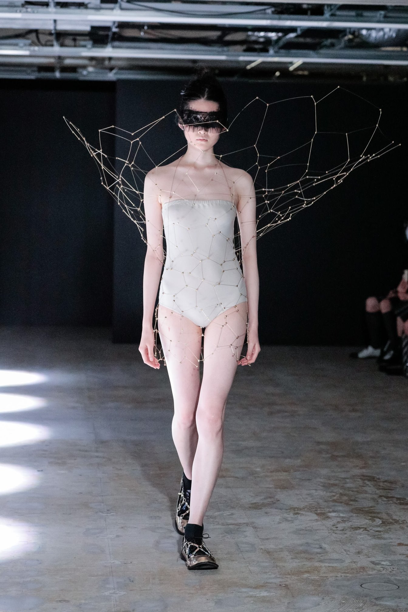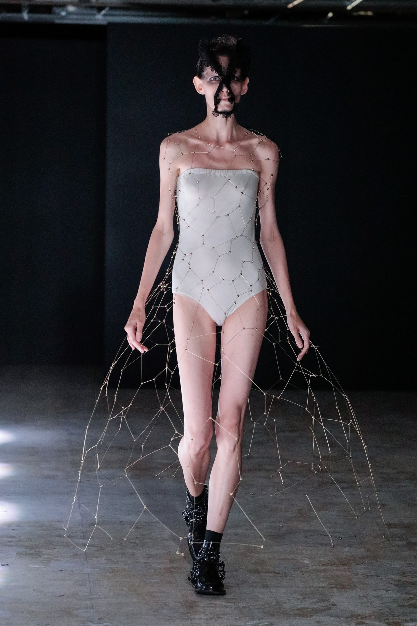 前シーズンに引き続き、金属を使ったウエアやアクセサリーにも取り組んでいる。終盤には、極細の骨組みだけで仕立てられた究極にミニマルなドレスが登場。「そこに布がなくても、線だけで存在感やエネルギーを生むことができるものを作りたかった」と二宮が語る通り、圧倒的な存在感を放っていた。